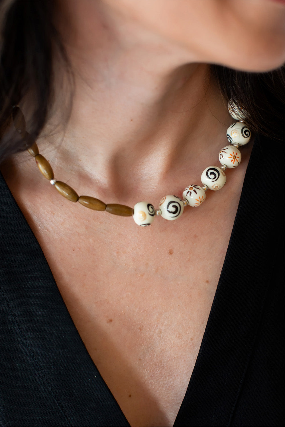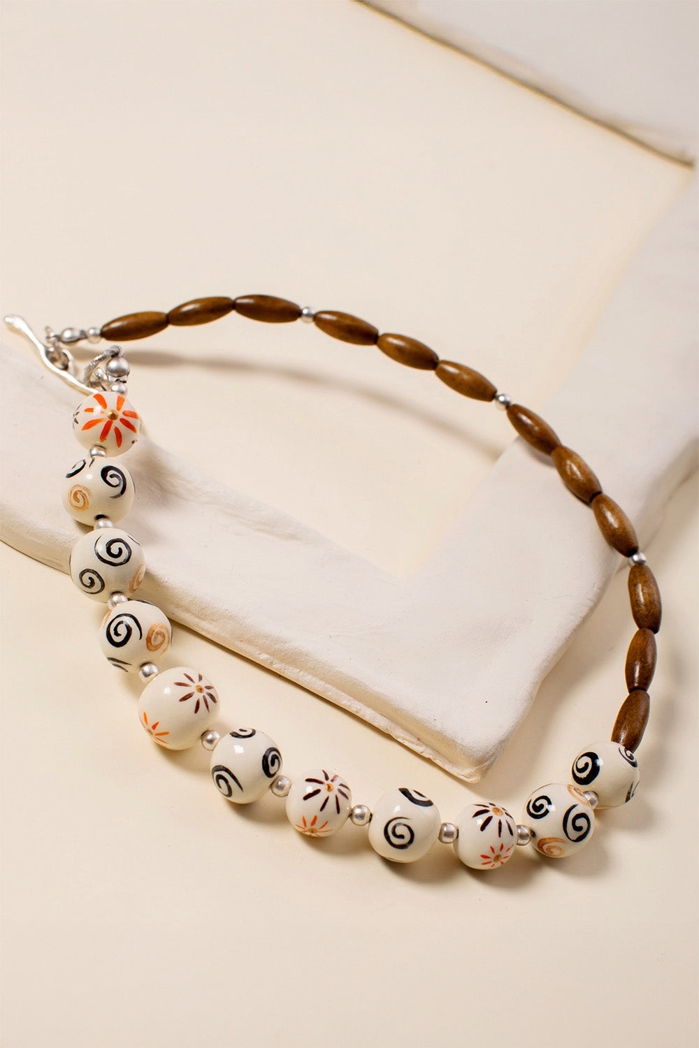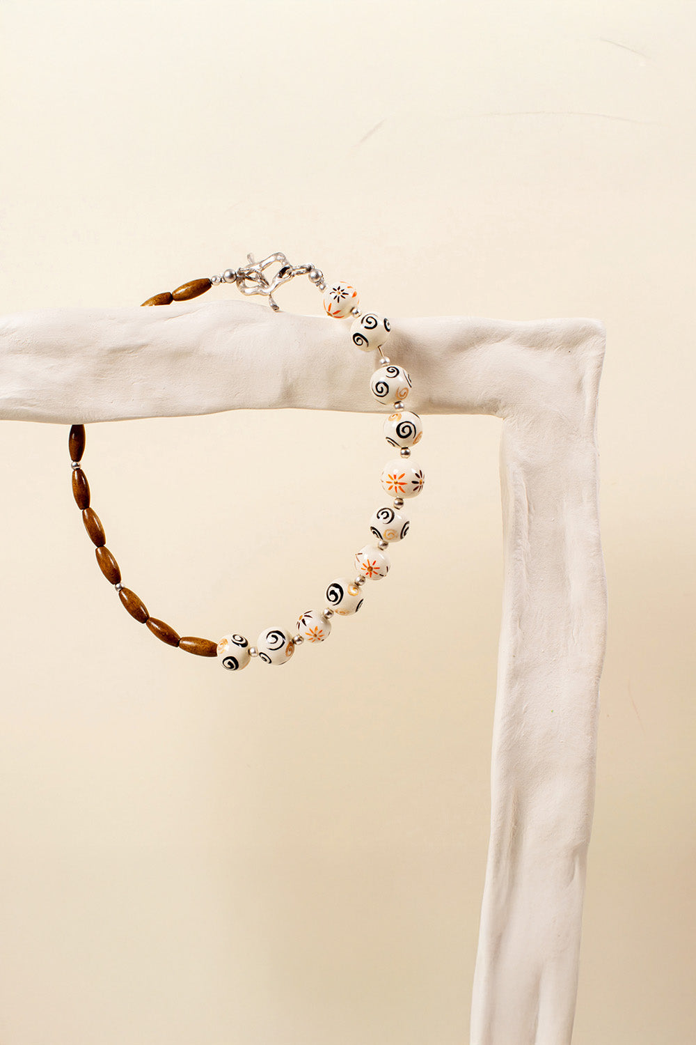 Top parçalar kilden elde şekillendirilmiştir, desenleri el boyamasıdır. Metal parçalar gümüş kaplama pirinç, arpacık parçalar ham ahşaptır.