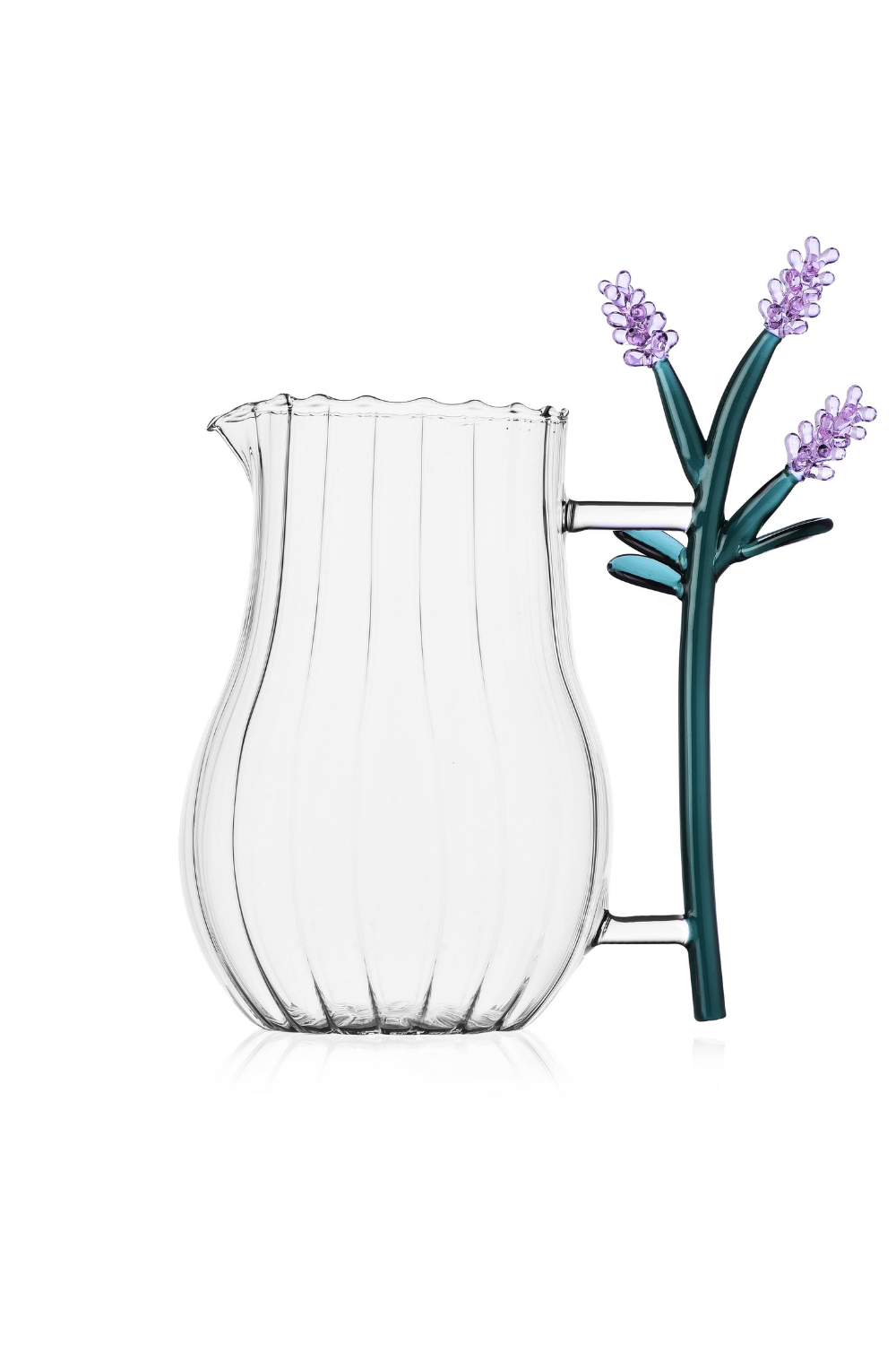 Botanica koleksiyonuna ait bu el yapımı borosilikat cam sürahi, lavanta çiçeği formunda tasarlanmış sap detayıyla doğadan ilham alan zarif bir tasarım sunar. Organik hatlara sahip gövdesi, hafif dalgalı ağzı ve mor lavanta detaylarıyla her sunumu estetik bir deneyime dönüştürür. Fonksiyonelliği sanatsal formla buluşturan bu sürahi, su ve soğuk içecek sunumları için ideal olduğu kadar masa dekorasyonuna da incelikli bir dokunuş katar. Sofralarına şiirsel bir atmosfer kazandırmak isteyenler için özgün bir seçimdir.