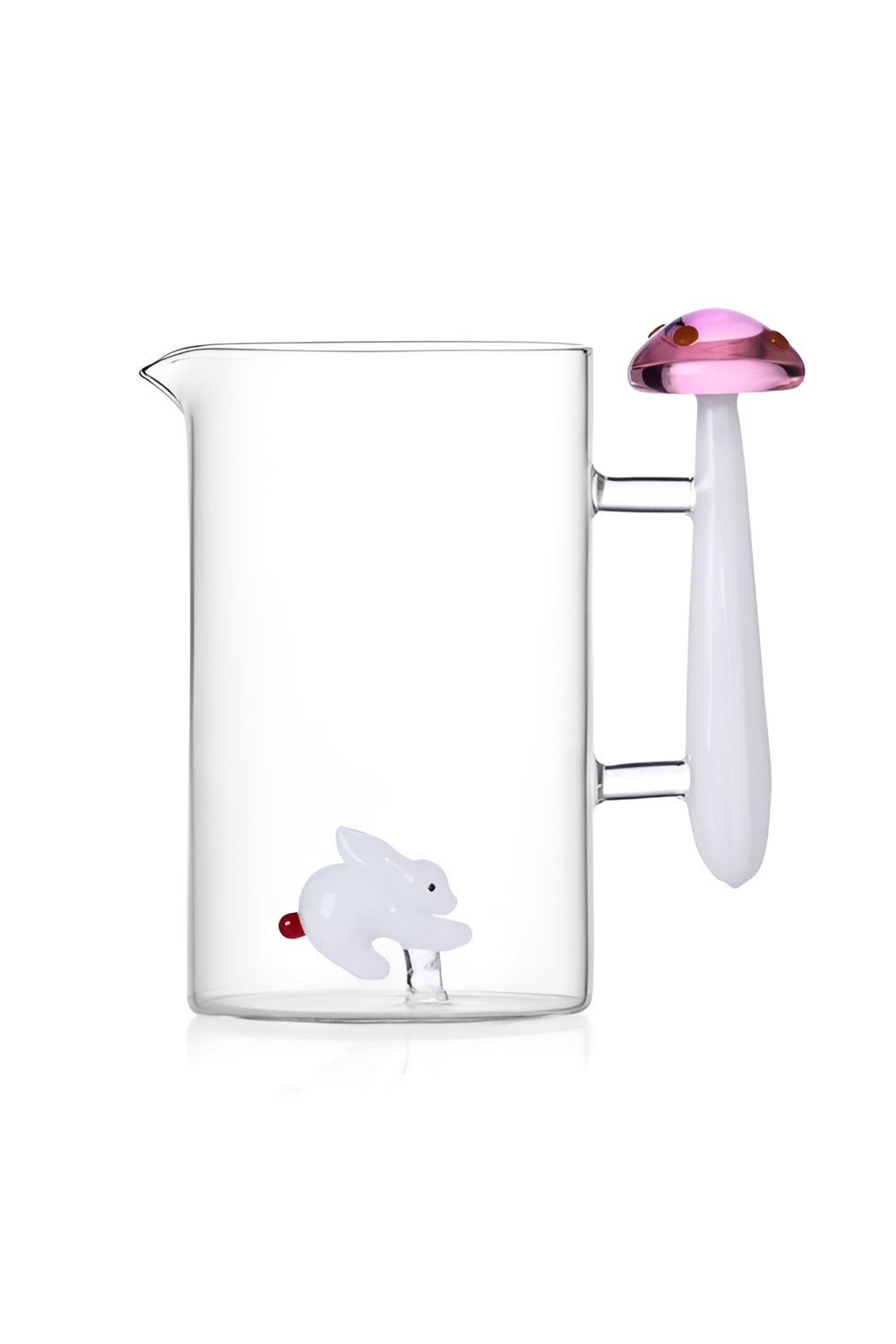 Alice koleksiyonundan beyaz tavşan figürlü ve pembe mantar kulplu cam sürahi.