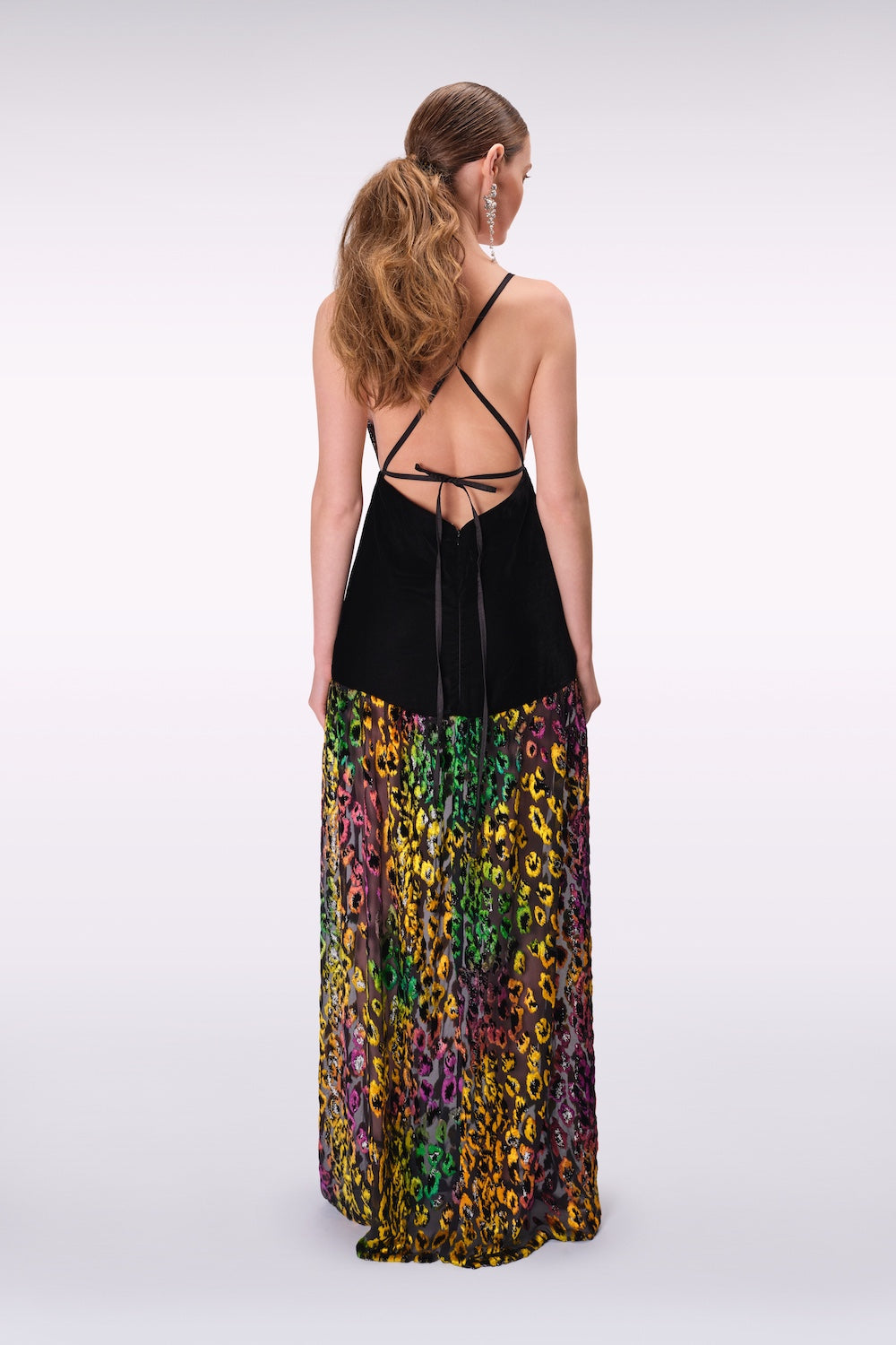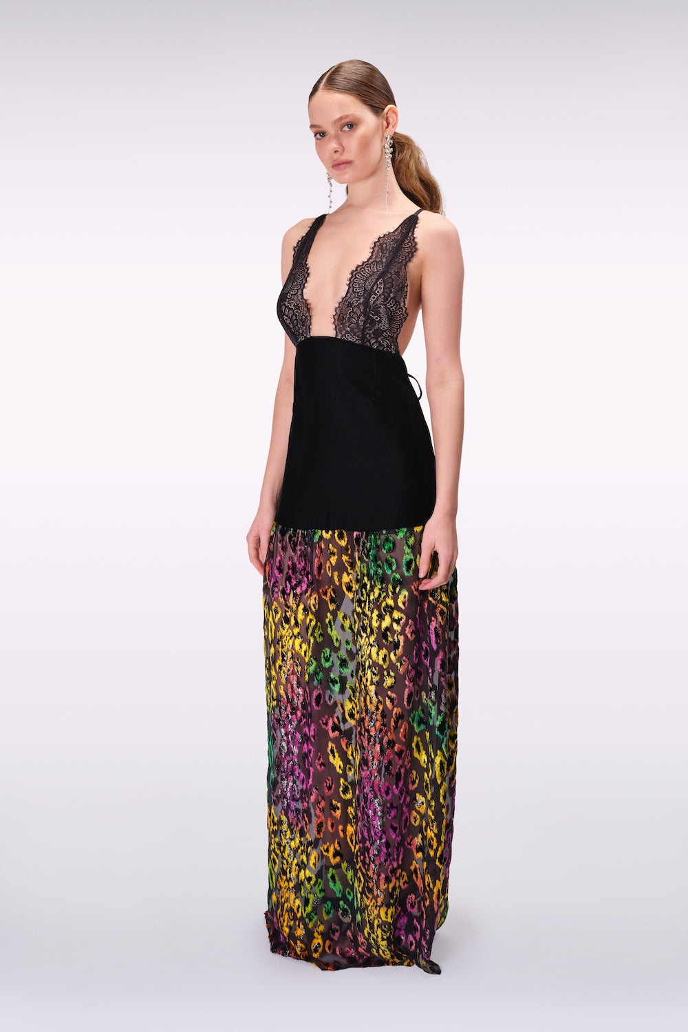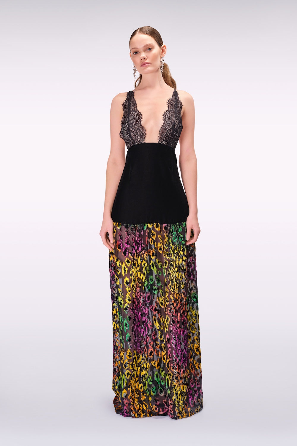 - Transparan simli iplik detaylı renkli ipek kadife etek