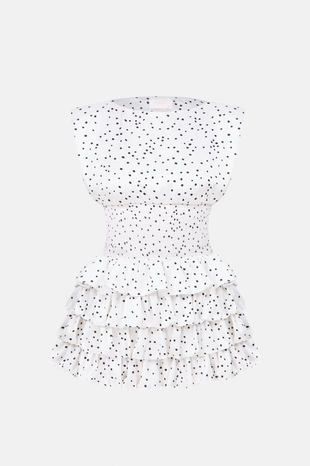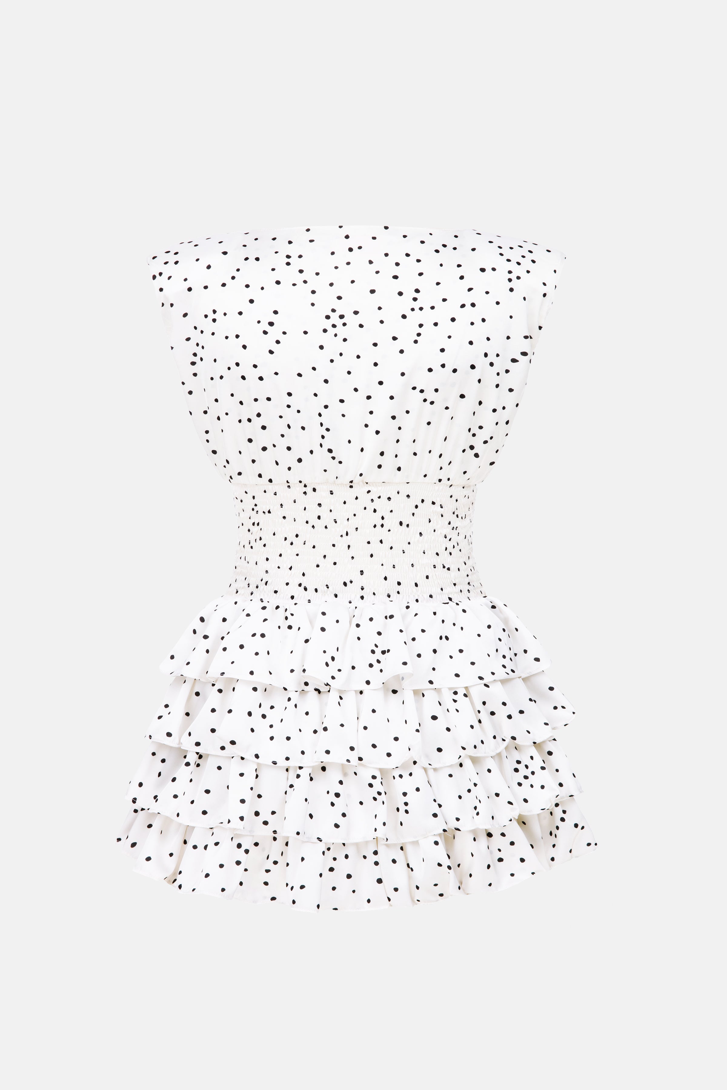 Zamansız puantiye deseniyle hareketlenen bu beyaz elbise, hem hafif dokusuyla hem de feminen siluetiyle günlük şıklığı zahmetsizce tamamlar. Akıcı formu sayesinde gün boyu konfor sunarken, sade ama dikkat çekici görünümüyle her stile kolayca uyum sağlar.