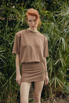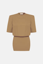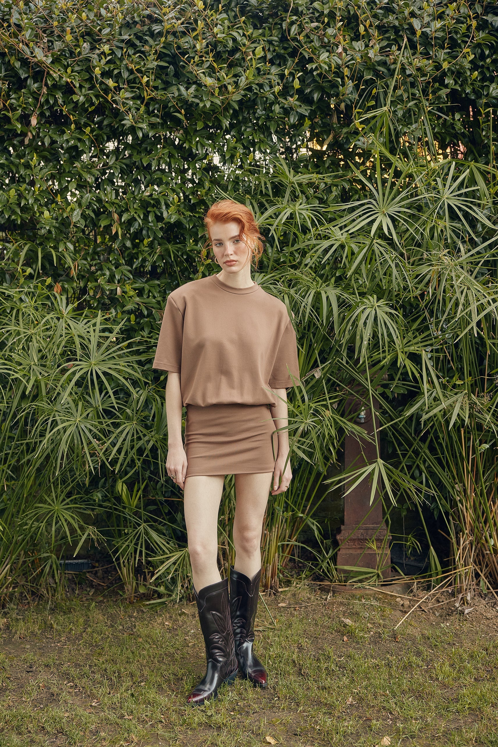 Omuzları vatkalı, belden büzgü ve fermuar detaylı mini etekli 'Miu' T-Shirt elbise konforundan vazgeçemeyen NAIA kızları için tasarlandı..