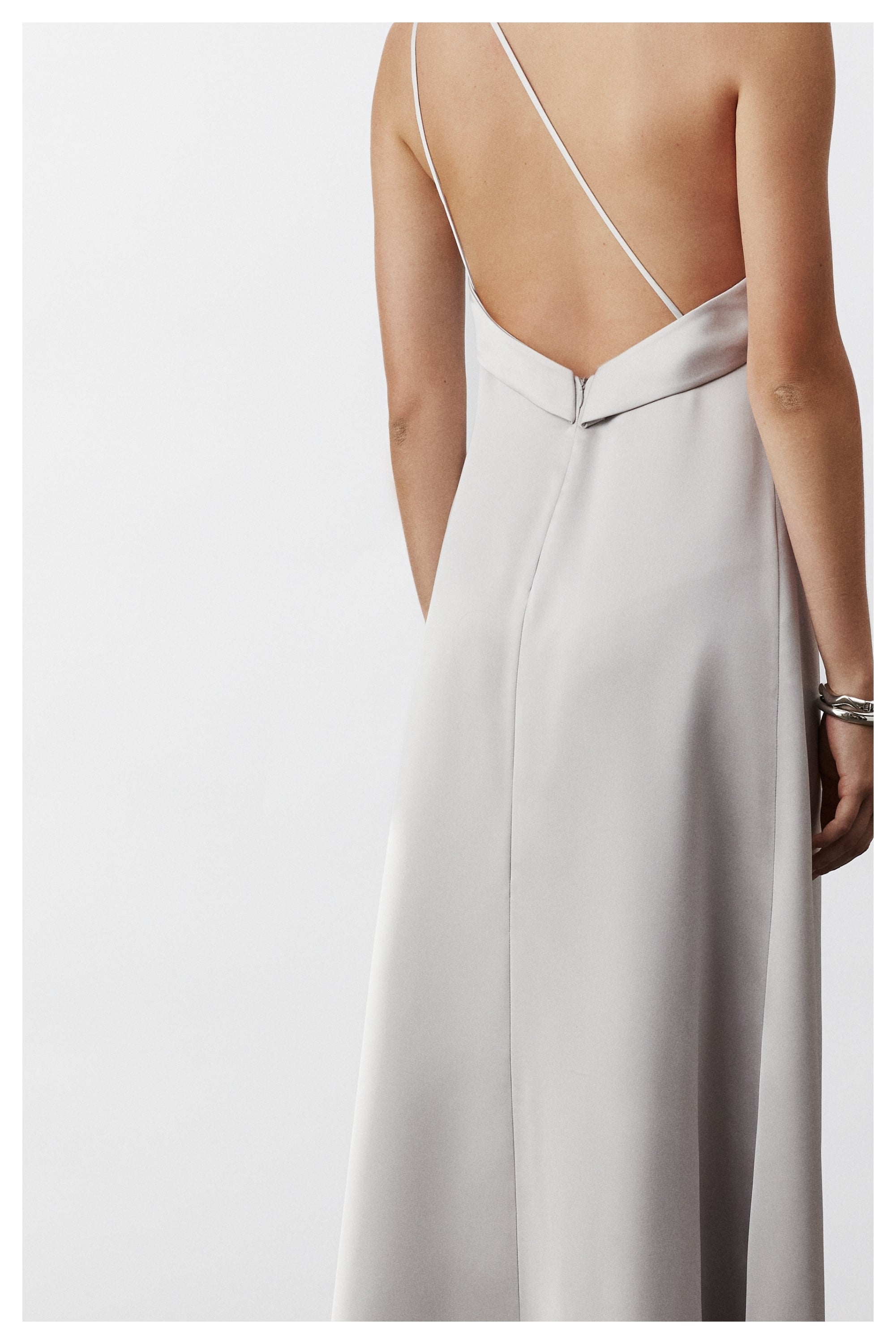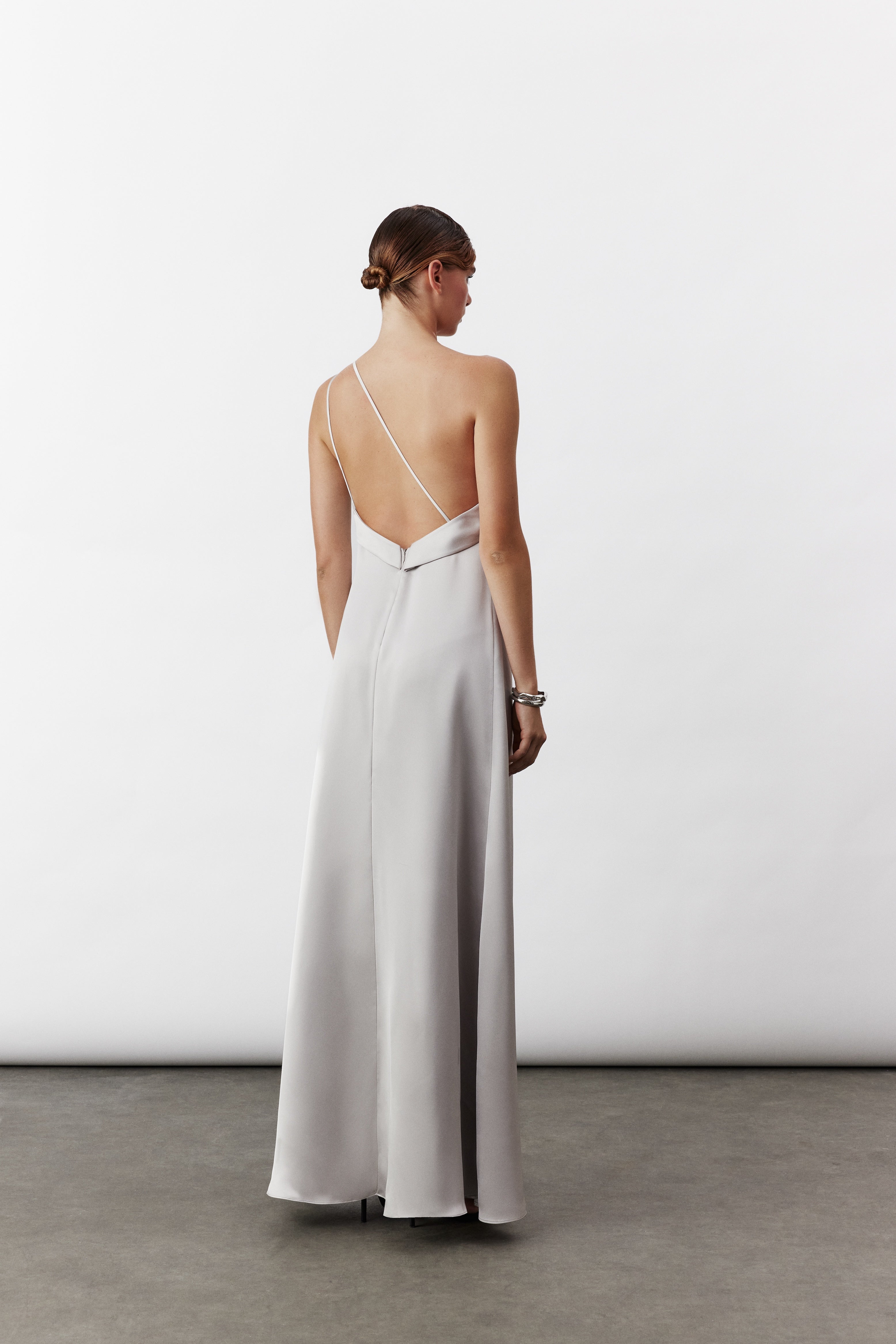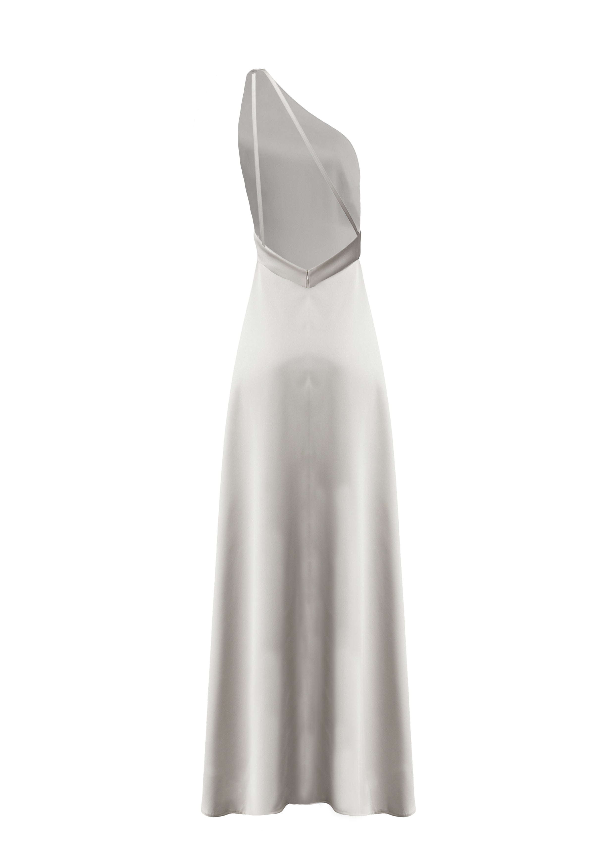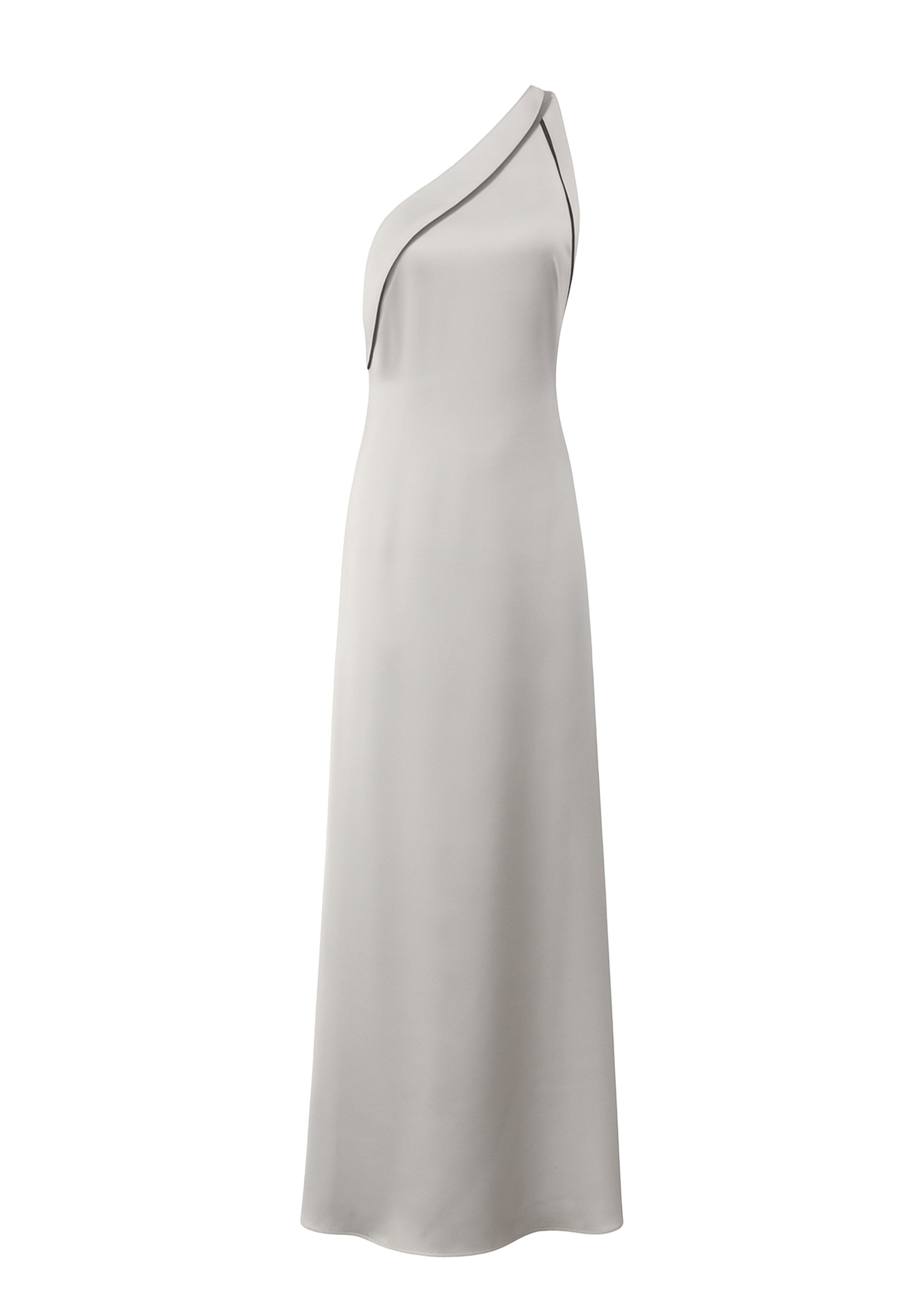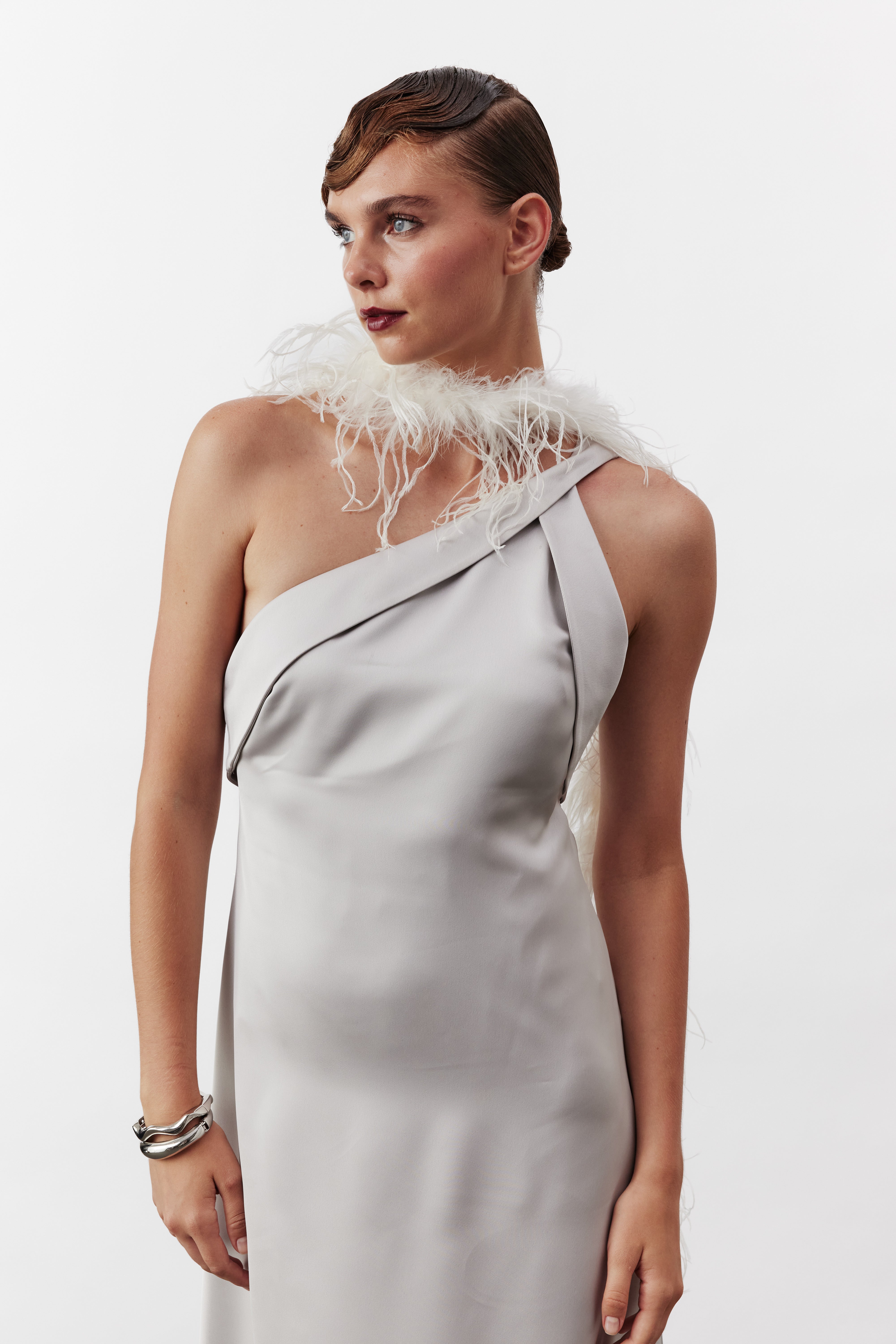Aimee Uzun Elbise, asimetrik yaka kesimi ve tek omuz tasarımıyla zamansız bir şıklık sunar. Ön kısımdan gelen çift askı detayı arkada belde birleşerek elbiseye özgün ve sofistike bir karakter kazandırır. Dökümlü saten kumaşı vücudu zarifçe sararken, astarlı yapısı konforlu bir kullanım sağlar. Akıcı silüetiyle hem davetlerde hem özel akşam etkinliklerinde öne çıkmak isteyenler için mükemmel bir tercihtir. Modern kesimiyle zarif detayları birleştiren bu model, her sezon gardıropların gözde parçalarından biri olmaya adaydır.