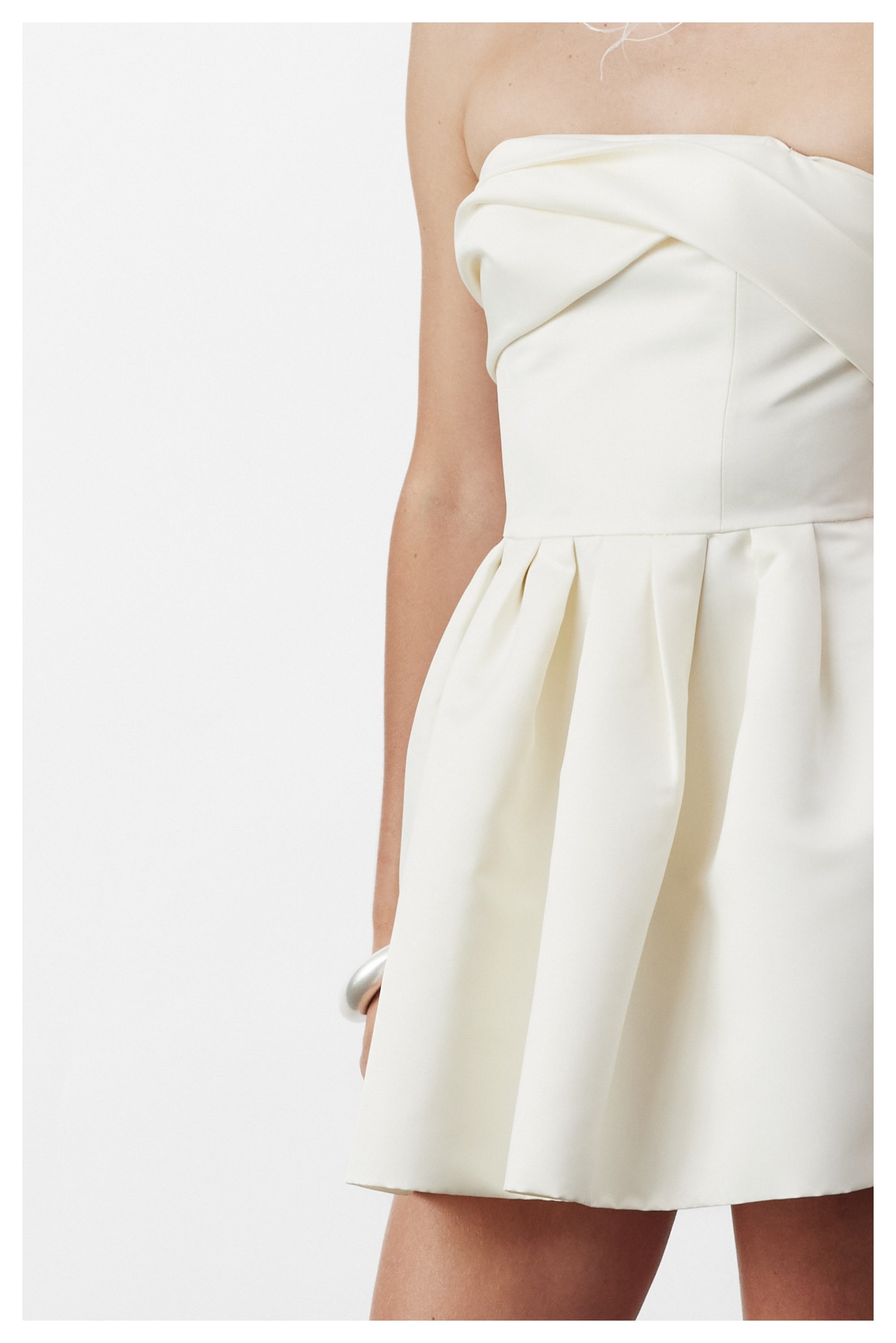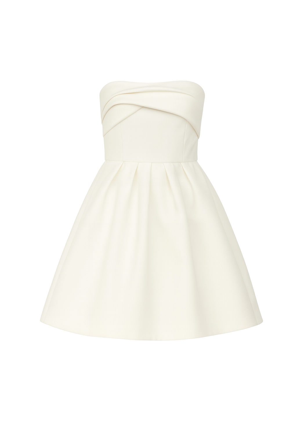 Freya Mini Elbise, zarif detaylarıyla modern feminenliği bir araya getirir. Göğüs kısmındaki katlama detayı, elbiseye nazik ve özgün bir zarafet kazandırırken; straplez formu ve arkadan fermuarlı yapısı modern bir silüet oluşturur. Pileli etek kısmı, iki katlı tasarımı sayesinde hem hacim hem de hareketli bir duruş sunar. Hafif parlak dokulu kumaşıyla özel davetlerde, kokteyllerde ve yaz akşamlarında dikkat çekici bir şıklık sağlar.