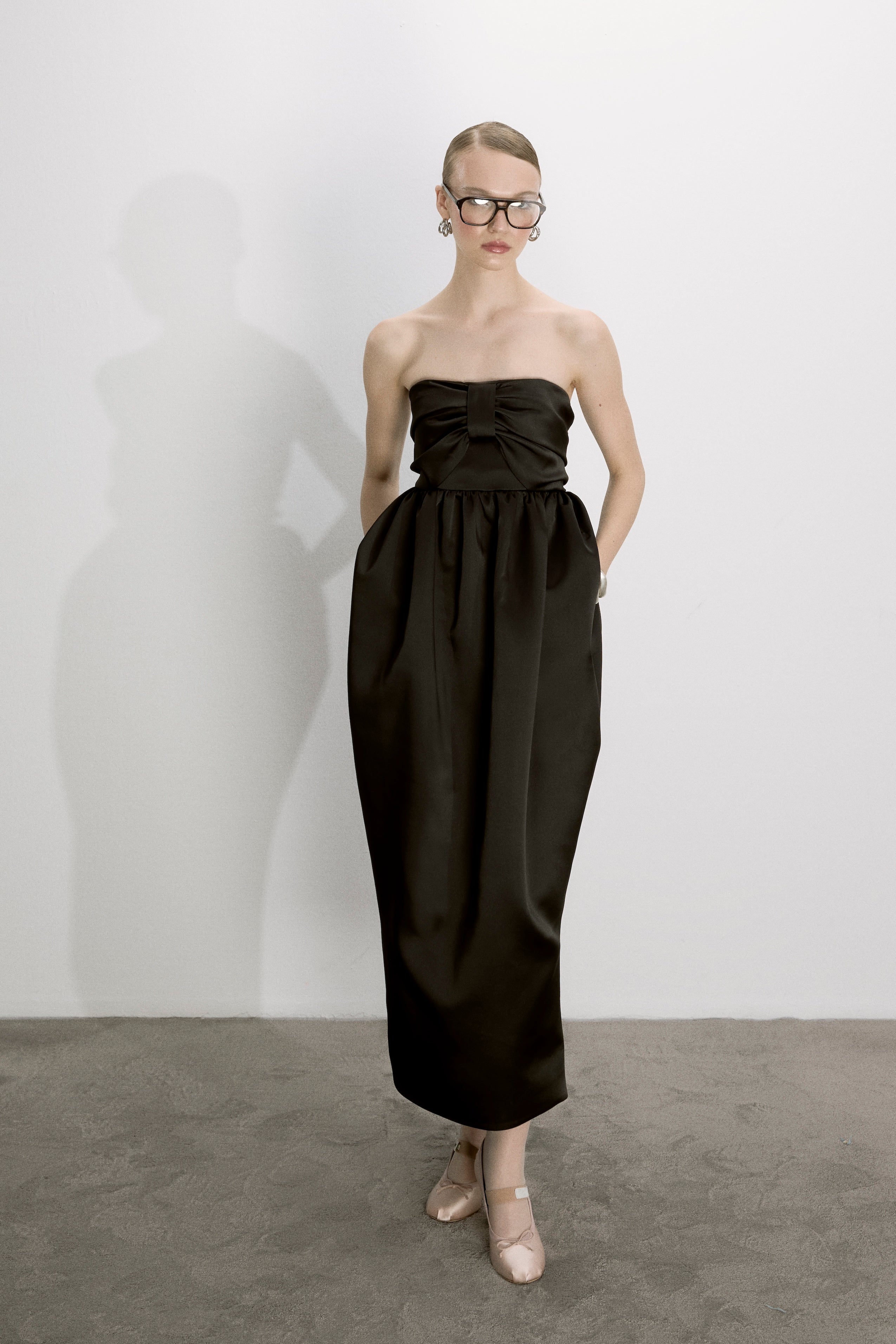 Jeanne Balon Elbise, göğüse oturan üst kısmı ve arkadan ayarlanabilir askılarıyla hem şıklık hem konfor sunar. Belde aşağıya doğru kabarık bir şekilde ilerler. Mat saten kumaştan üretilmiştir.