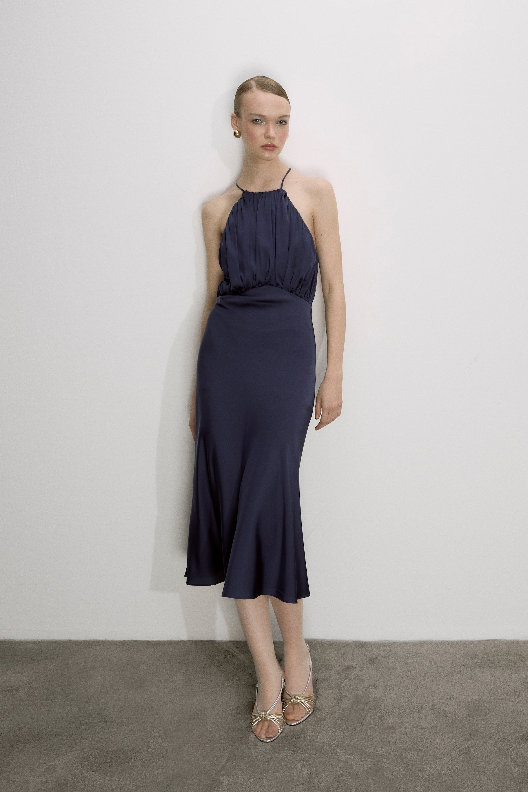 Reese Saten Elbise, göz alıcı mavi tonu ve yumuşak saten kumaşıyla zarafeti ön plana çıkarır. Arkada bağlamalı açık sırt detayı, elbiseye modern ve çekici bir hava katar. Midi boy kesimi ve hafif dökümlü saten dokusu sayesinde özel davetler, kutlamalar ve şık akşam etkinlikleri için mükemmel bir tercihtir. Saten astarı cilde yumuşak bir temas sağlayarak konforlu bir kullanım sunar.