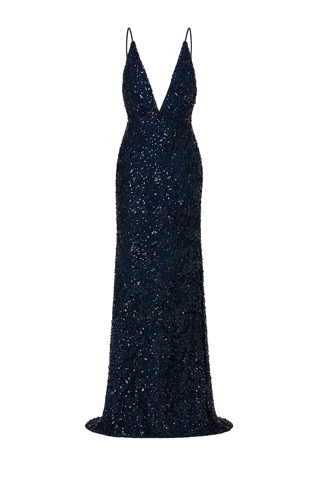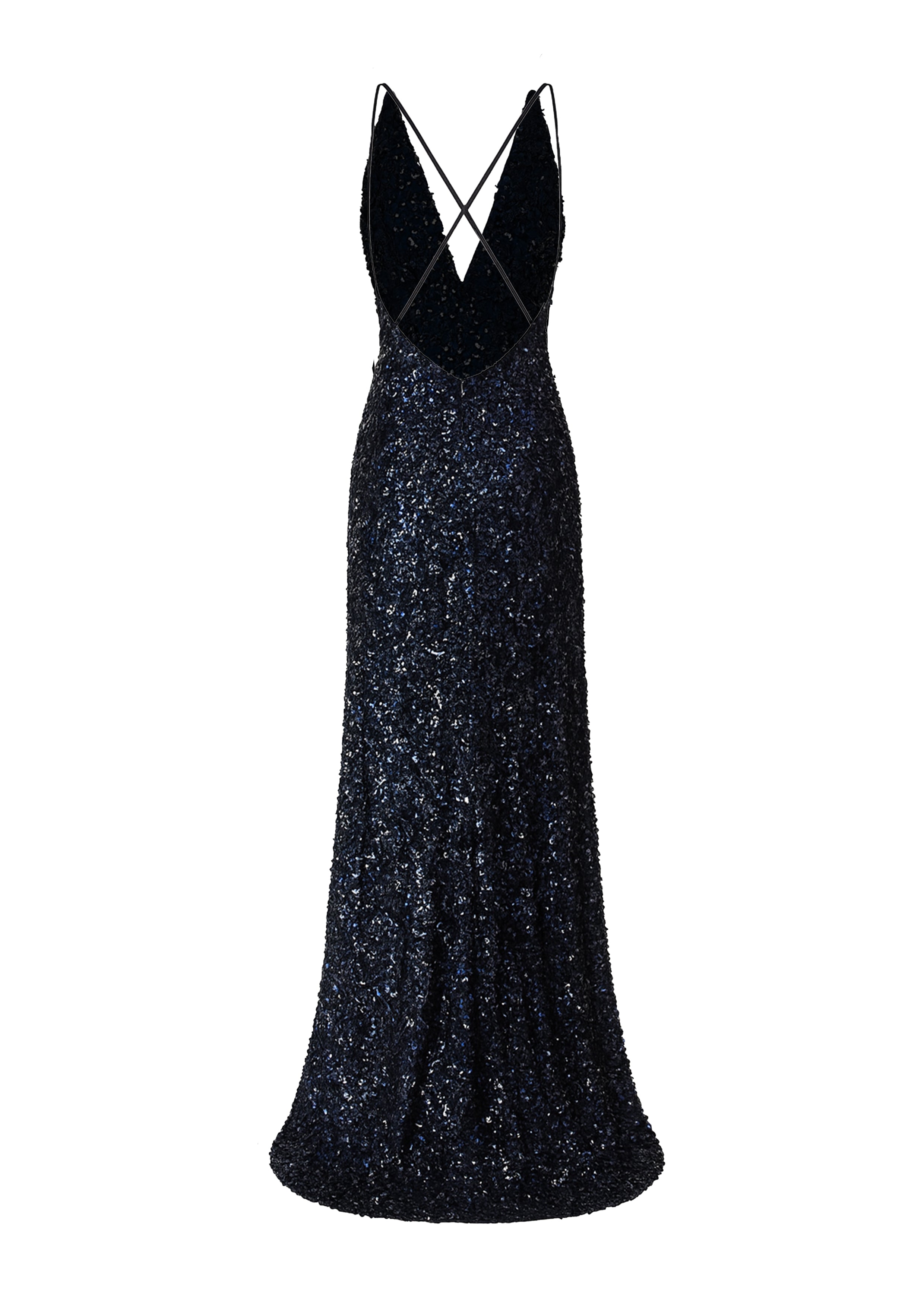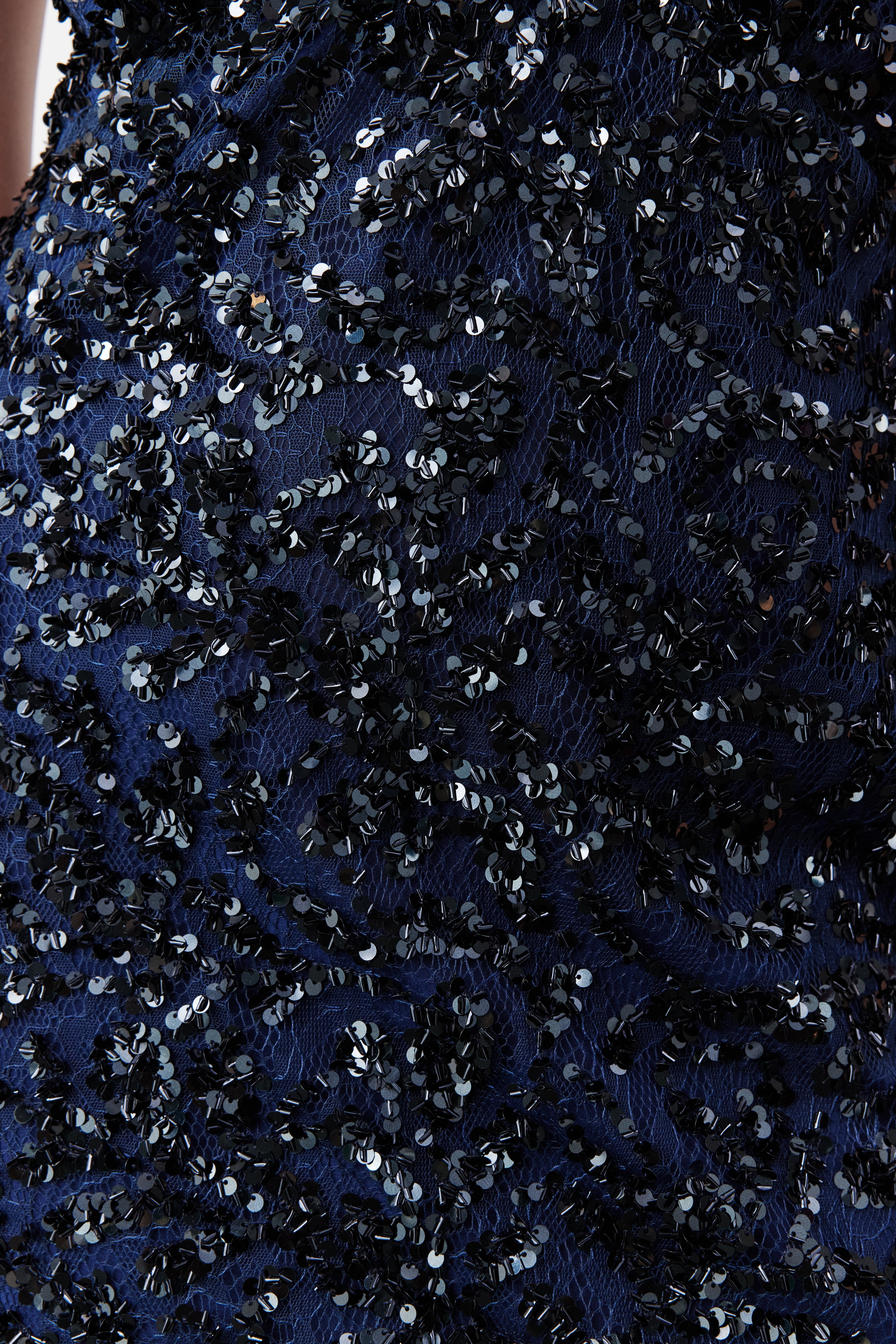 Selene Uzun Payetli Elbise, koyu lacivert payet kumaşıyla ışıltılı bir zarafet sunar. V yaka detayı feminen bir duruş kazandırırken, bel ve kalça kısmındaki vücuda oturan formu modern bir silüet oluşturur. Premium esnek jarse astarı sayesinde rahat bir kullanım sunarken, vücudu saran yapısı hareket özgürlüğü sağlar. Işıltılı yüzeyiyle gece davetleri, kokteyller ve özel kutlamalar için mükemmel bir seçenektir. Konfor ve şıklığı bir araya getiren bu elbise, her adımda göz alıcı bir etki yaratır.