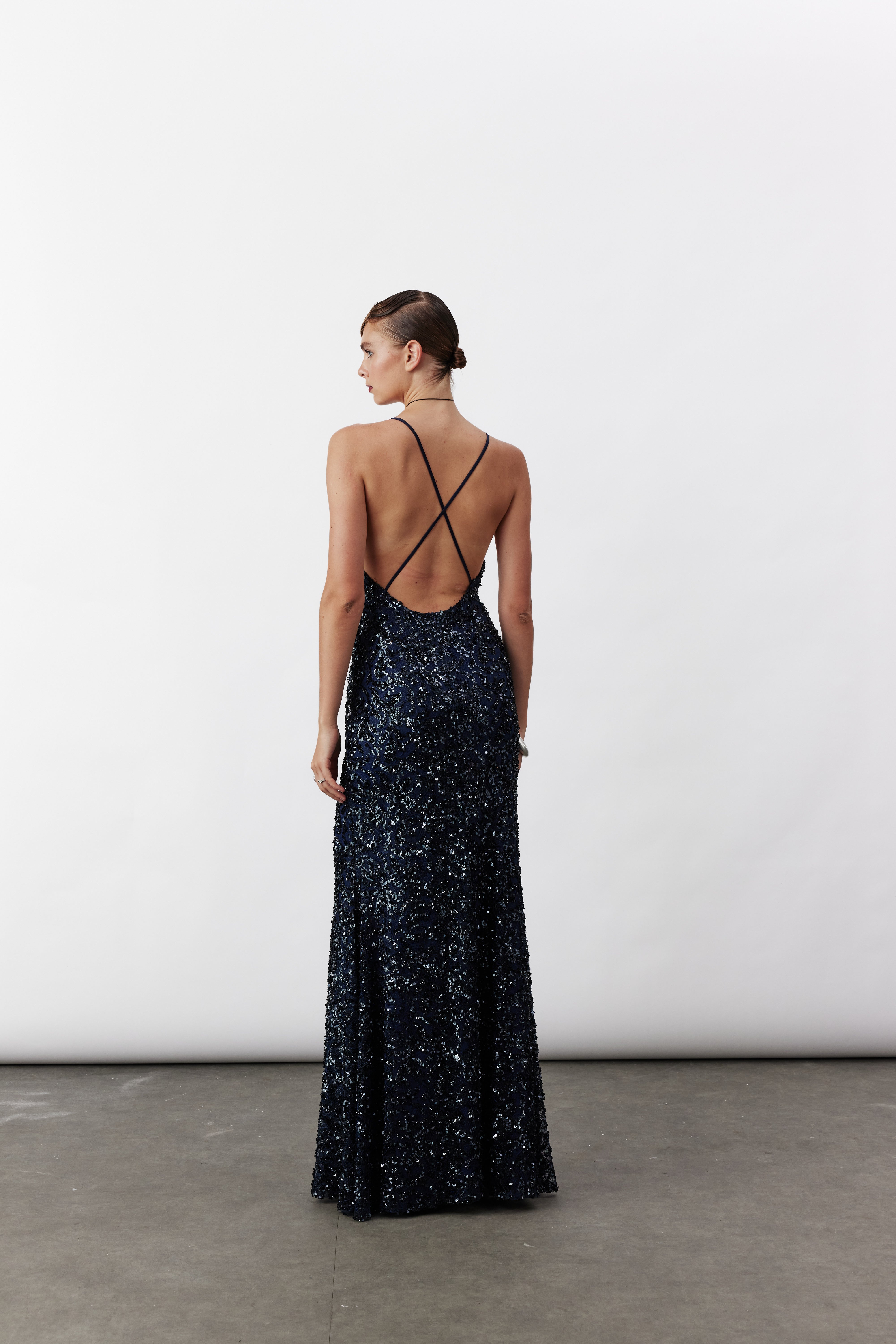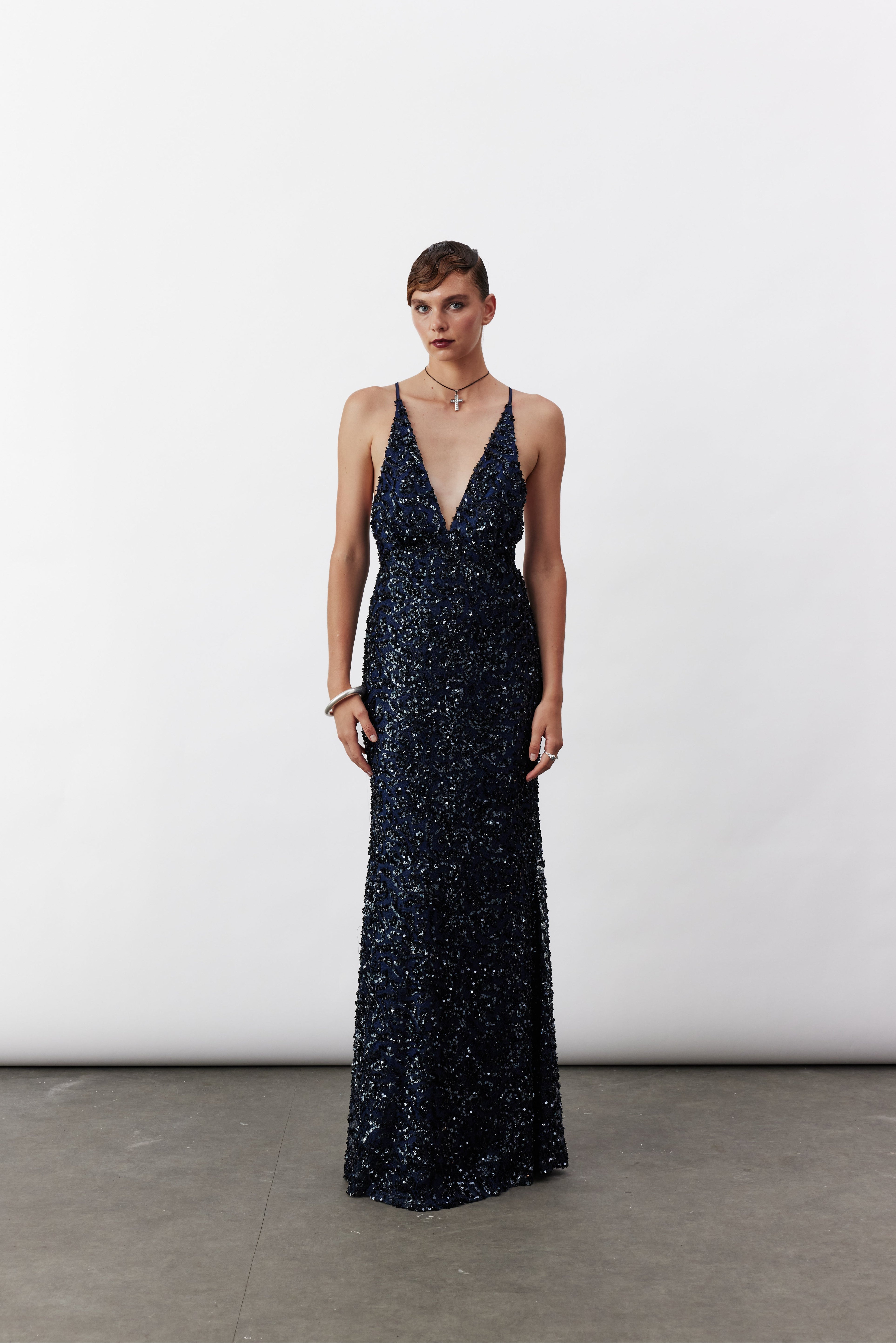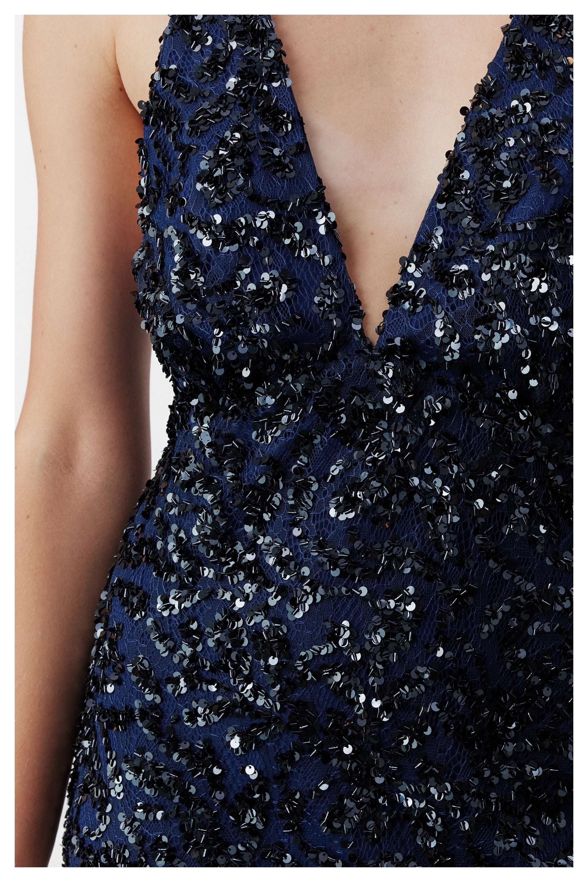 Selene Uzun Payetli Elbise, koyu lacivert payet kumaşıyla ışıltılı bir zarafet sunar. V yaka detayı feminen bir duruş kazandırırken, bel ve kalça kısmındaki vücuda oturan formu modern bir silüet oluşturur. Premium esnek jarse astarı sayesinde rahat bir kullanım sunarken, vücudu saran yapısı hareket özgürlüğü sağlar. Işıltılı yüzeyiyle gece davetleri, kokteyller ve özel kutlamalar için mükemmel bir seçenektir. Konfor ve şıklığı bir araya getiren bu elbise, her adımda göz alıcı bir etki yaratır.