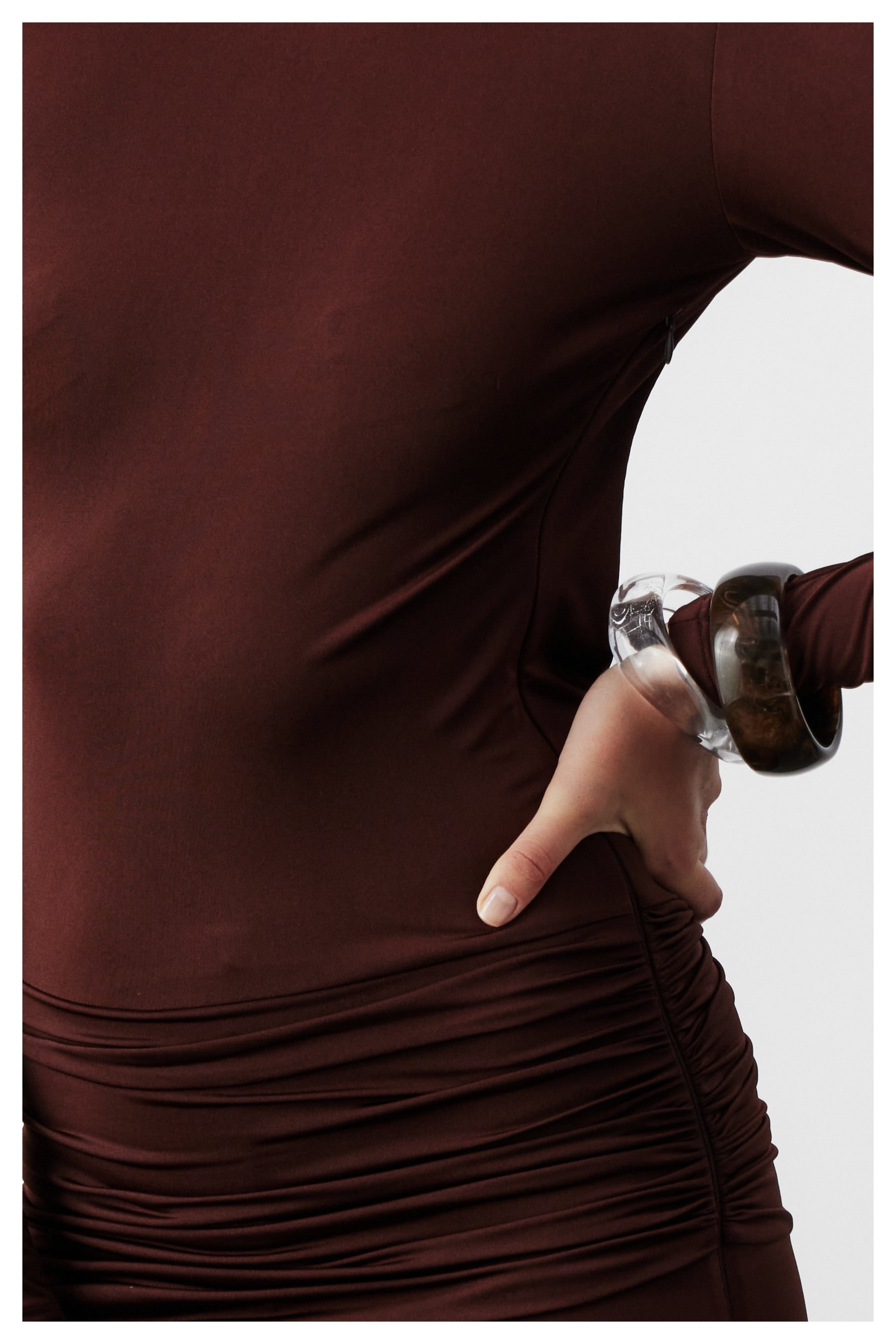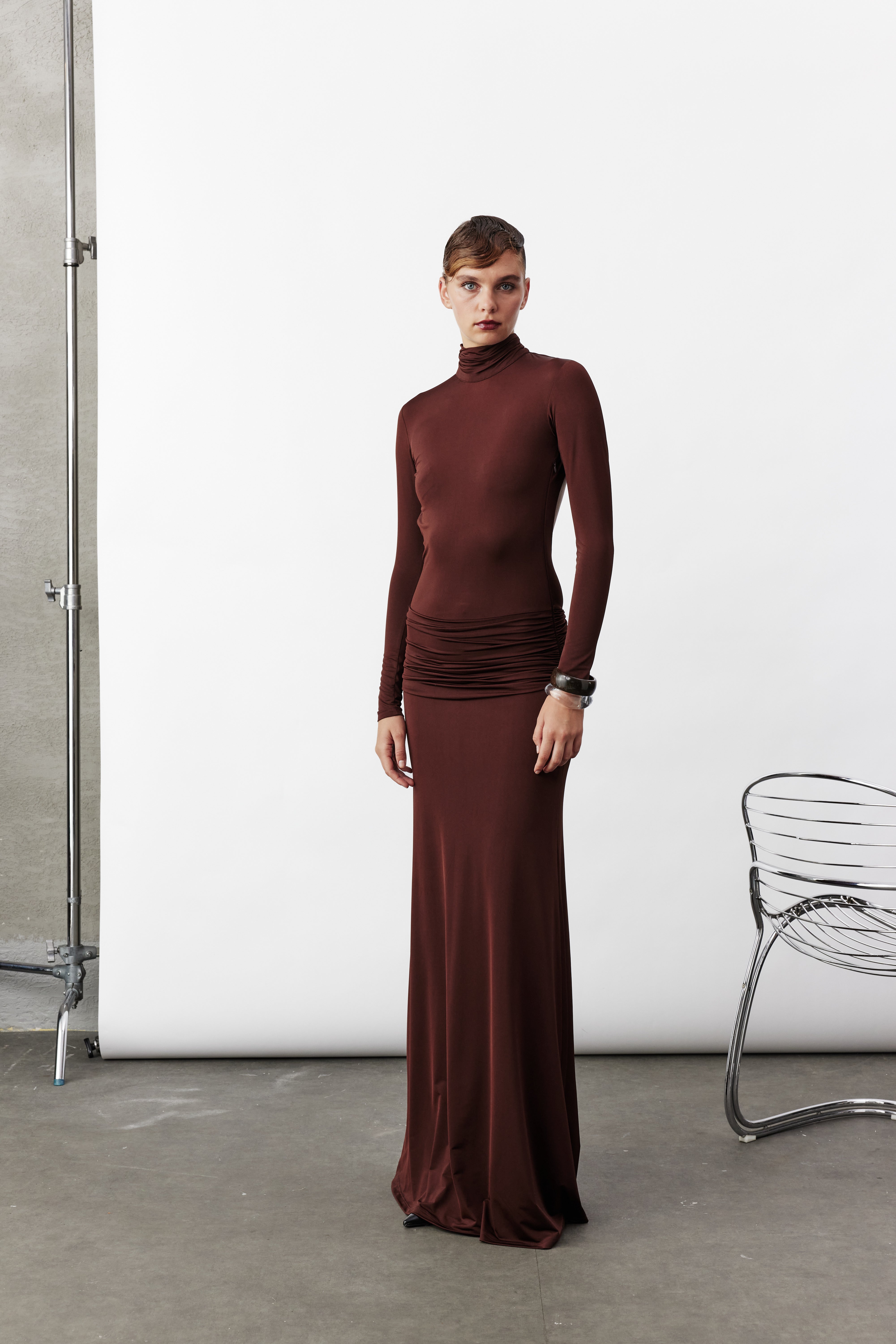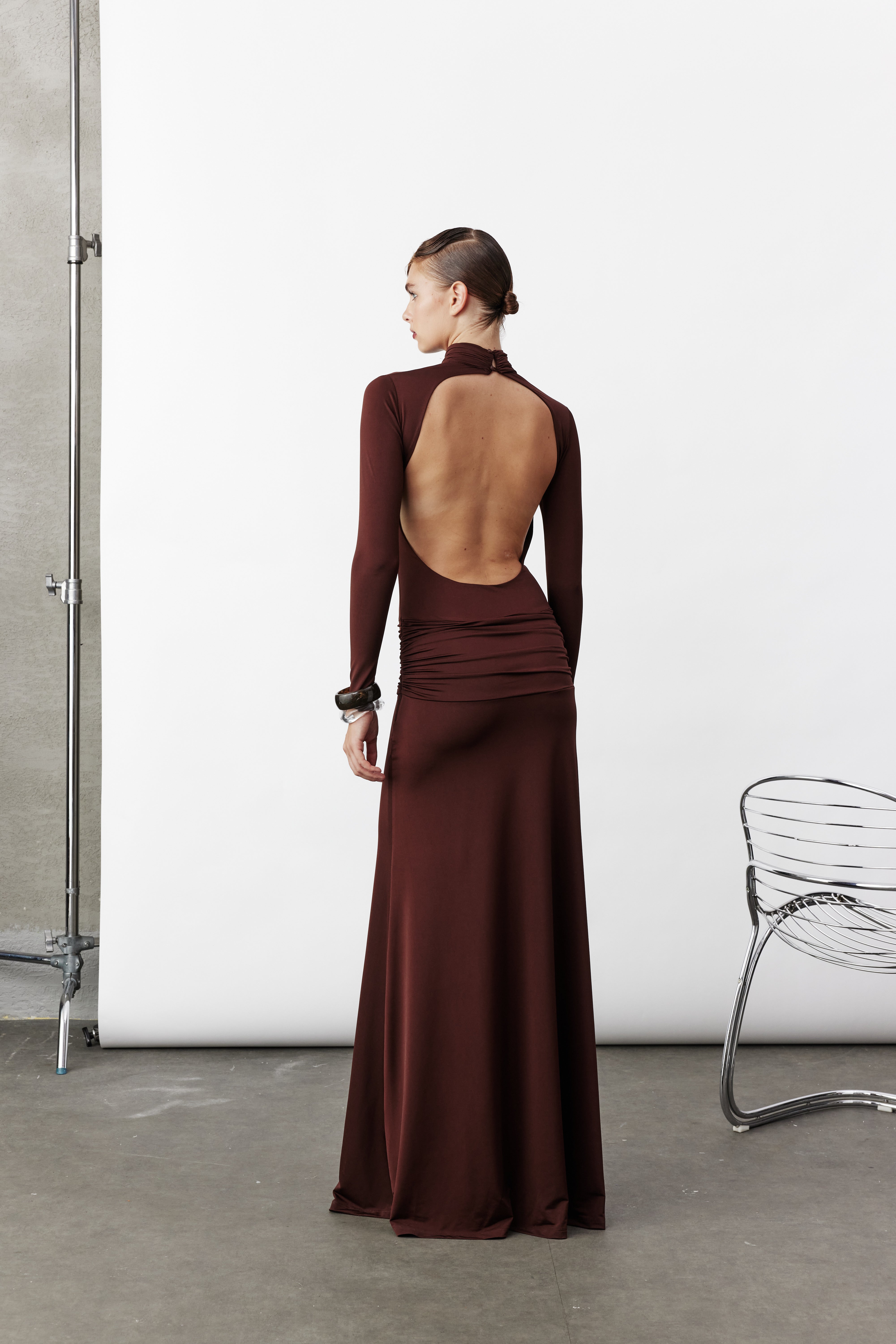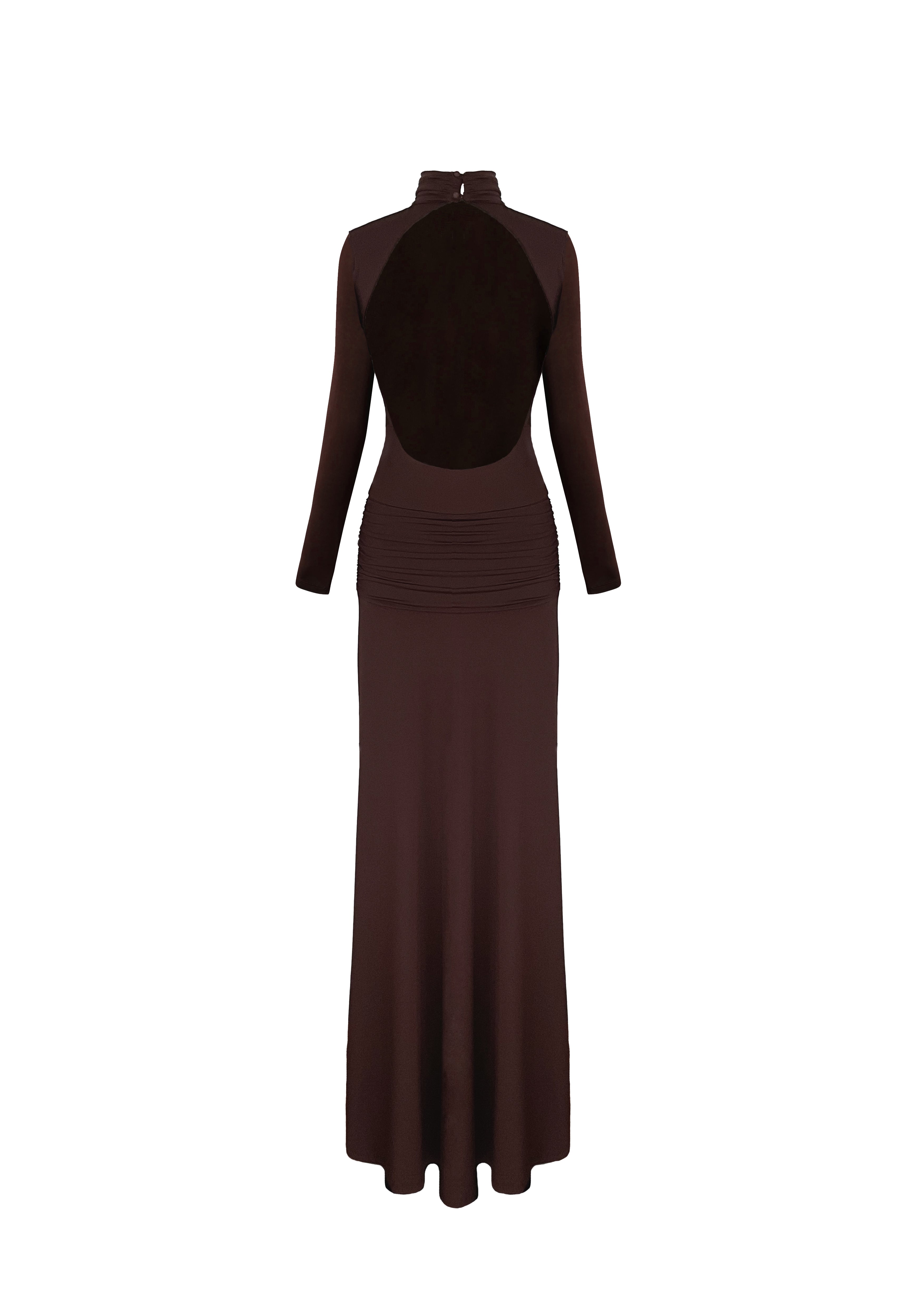 Sienna Uzun Jarse Elbise, zengin kahverengi tonuyla zamansız bir zarafet ve modern bir çekicilik sunar. Premium jarse kumaşı, vücudu zarifçe sararak doğal hatları öne çıkarır. Kalça kısmındaki büzgü detayı, silüete feminen bir dinamizm kazandırırken açık sırt tasarımıyla iddialı bir görünüm yaratır. Etek ve gövde bölgesinin çift kat kumaşla tamamlanması, elbiseye pürüzsüz bir düşüş ve kusursuz bir form kazandırır. Hem gece davetlerinde hem de özel etkinliklerde öne çıkmak isteyenler için güçlü bir stil seçeneğidir.