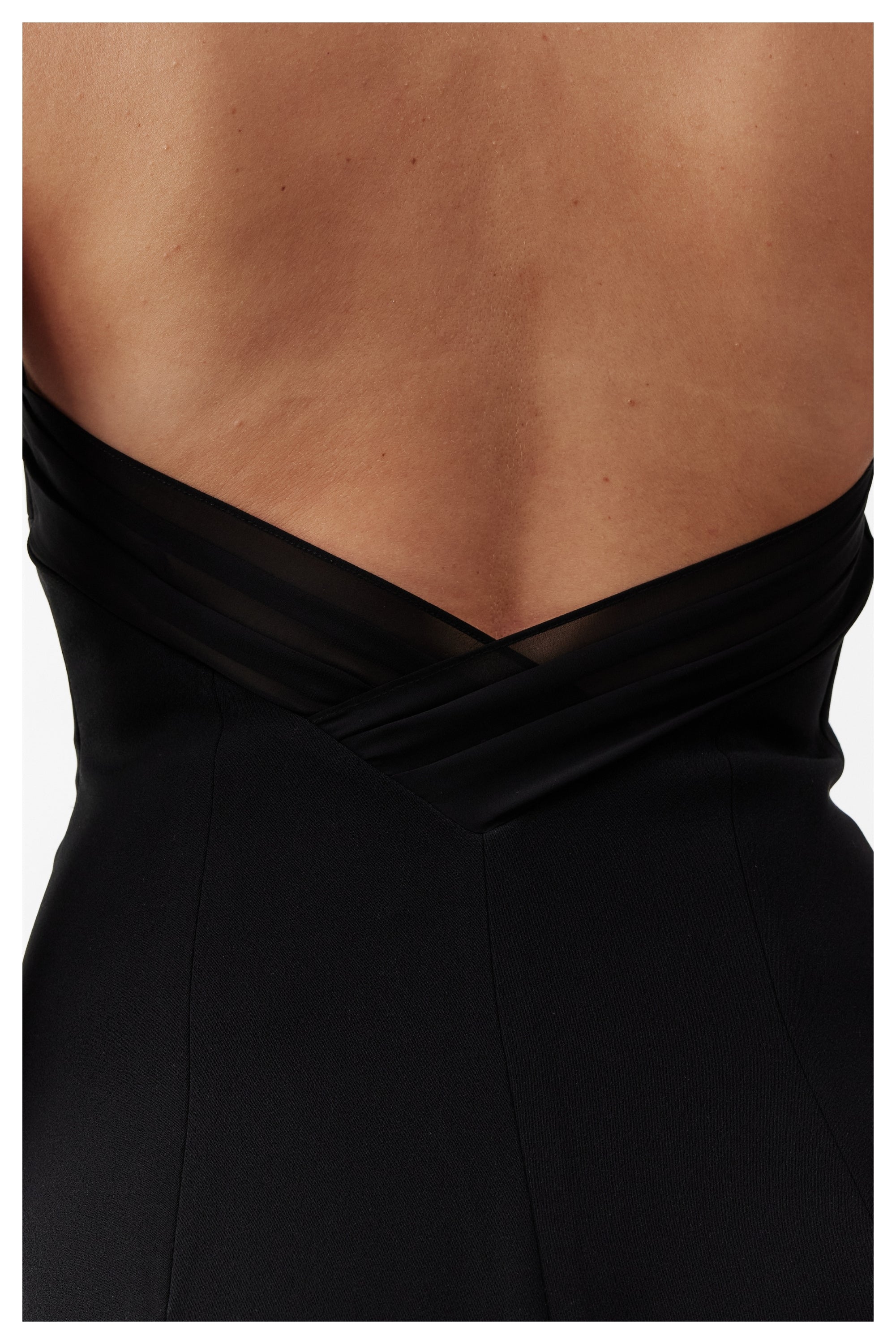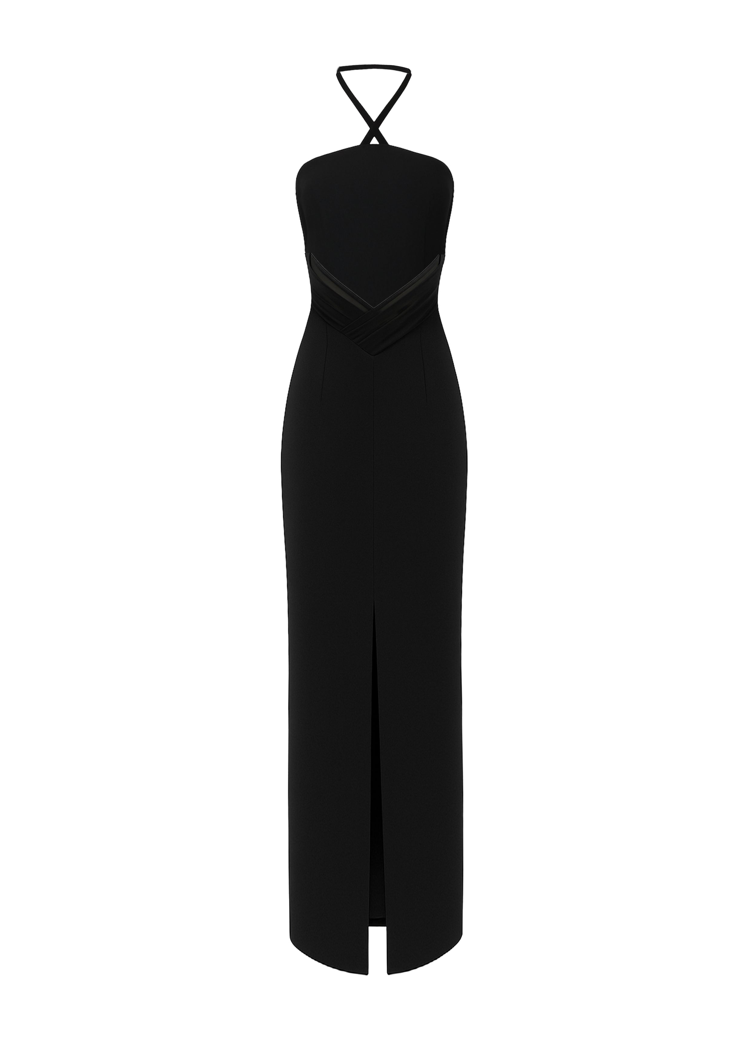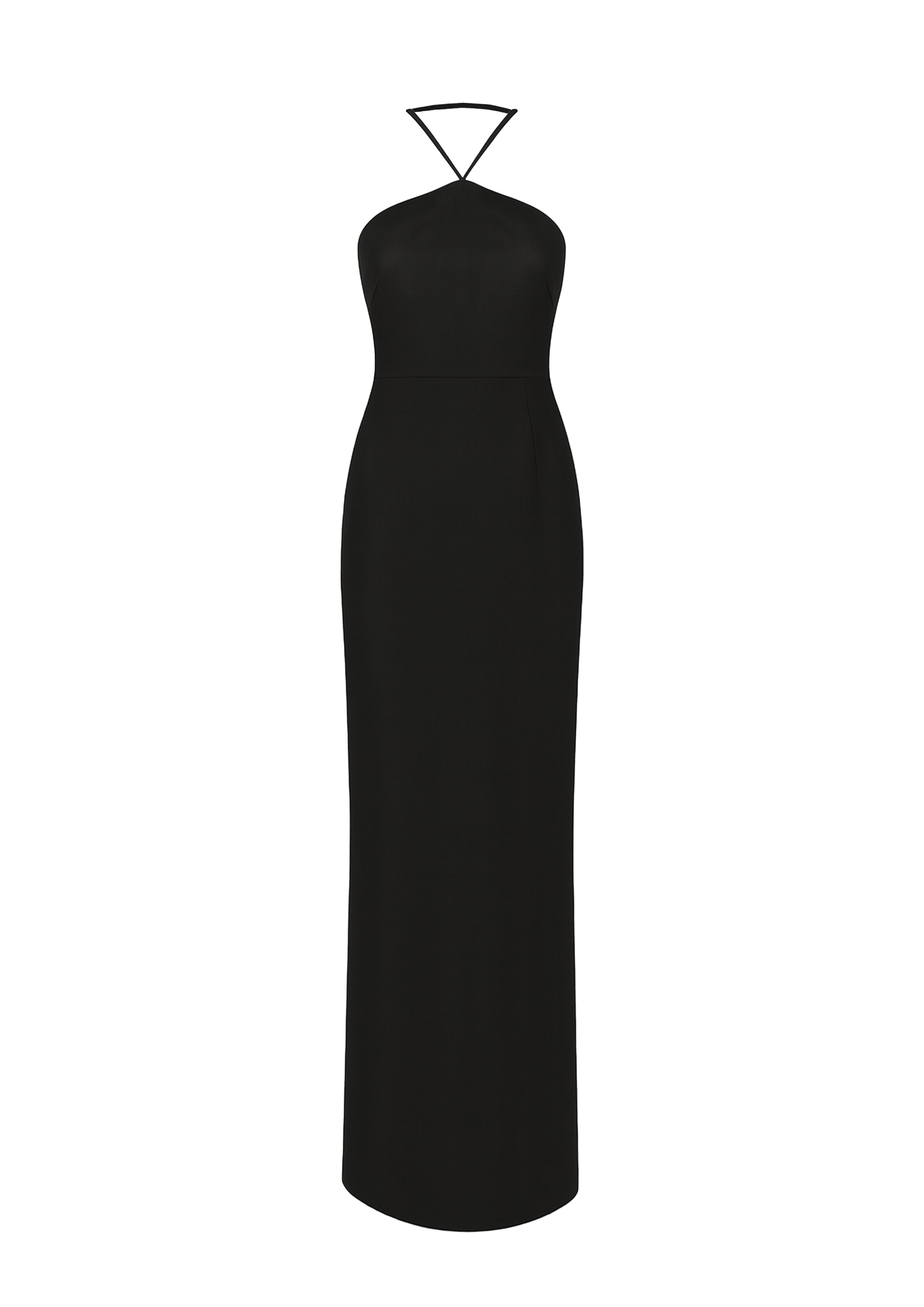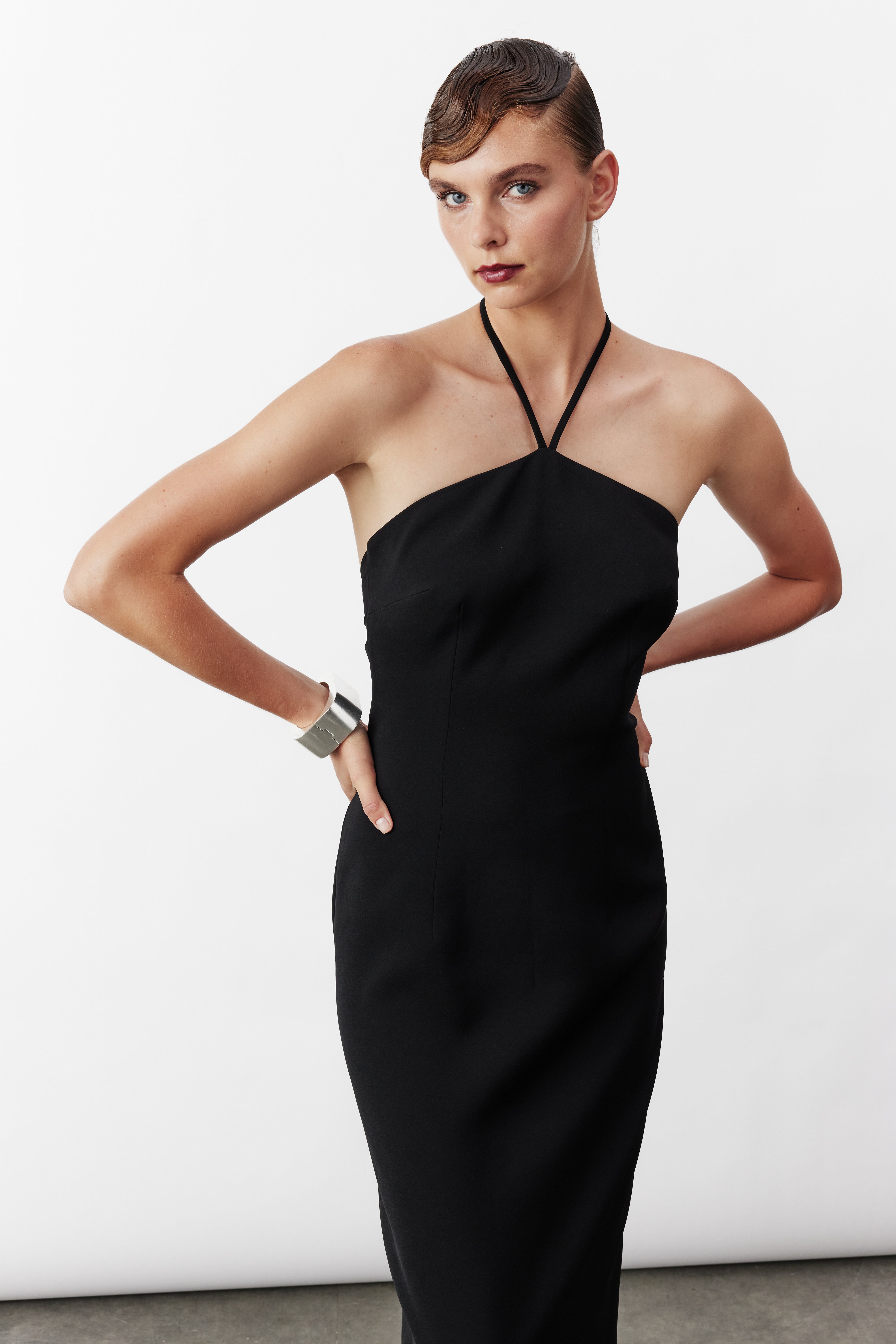 Violette Midi Krep Elbise, zarif detaylarıyla modern feminenliği bir araya getirir. Üçgen formundaki ön yaka kesimi ve boyundan bağlamalı tasarımıyla dikkat çeker. Arka sırtta yer alan şifon detay, elbiseye zarif ve etkileyici bir dokunuş kazandırır. Vücudu saran formu silüeti belirginleştirirken, midi boyu ile sofistike bir görünüm oluşturur. Krep kumaşın dökümlü yapısı saten astarla tamamlanarak kusursuz bir duruş sağlar. Özel davetlerden şehir akşamlarına kadar birçok ortamda şık bir alternatif sunar.