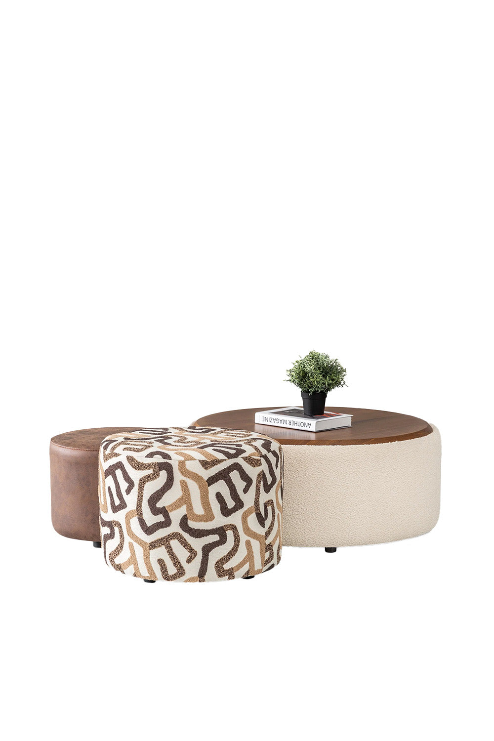 BOYUT: Küçük Puf: Çap: 35 cm Yükseklik: 30 cm Orta Puf: Çap:50 cm Yükseklik: 38 cm Ahşap Sehpa Puf: Çap: 85 cm Yükseklik: 36 cm