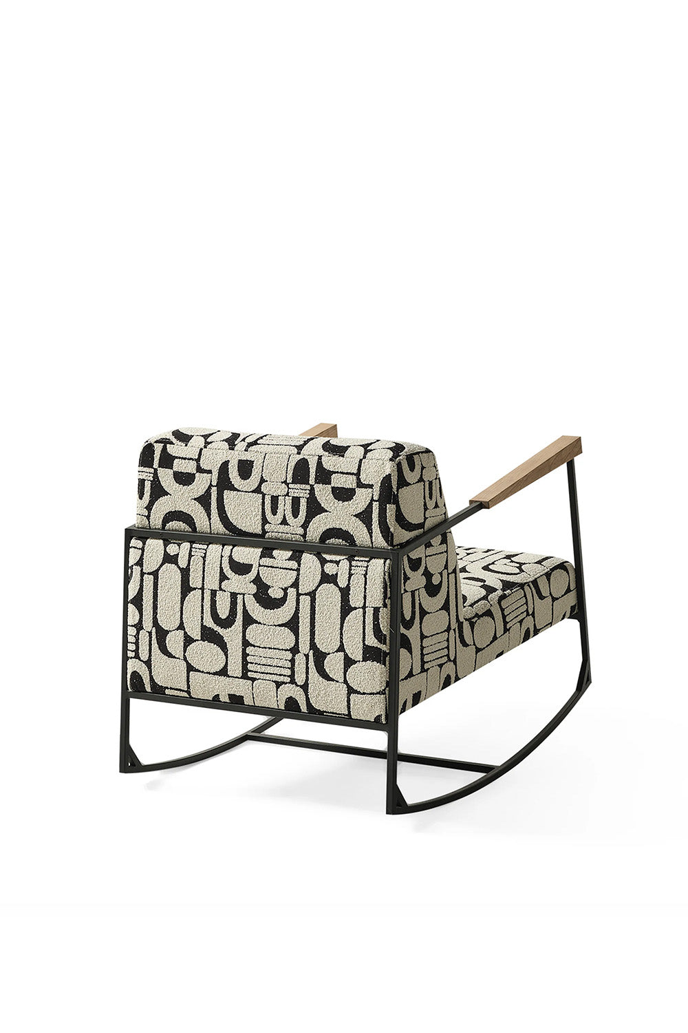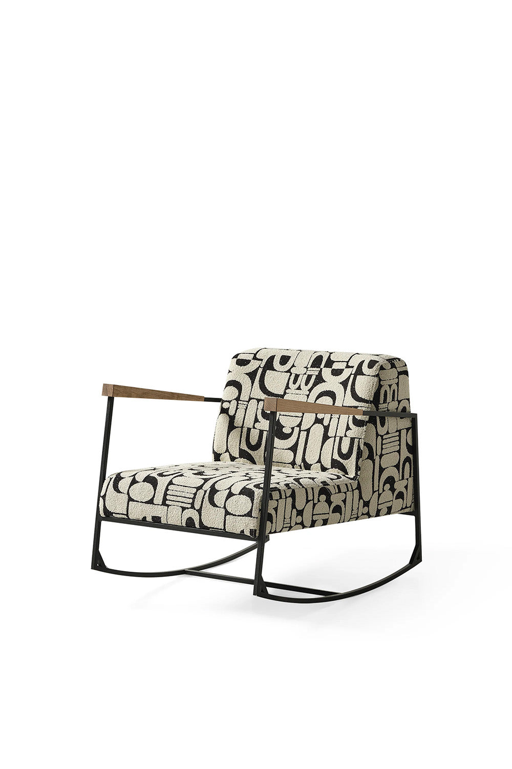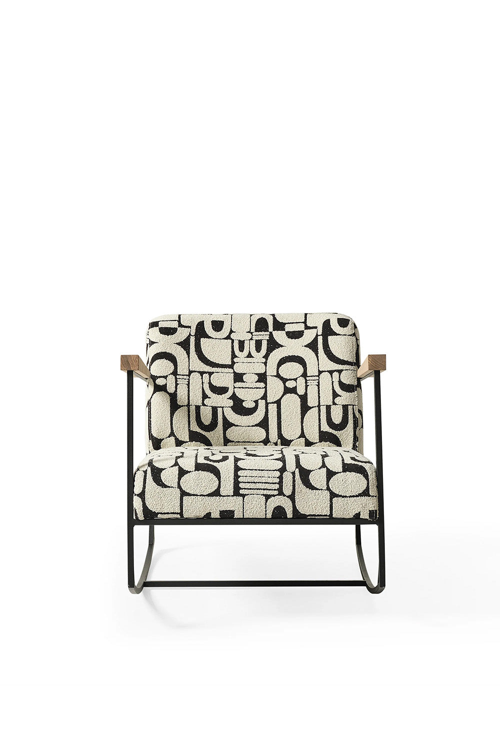 Metal çerçevesi, hafiflik ve sağlamlığı dengelerken, geometrik desenleriyle dikkat çeken kumaşı karakteristik bir dokunuş katıyor. Gereksiz detaylardan kaçınılmış tasarımı, her ortamda estetik bir denge kurarken, konforu da ön planda tutuyor. Minimalizmin getirdiği huzuru hissetmek için tasarlanan bu berjer, zamansız bir şıklığın temsilcisi.