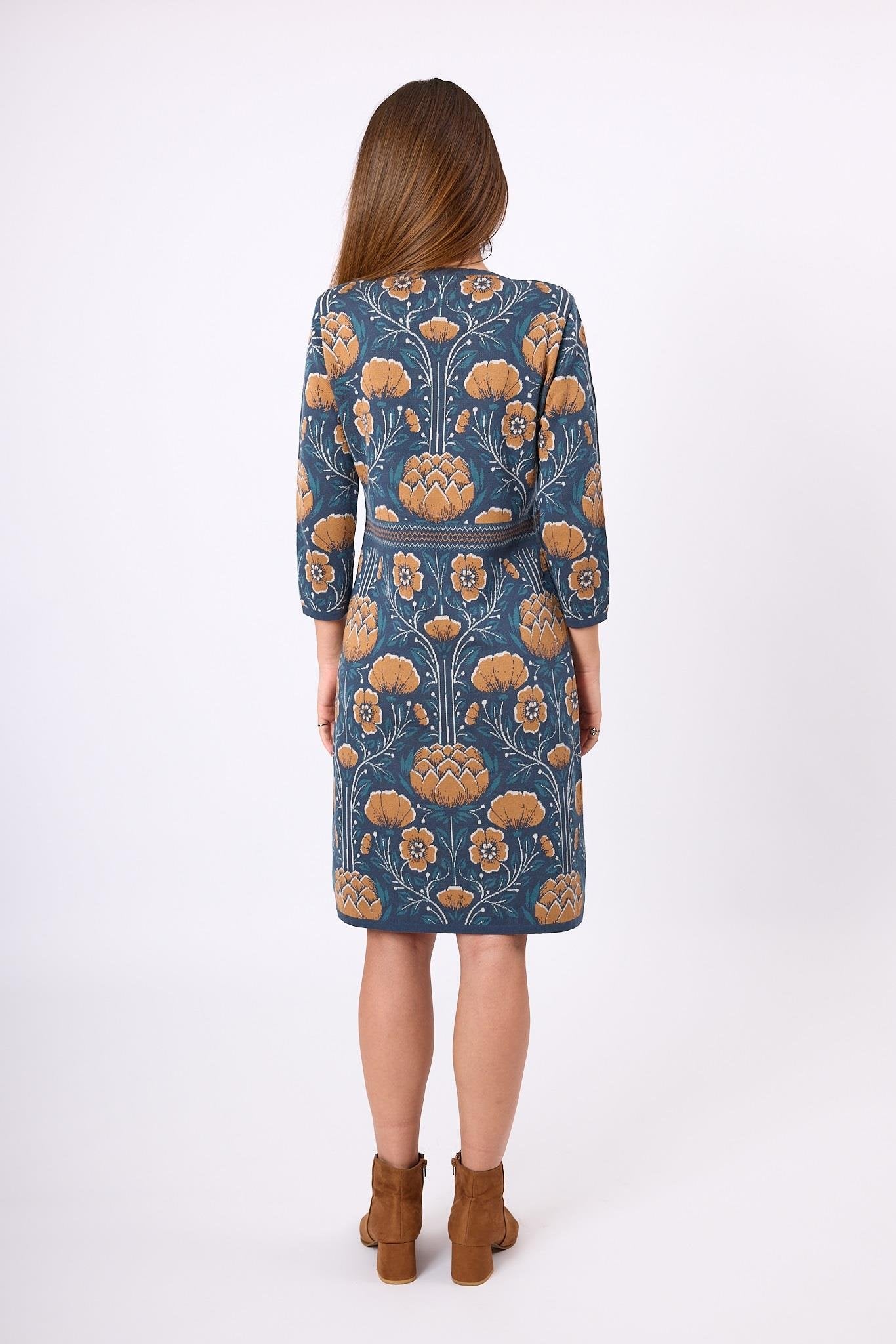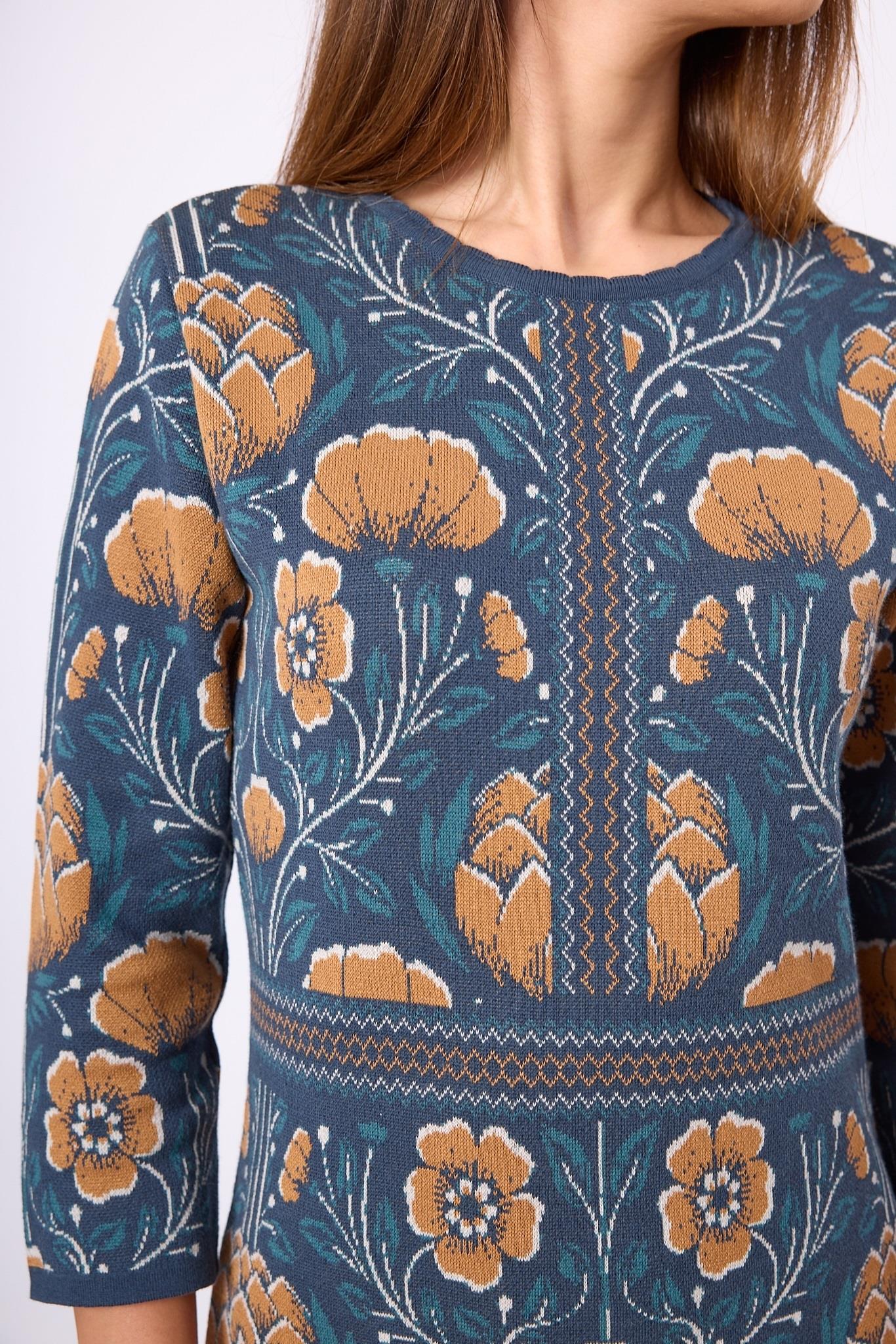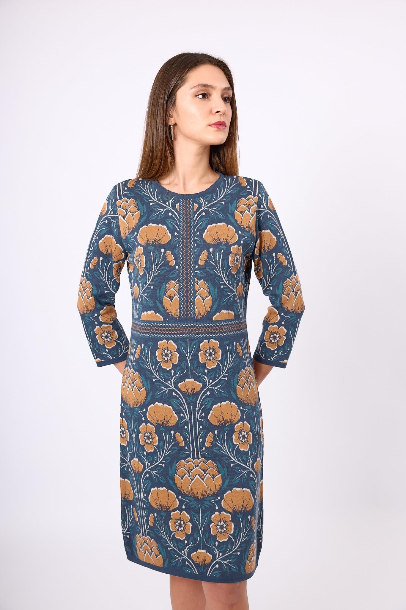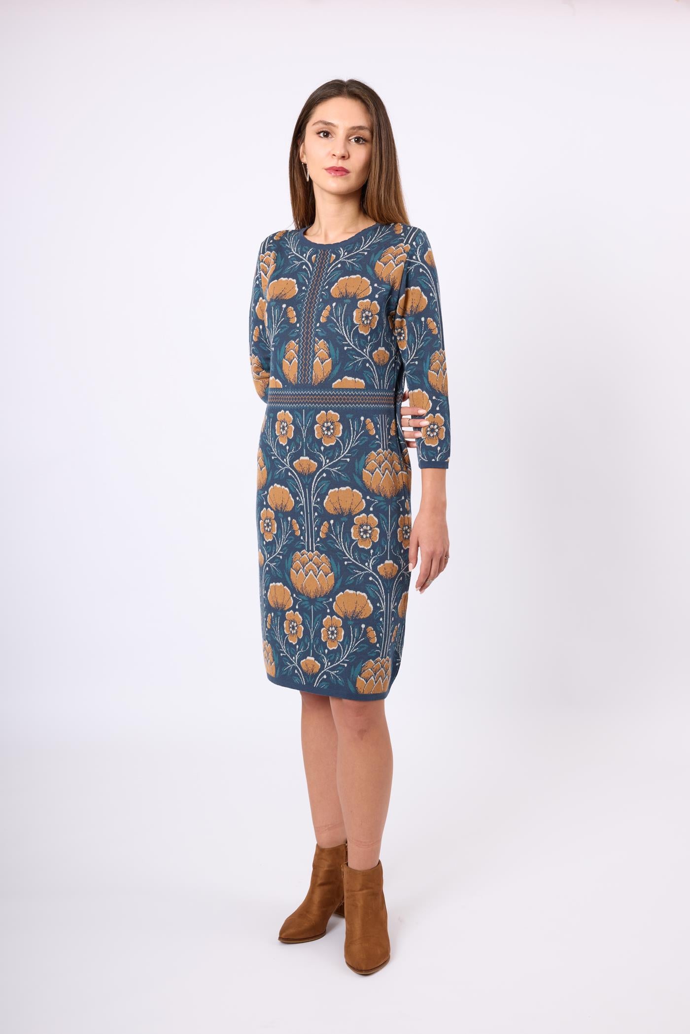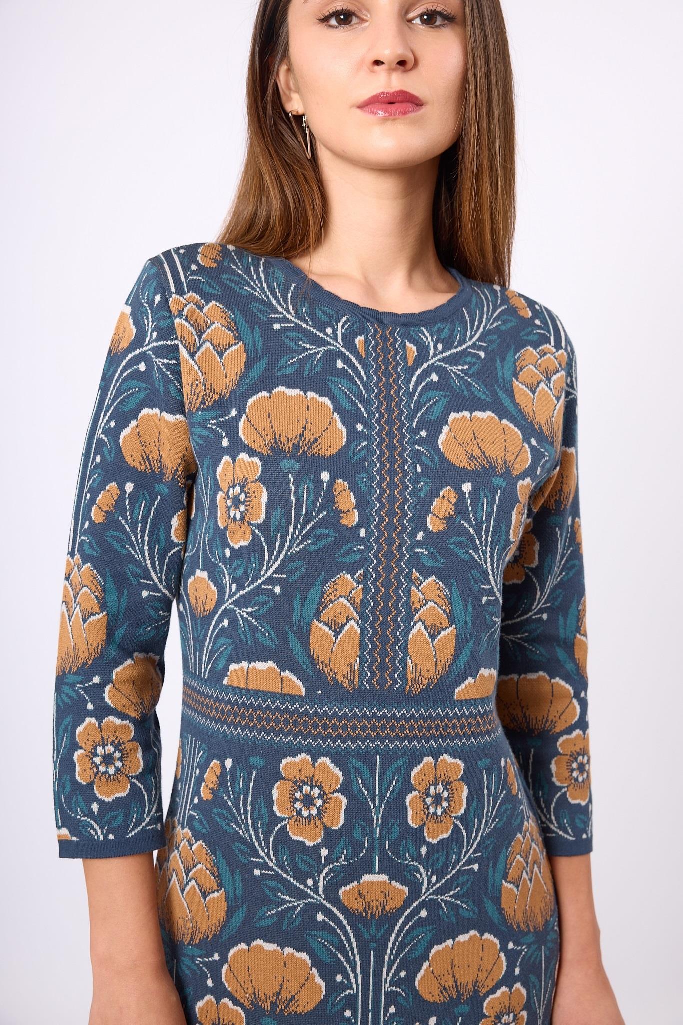 Çiçek Jakarlı, Standart Fit, O Yaka,  3/4 Kol, Diz Altı, Kadın Triko Elbise