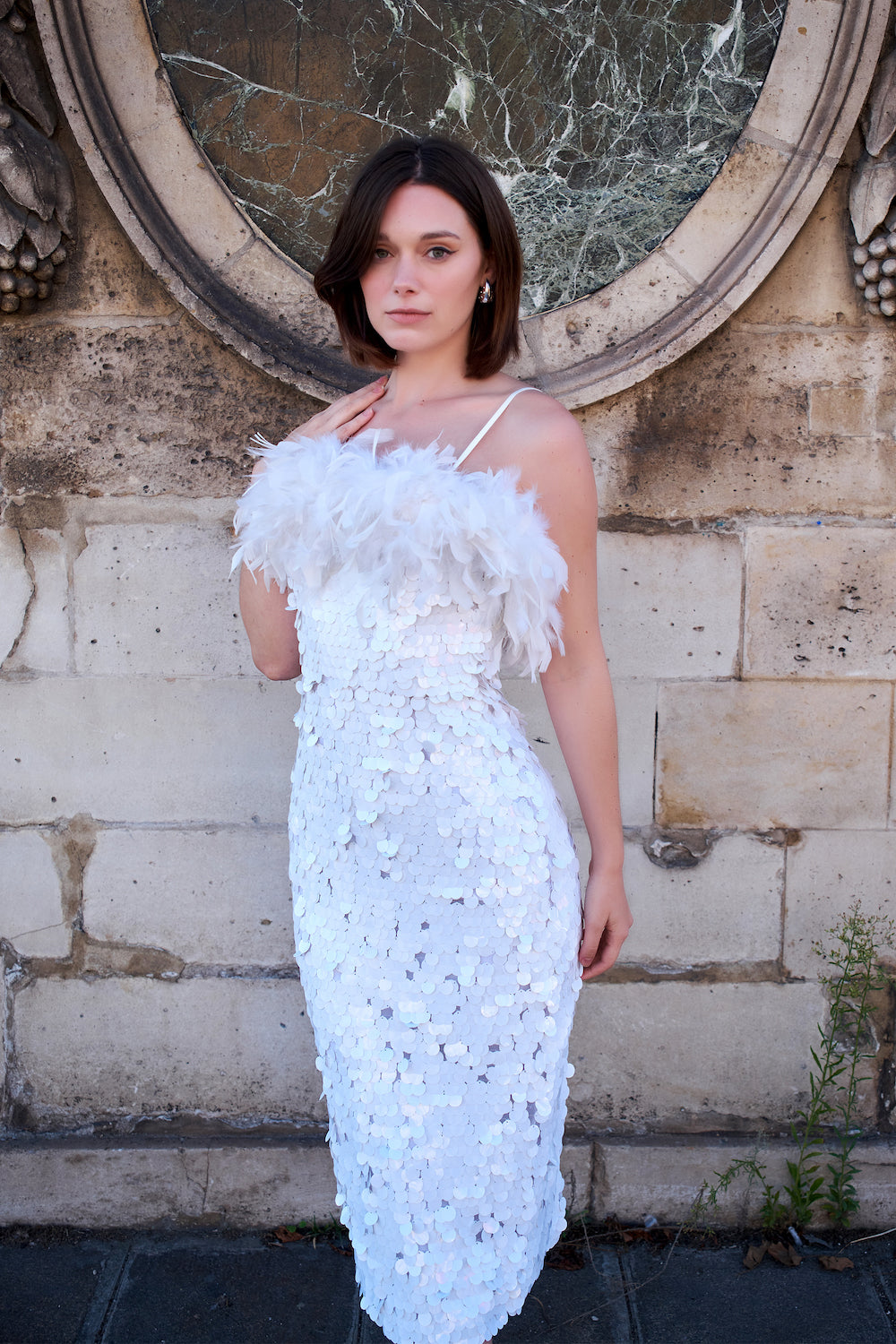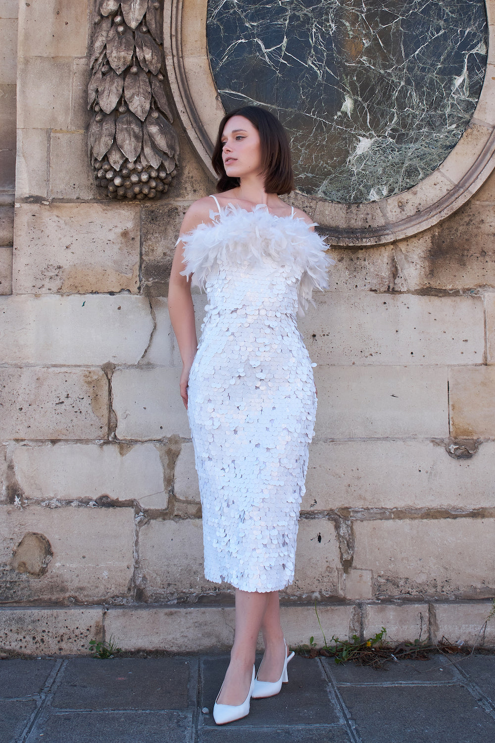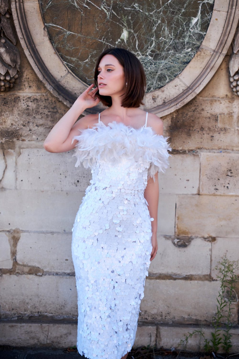 Beyaz Payetli Boa Otrişli Midi Boy Elbise Ariel
