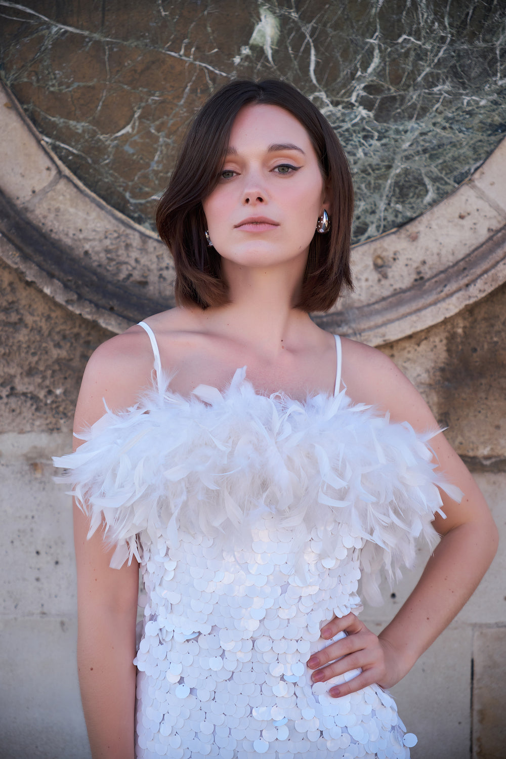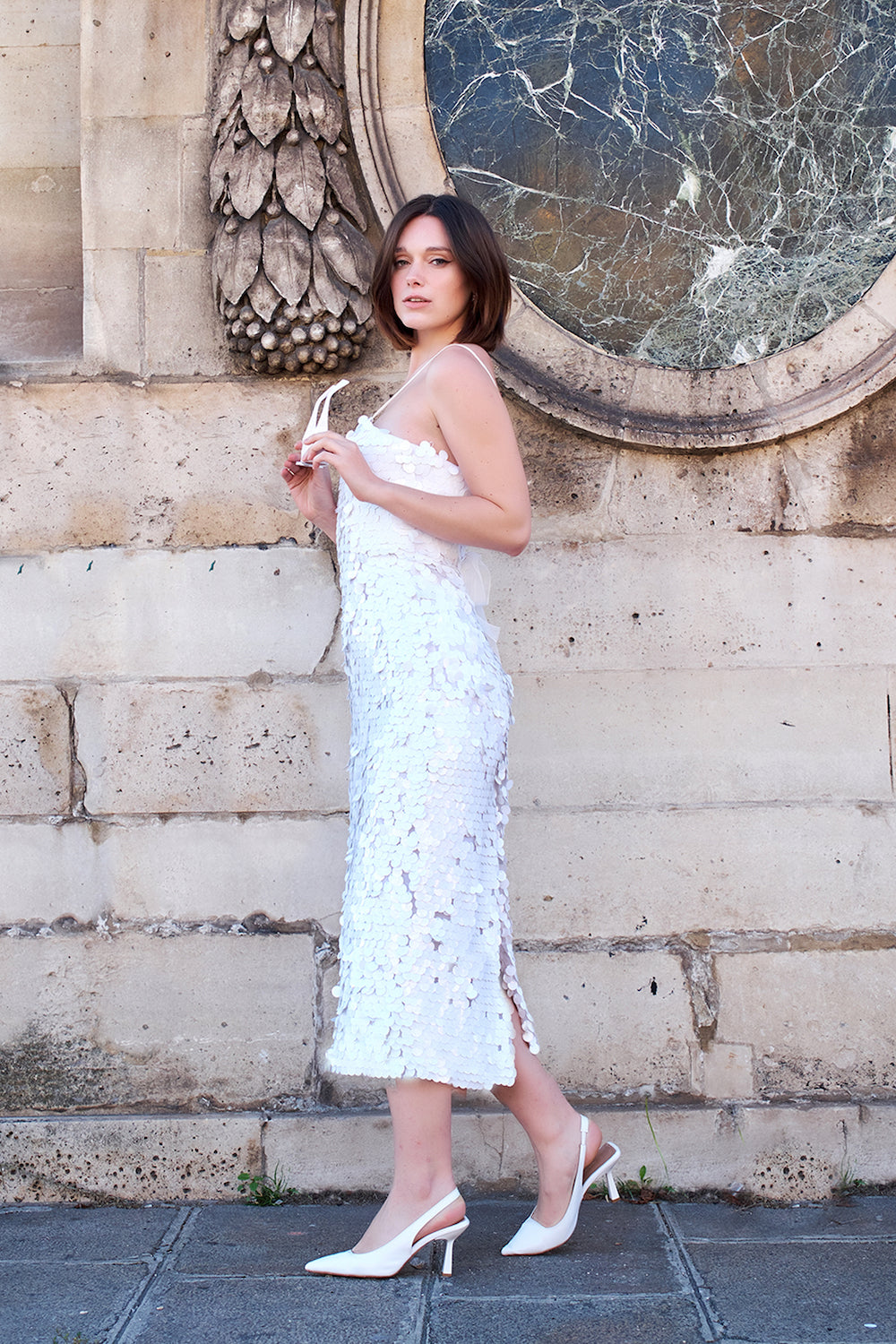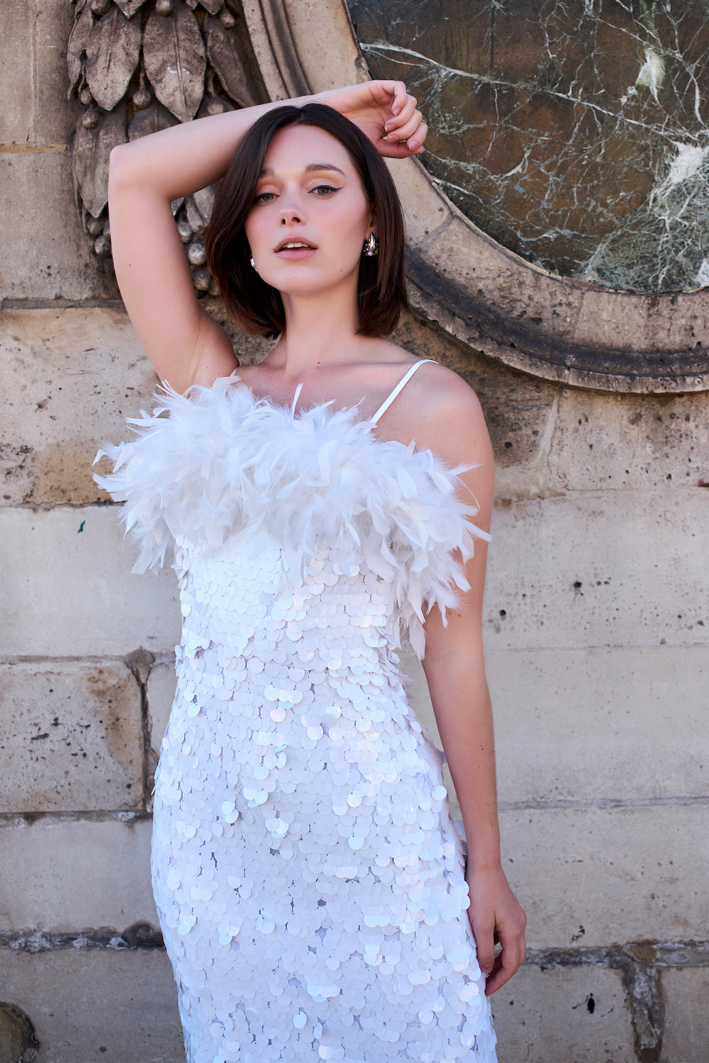 Beyaz Payetli Boa Otrişli Midi Boy Elbise Ariel