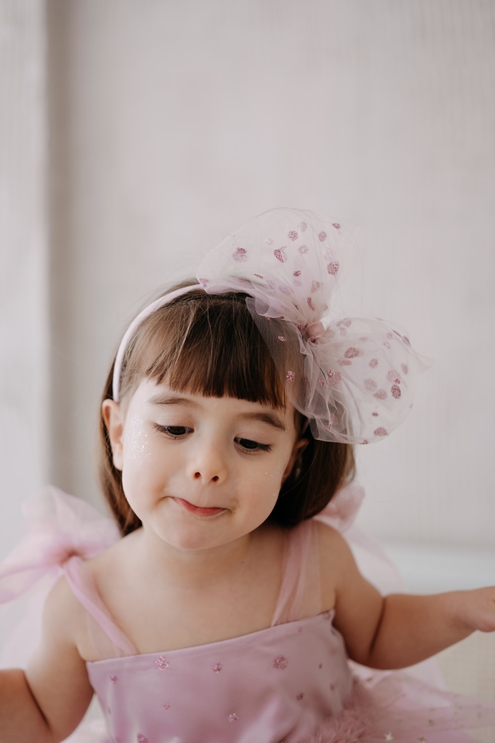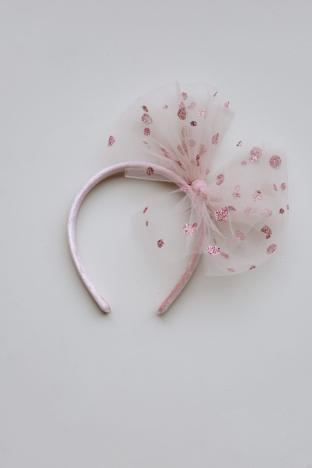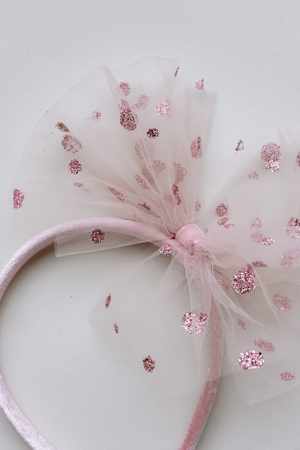 Yumuşak, kadife taç. Pembe tül fiyongunda sim detayı. Elde üretim.