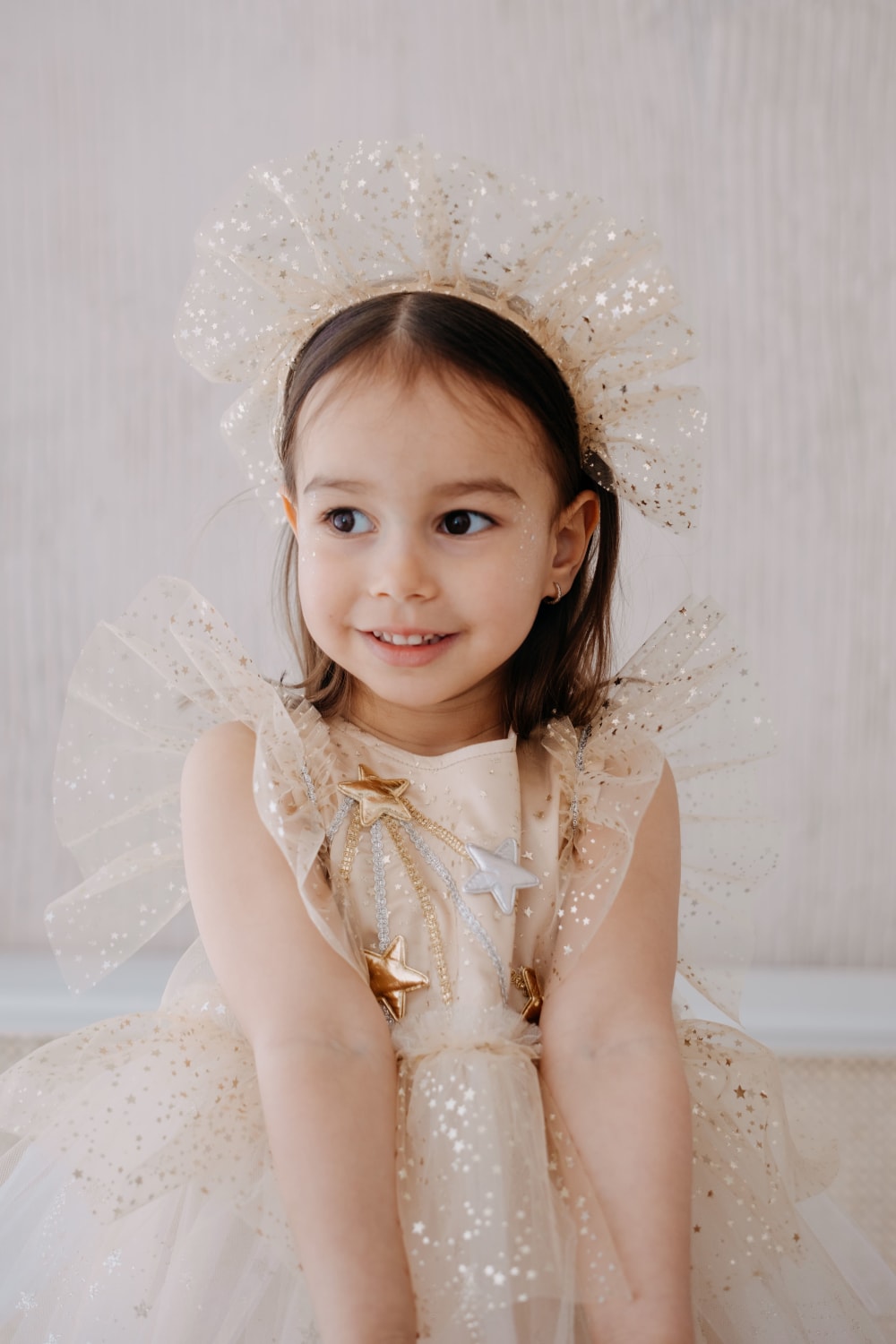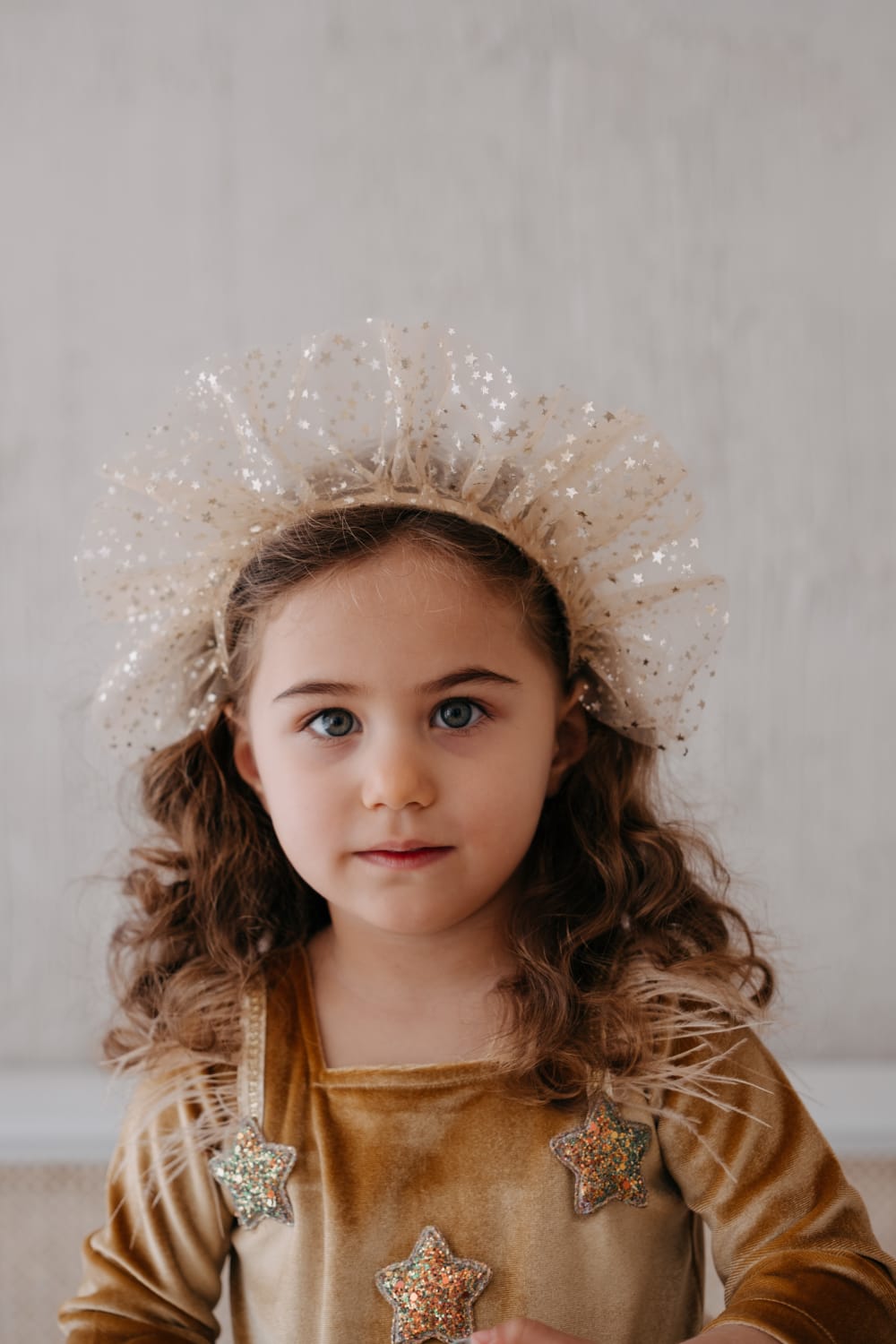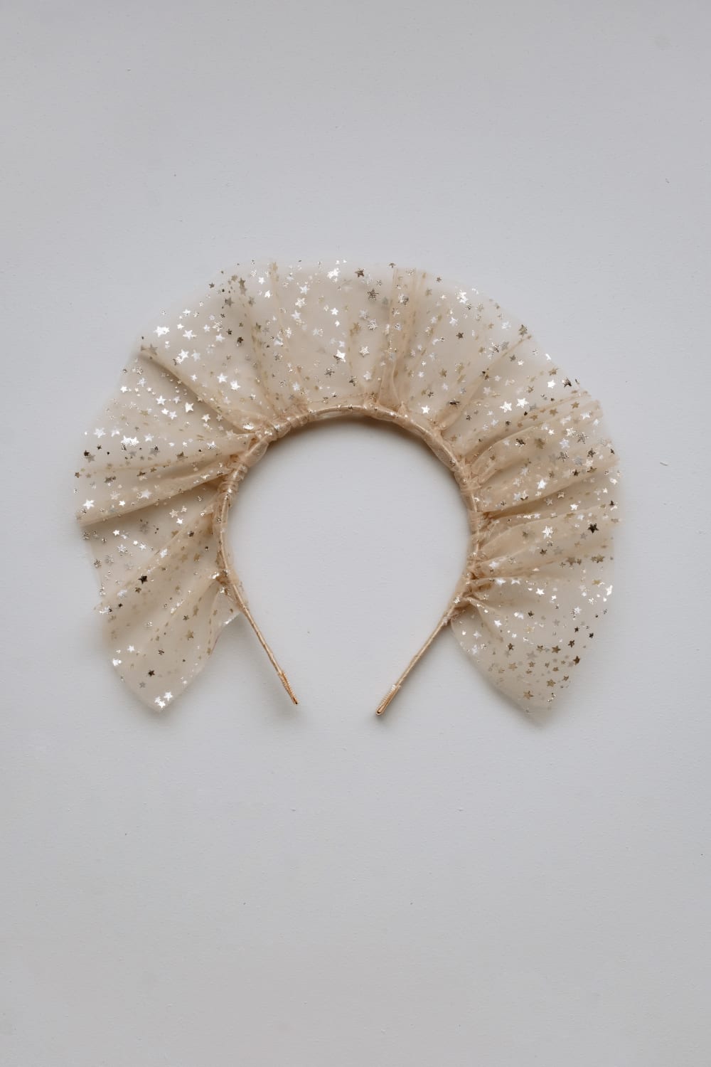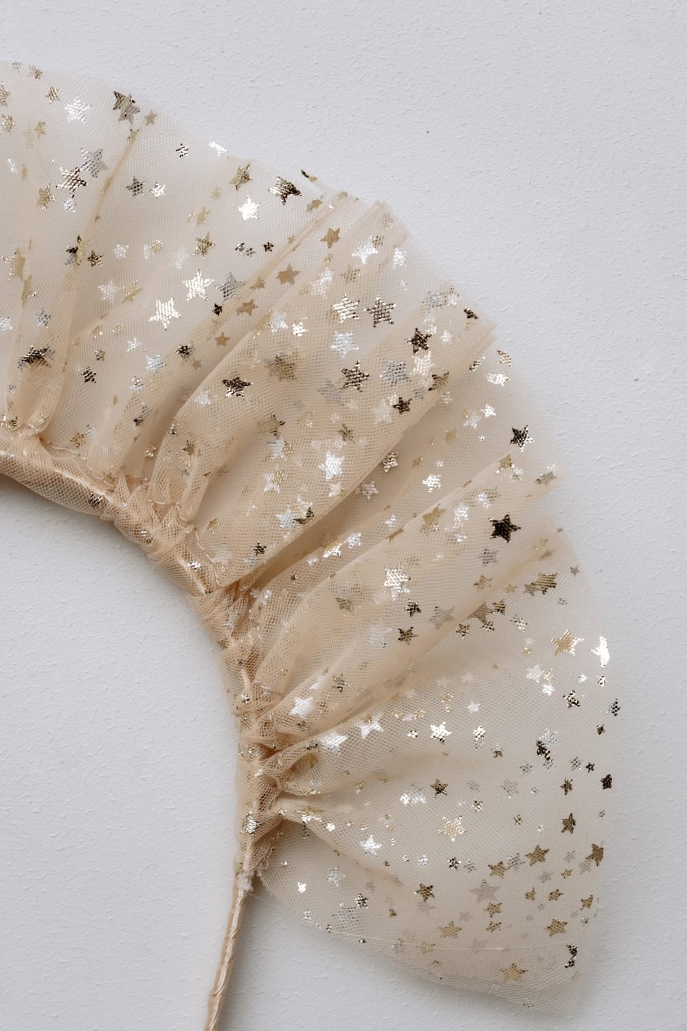 Altın rengi tül taç. Parlak yıldız figürlü ve simli. Elde üretim.