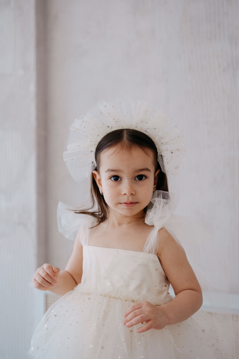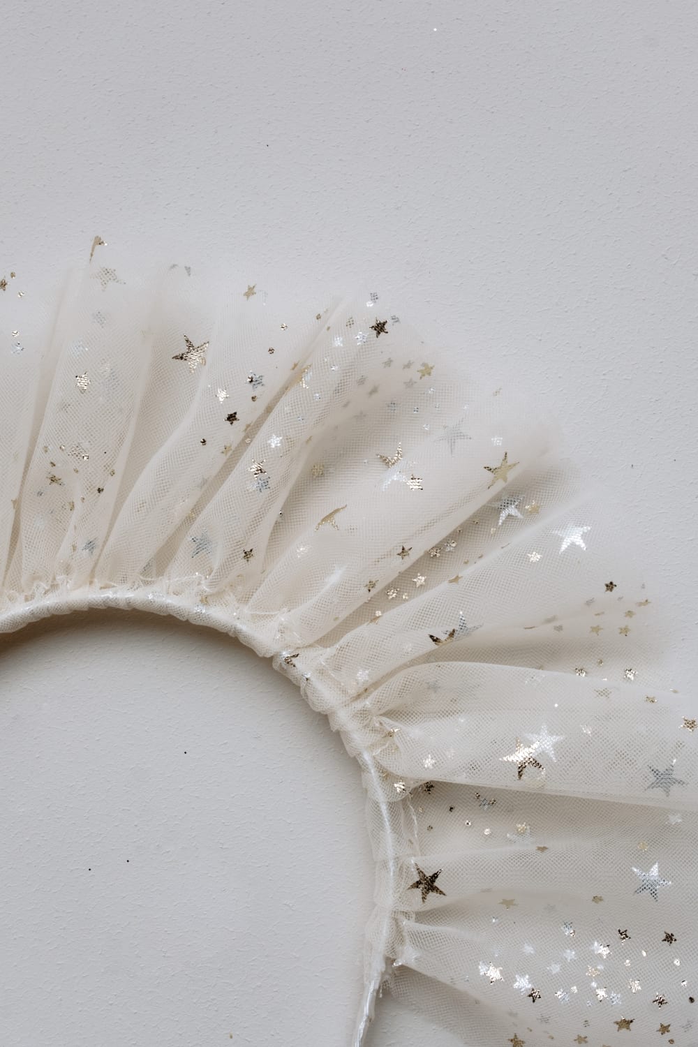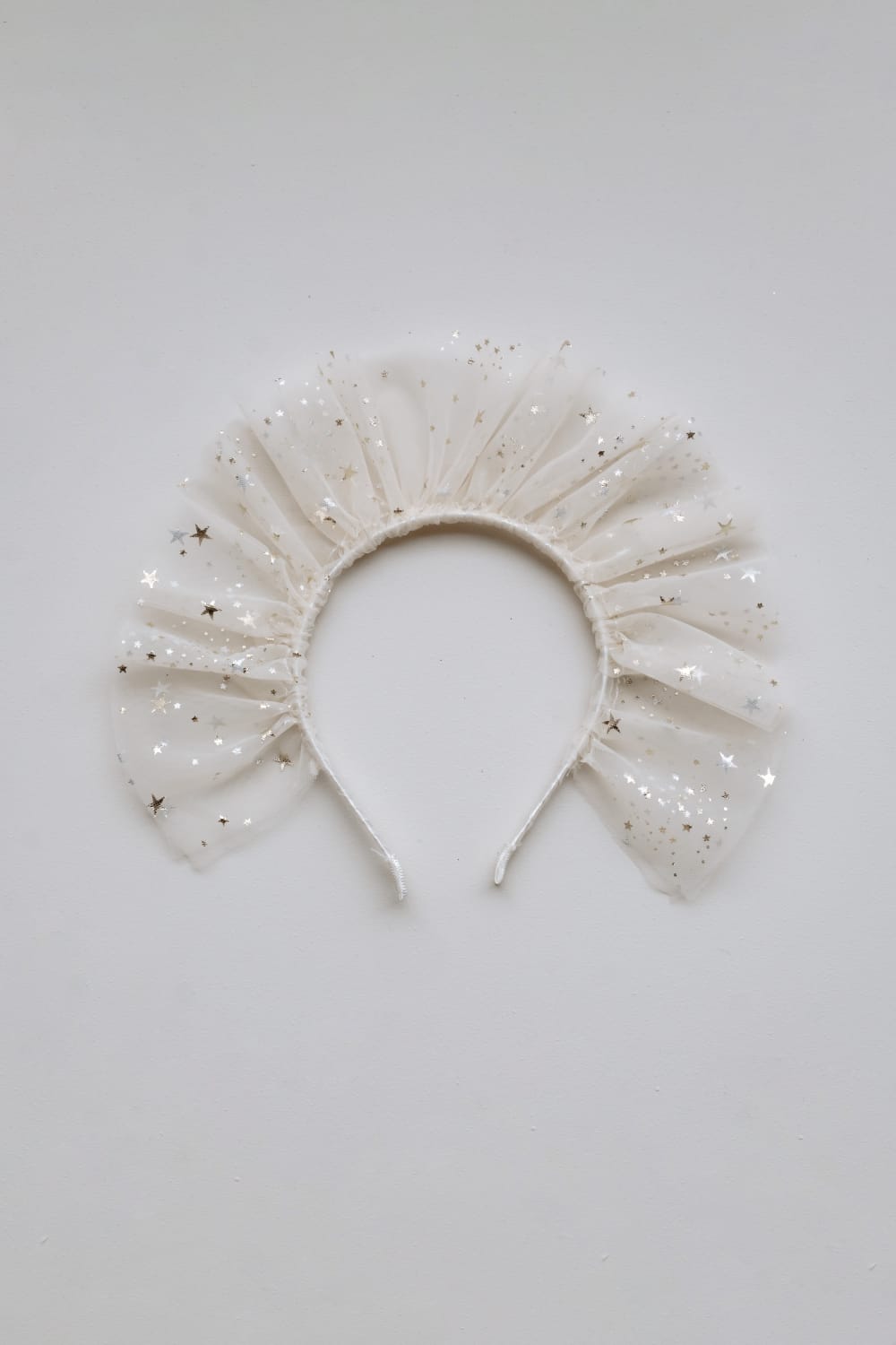 Parlak yıldız figürlü, beyaz tül taç. Elde üretim.