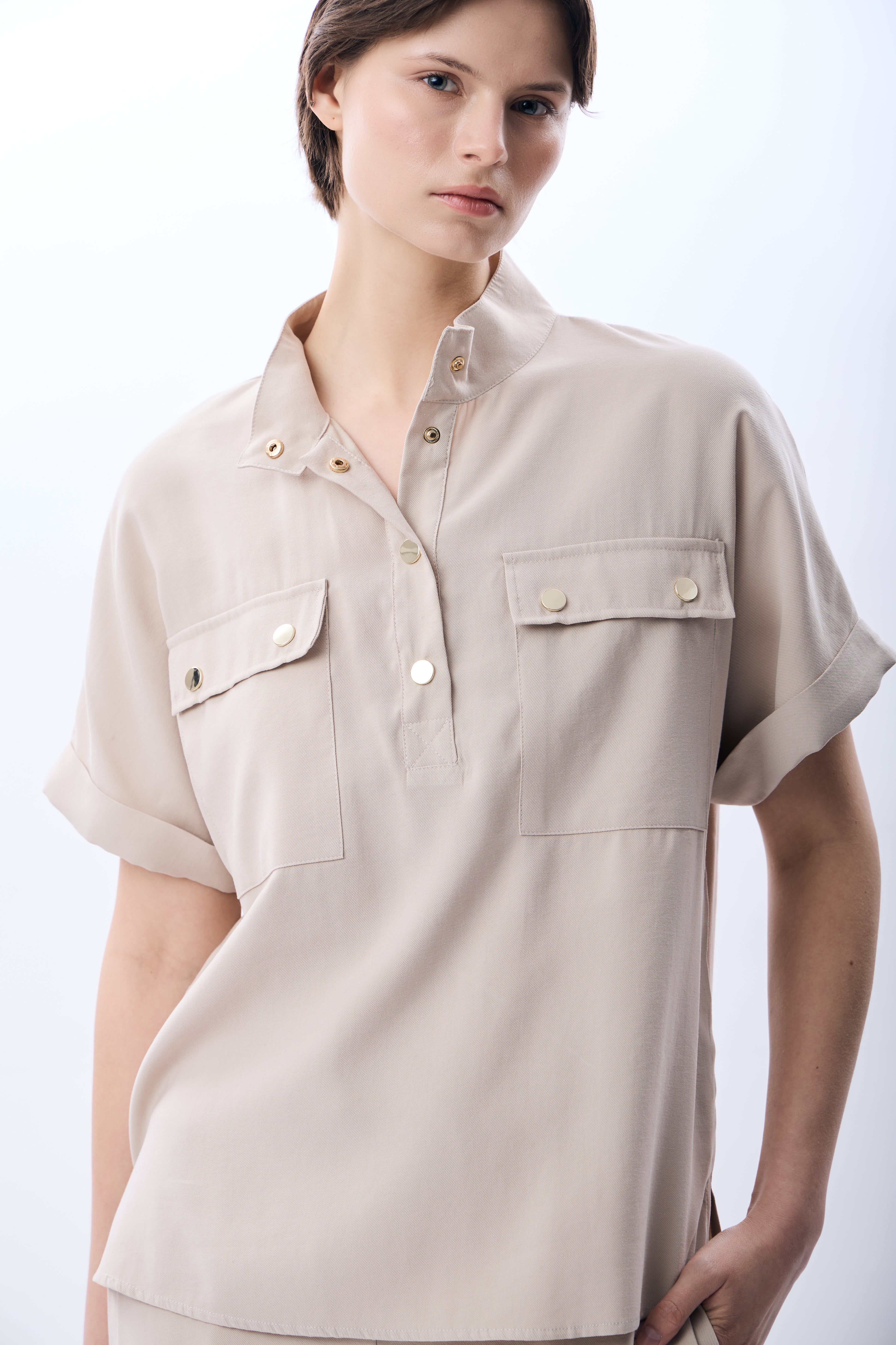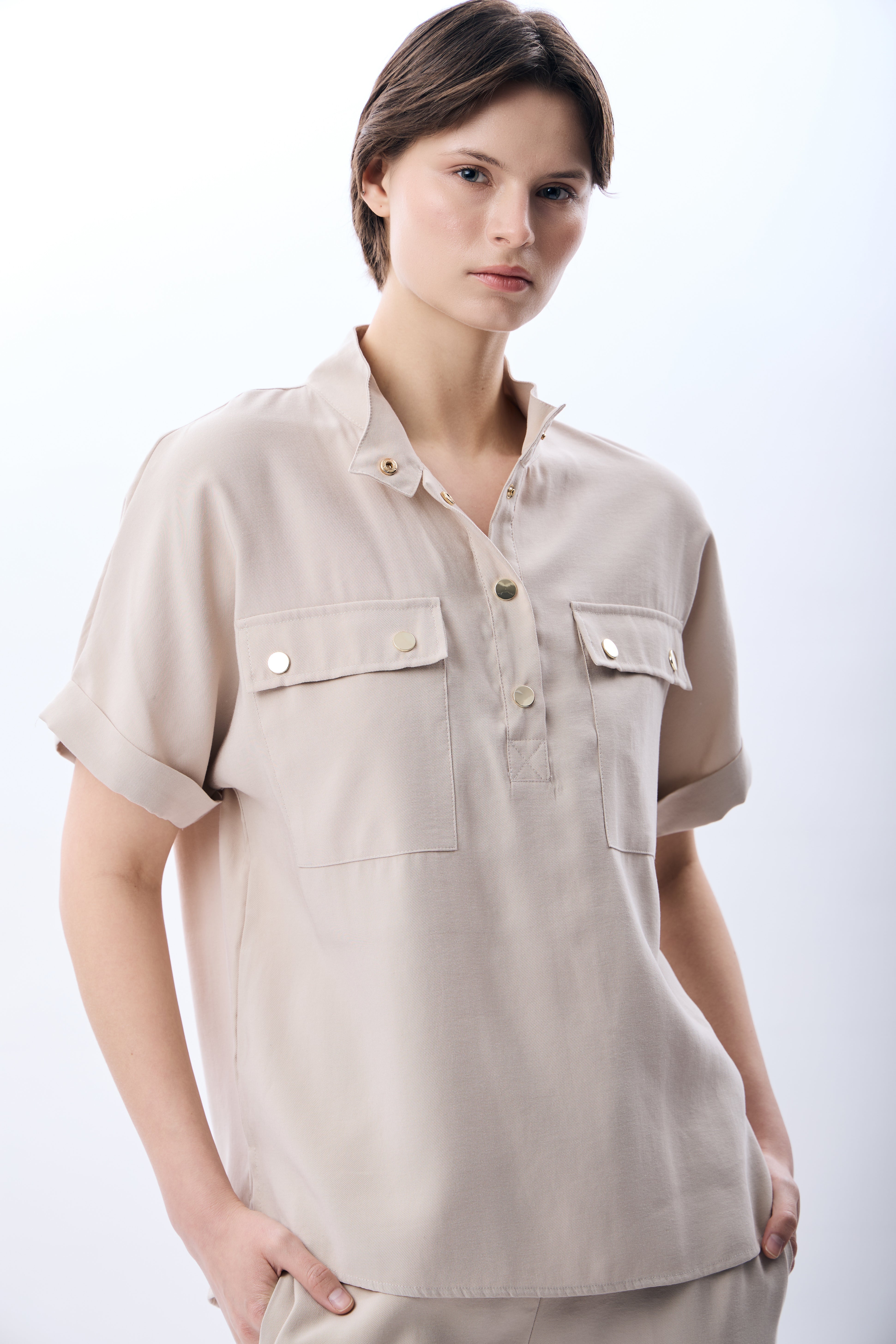 Model: Kısa kollu, açık yaka, yarım patlı ön kapama, kapaklı göğüs cepleri, metal düğme detaylı