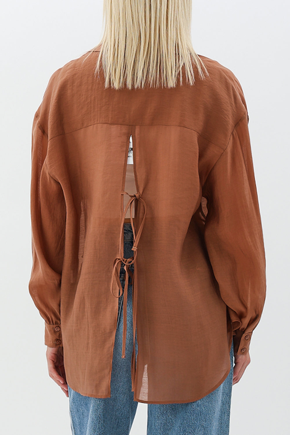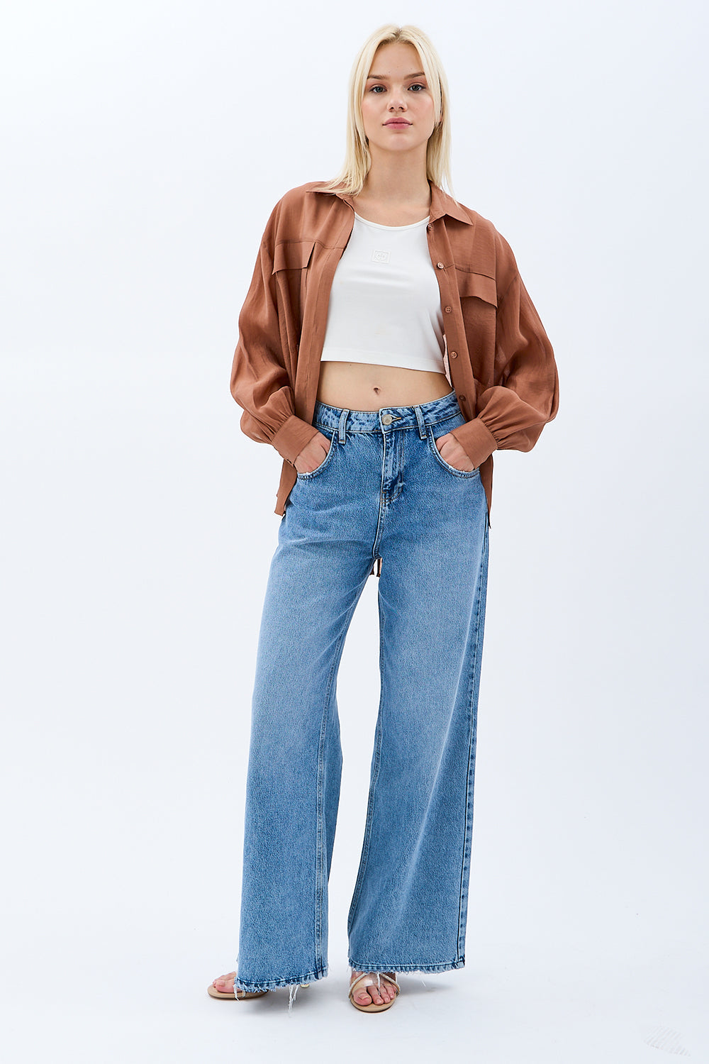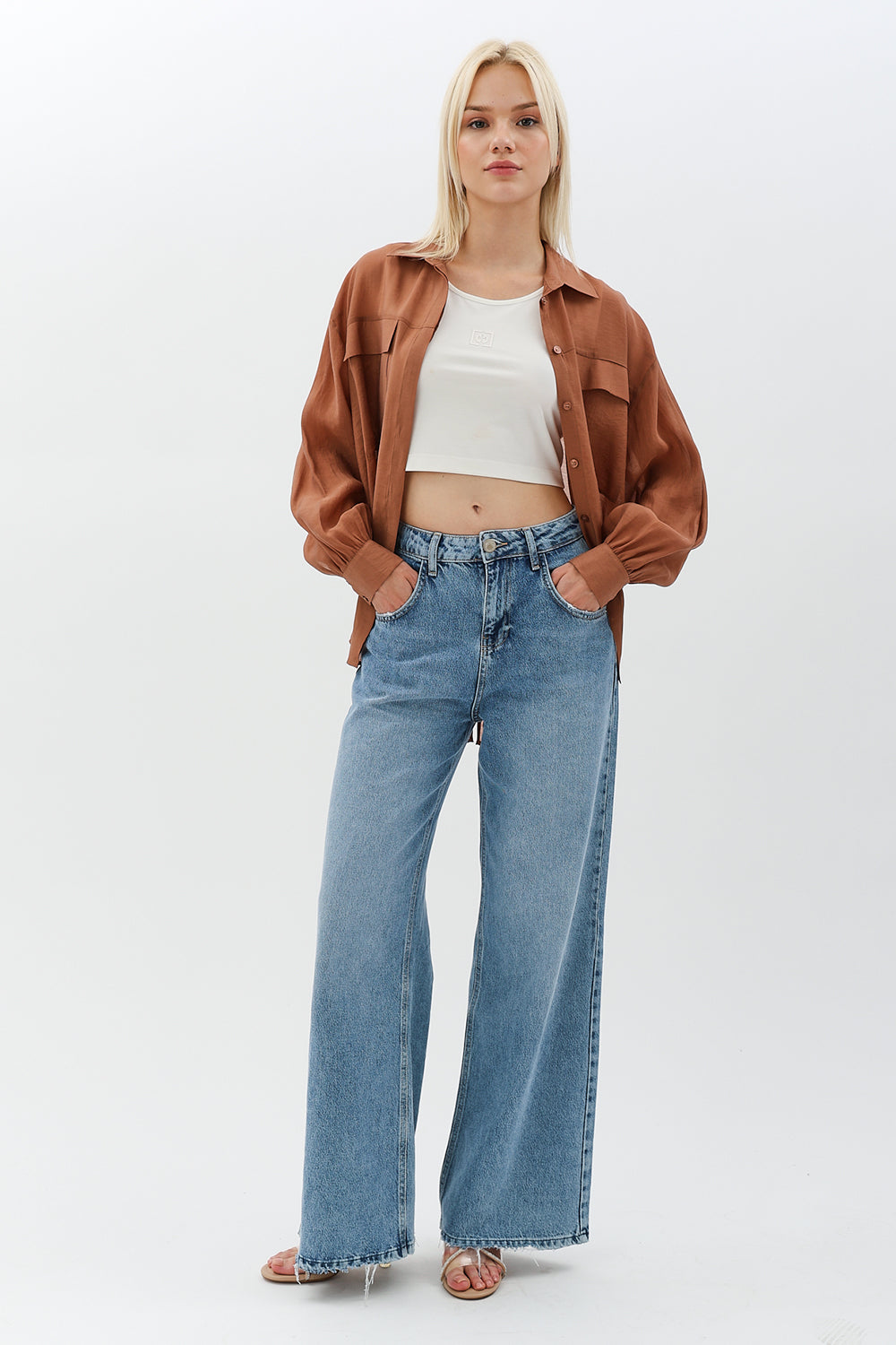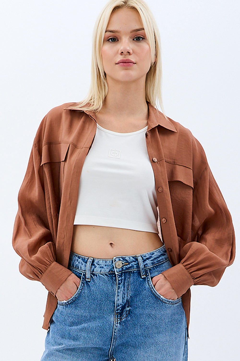 Bağlama Detaylı Modal Kadın Gömlek – Düşük Omuz, Kapaklı Cep ve Rahat Kesim