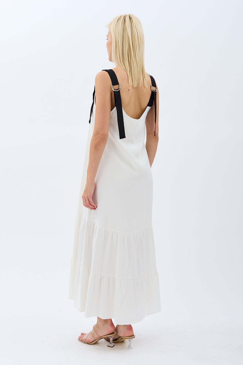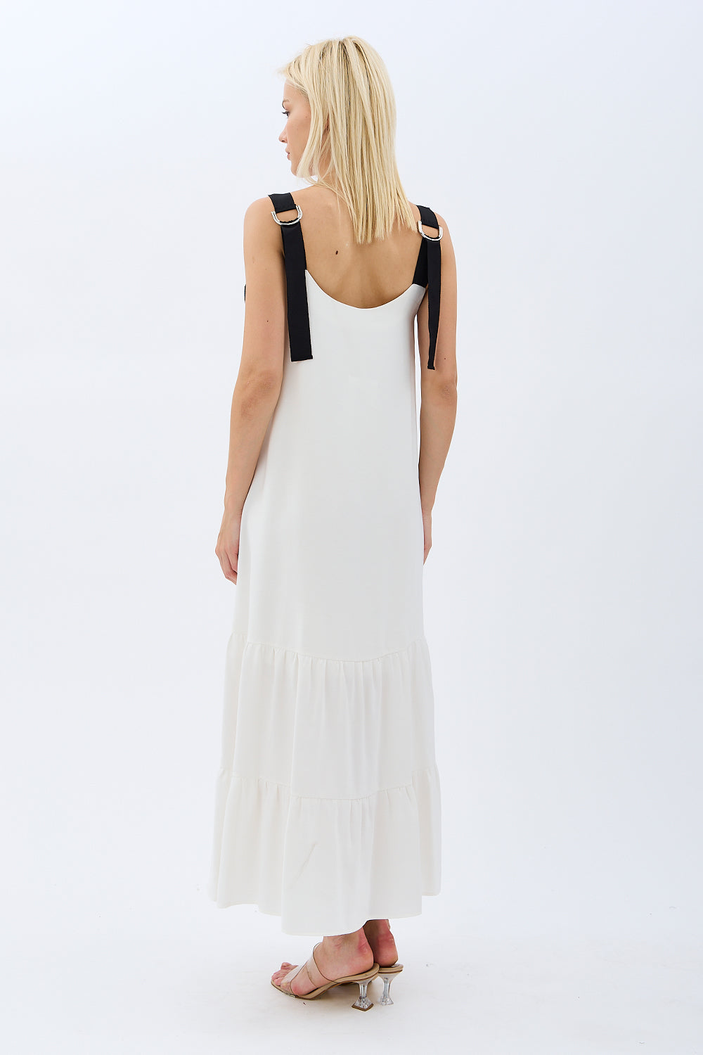 Model: Askılı, sırtı bağcıklı, kat kat kloş etek, diz altı boy, astarsız