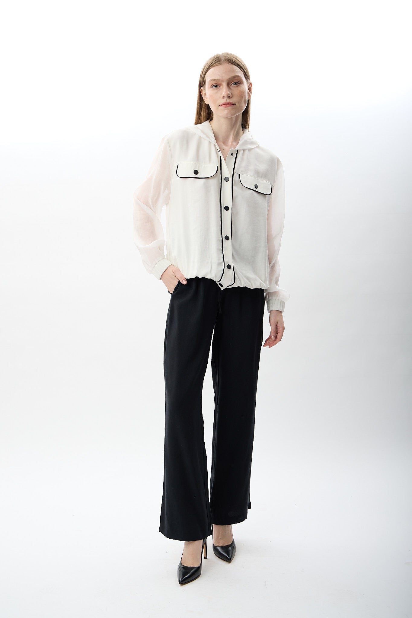 Modern detaylarla zenginleştirilmiş bu kapüşonlu gömlek, şıklığı ve fonksiyonelliği bir arada sunar. %90 modal ve %10 PA içeriği sayesinde yumuşak dokulu, hafif ve cilt dostudur. Uzun kollu yapısı transparan kumaşla bütünleşerek feminen ve sofistike bir görünüm kazandırır. Çıtçıt kapama detayları pratik kullanım sağlarken, ön cepleri fonksiyonellik katmaktadır. Kapüşon detayı ise sportif bir dokunuş sunarak, bu gömleği hem şehir stiline hem de günlük kombinlere uyumlu hale getirir.