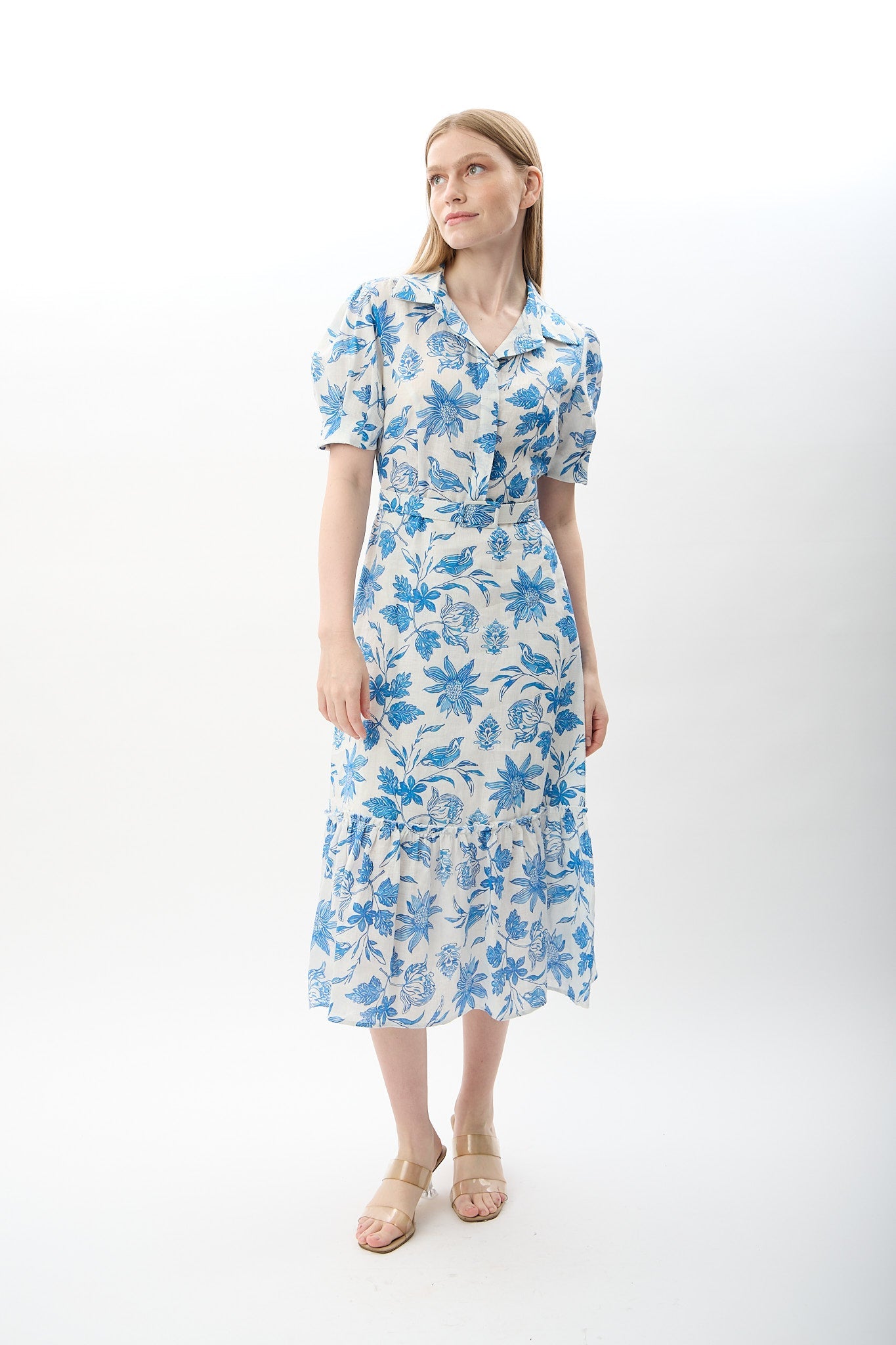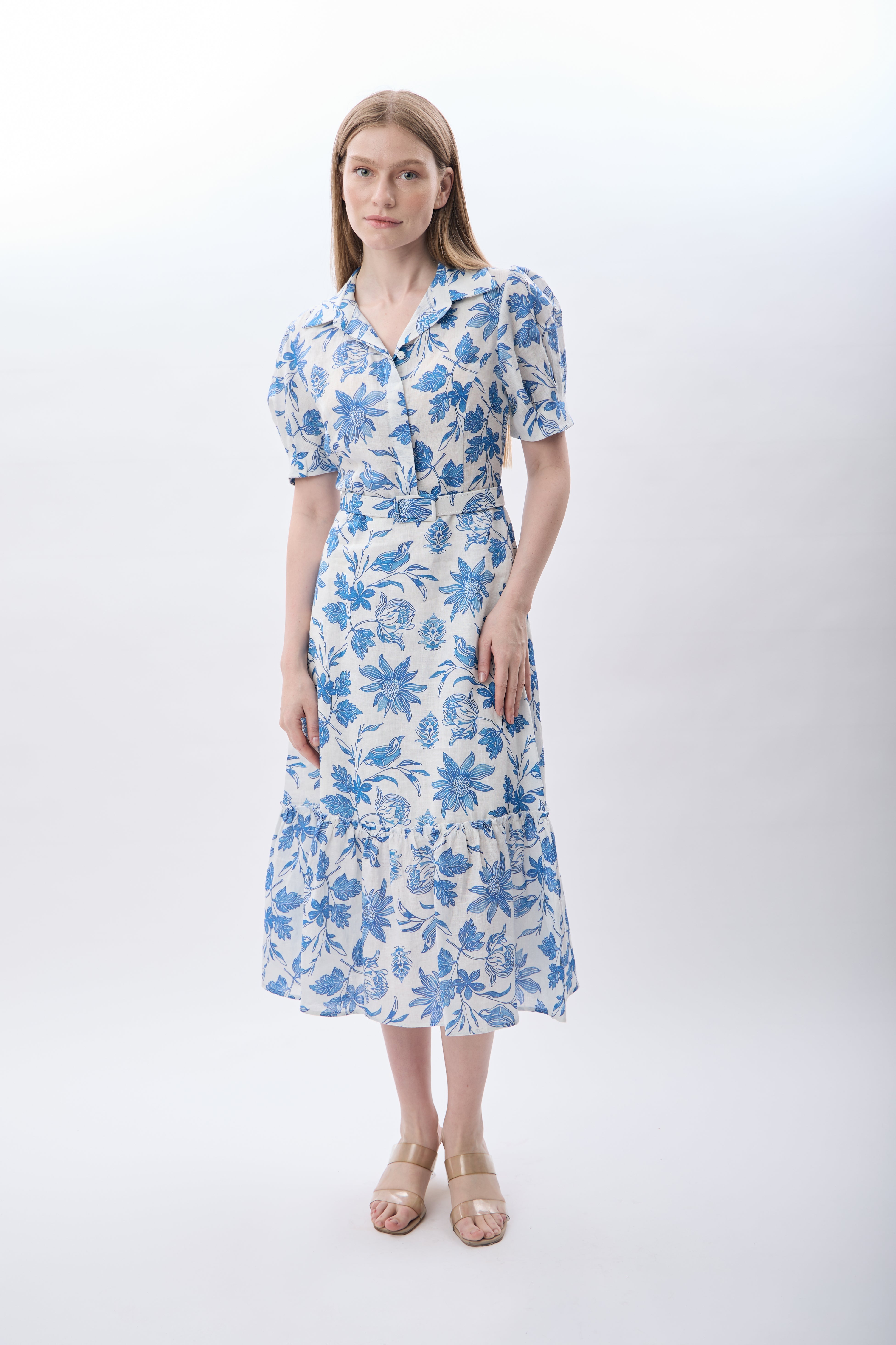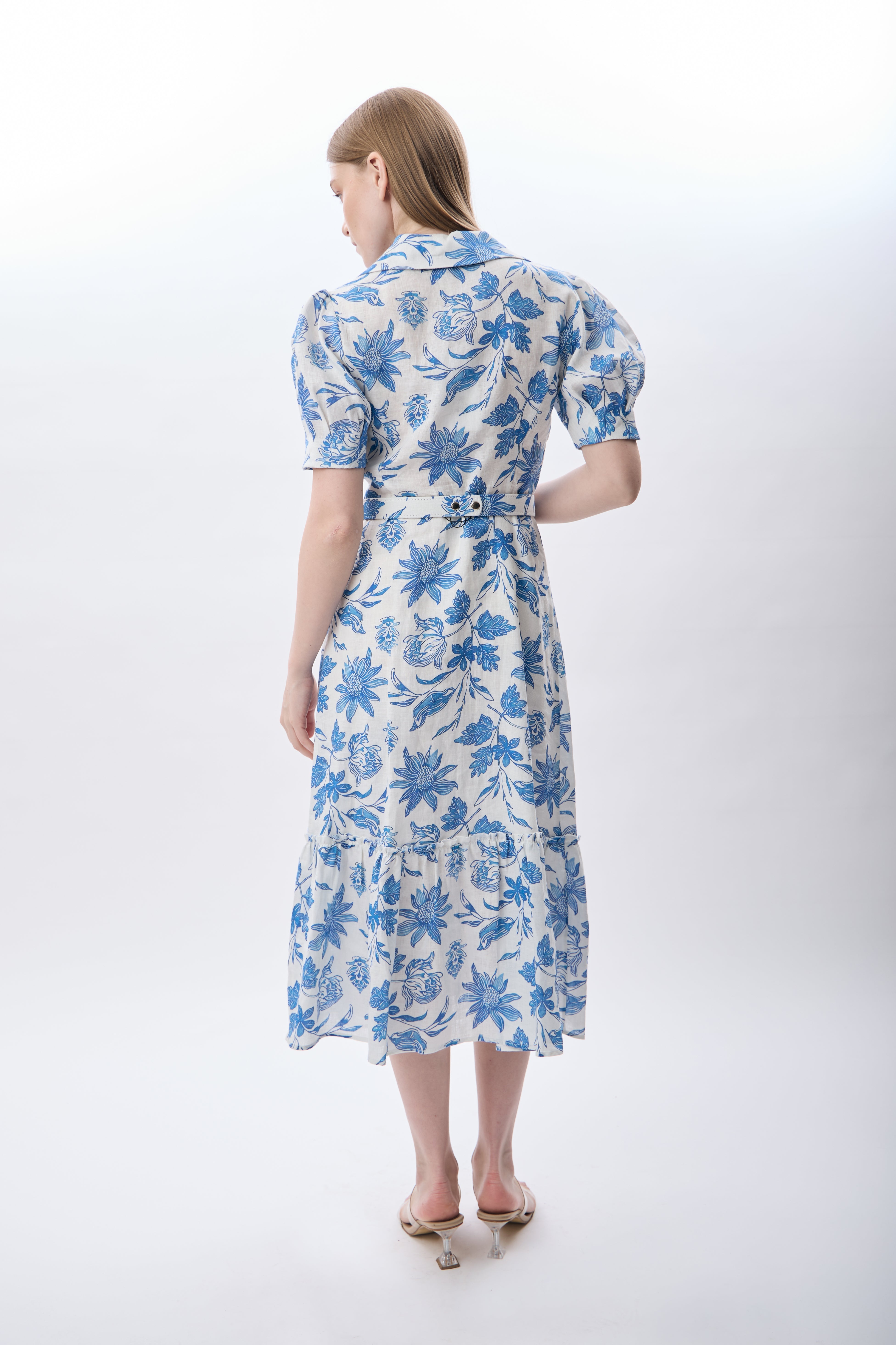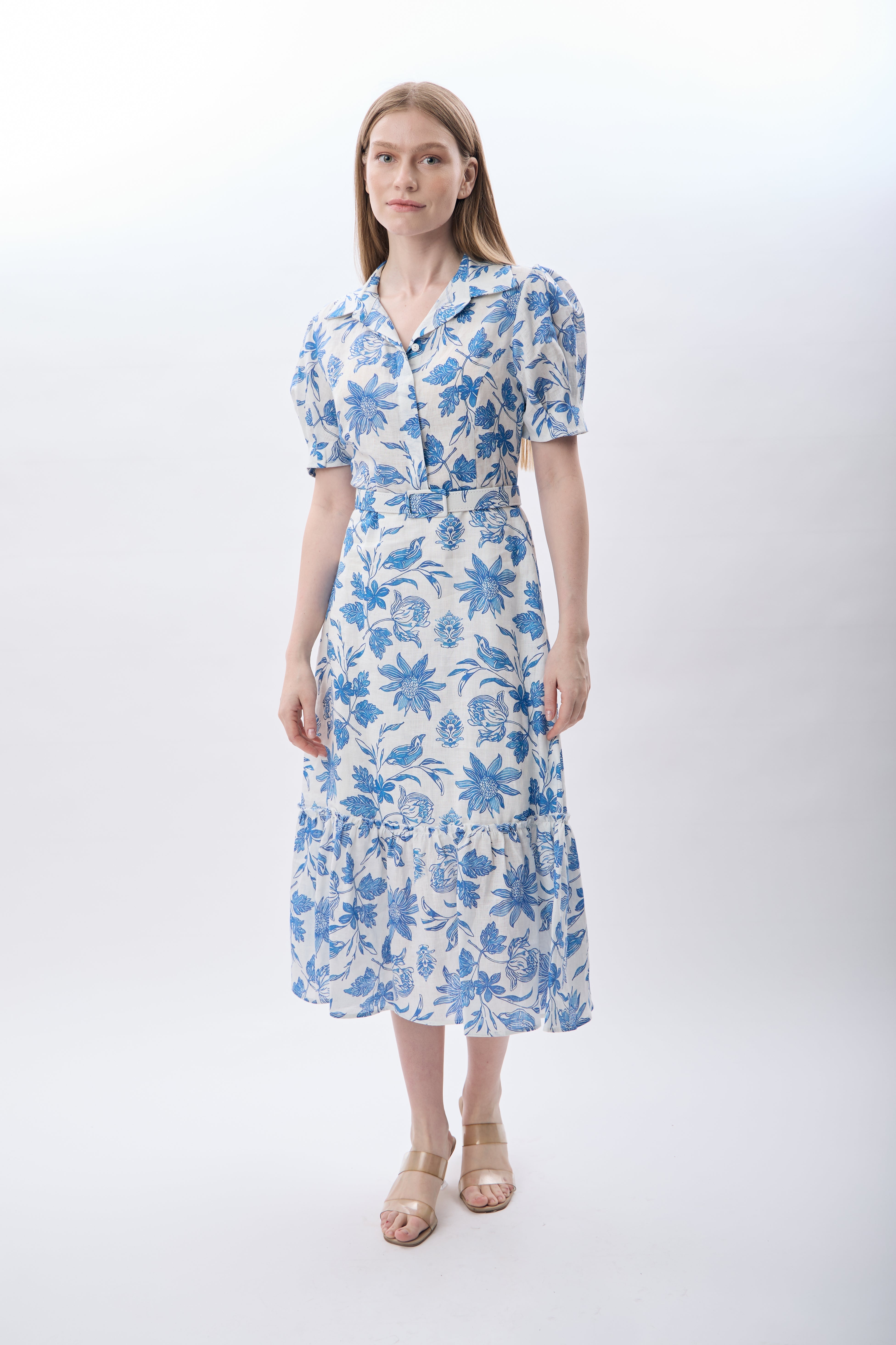 Mavi Çiçek Desenli Kemerli Elbise (Ekru)