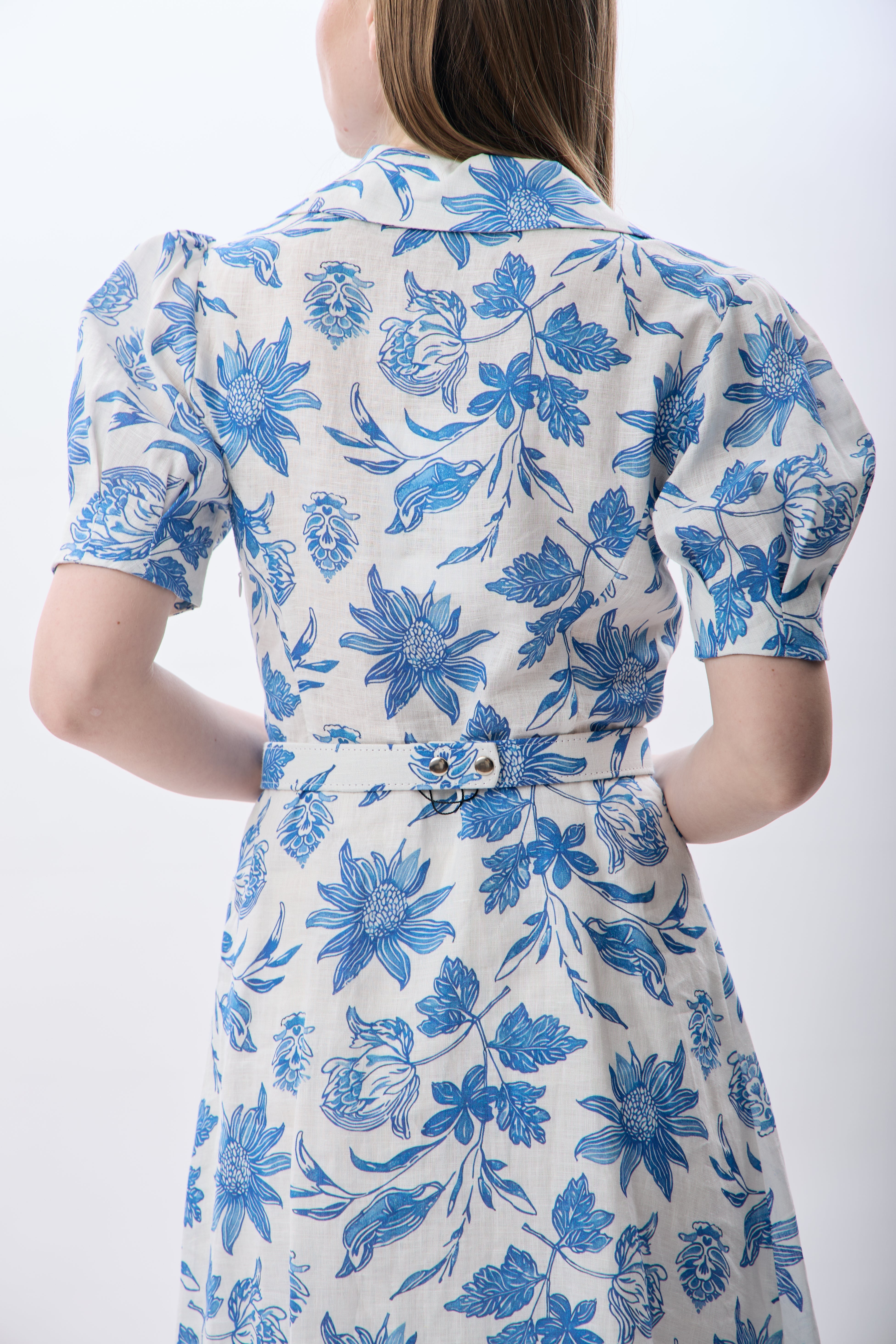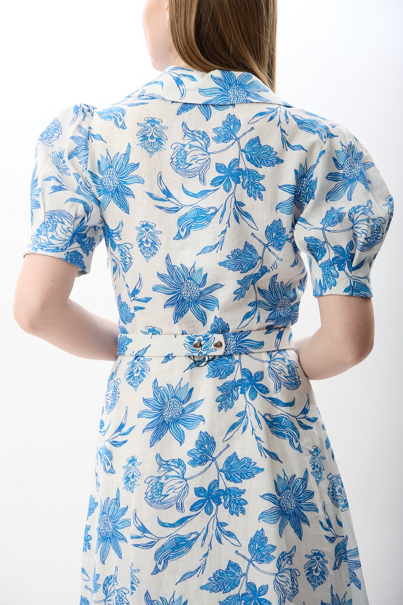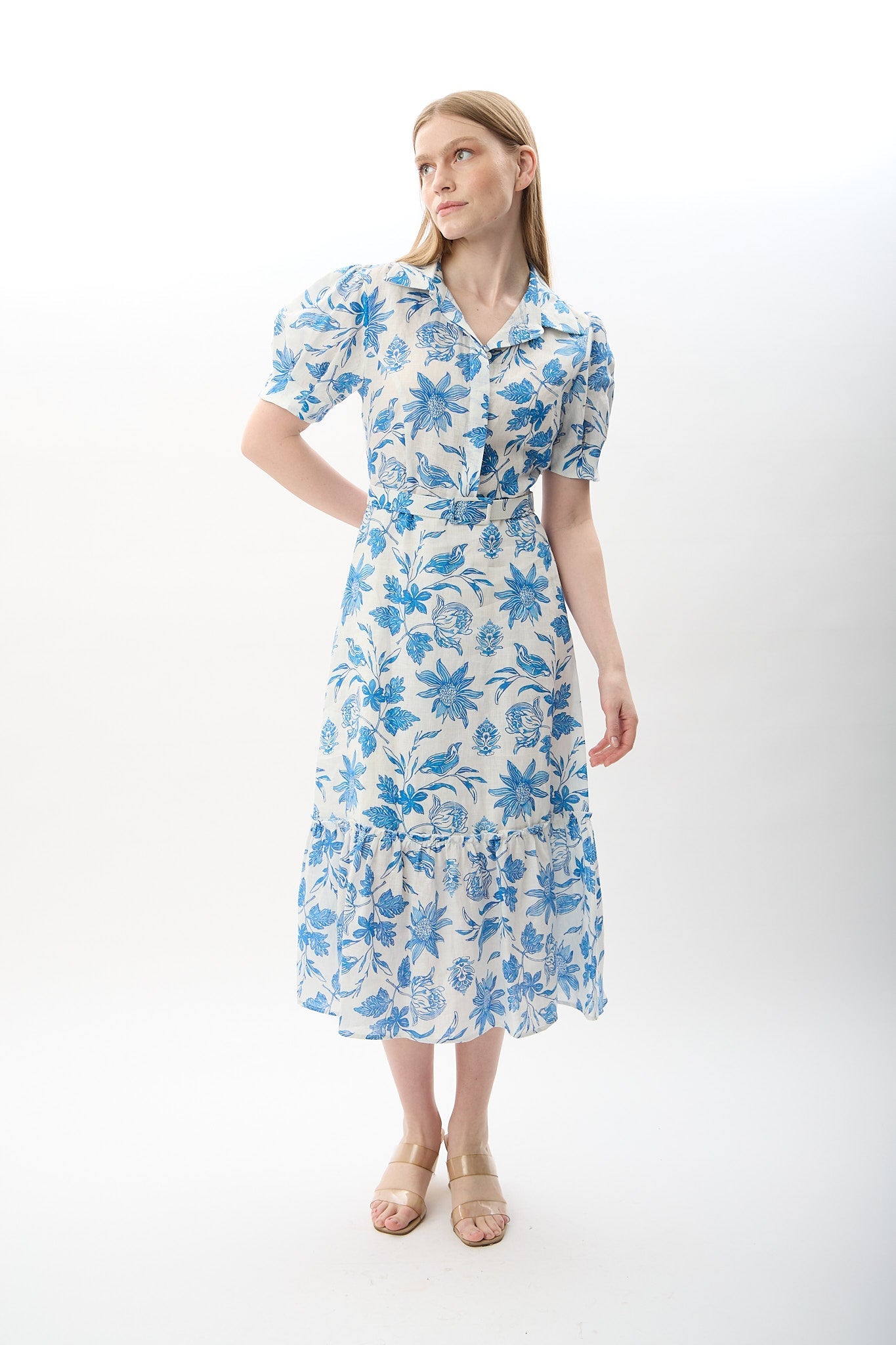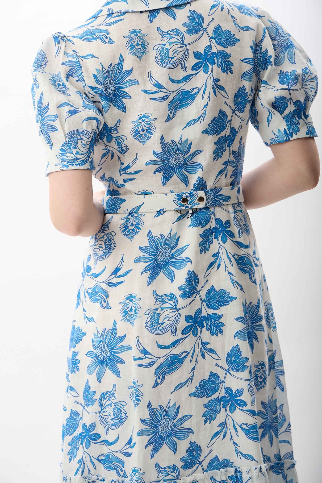 Mavi Çiçek Desenli Kemerli Elbise (Ekru)