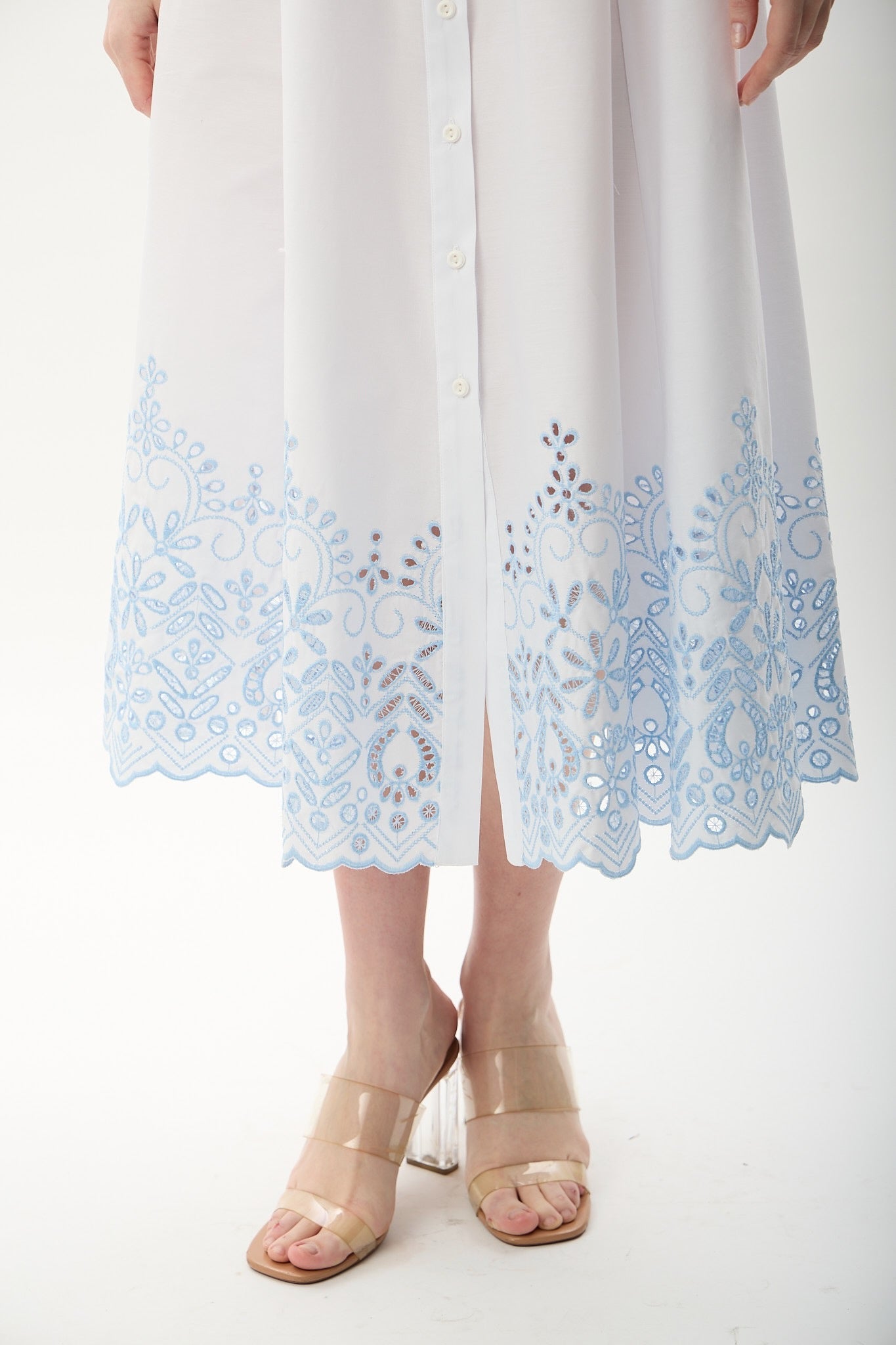 Poplin kumaştan üretilen bu maxi boy gömlek elbise, nakış detaylı yakası ve lazer kesim nakışlı etek ucu ile şıklığı ve zarafeti bir arada sunar. Rahat kesimiyle konforlu kullanım sağlar. %100 pamuk kumaşı, hafif ve nefes alabilen yapısıyla günlük kullanıma uygundur.