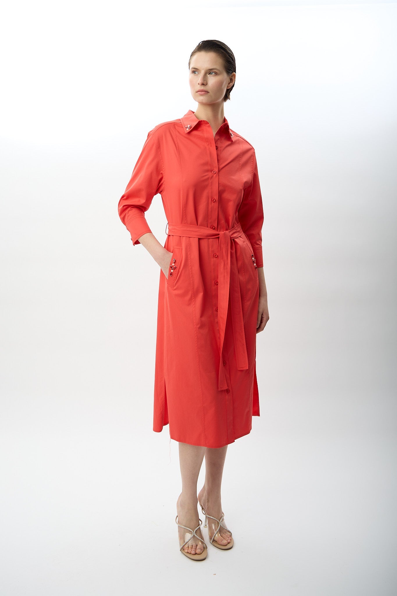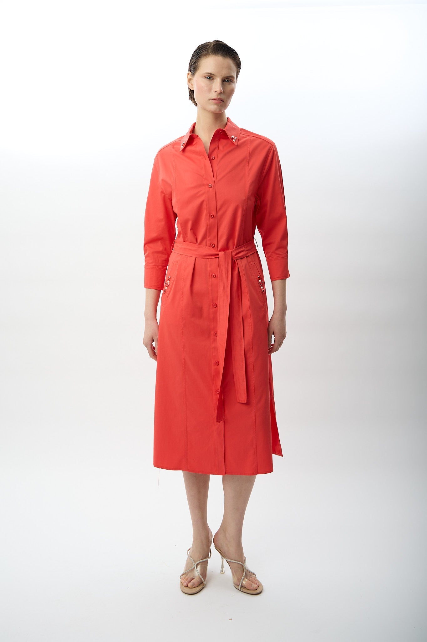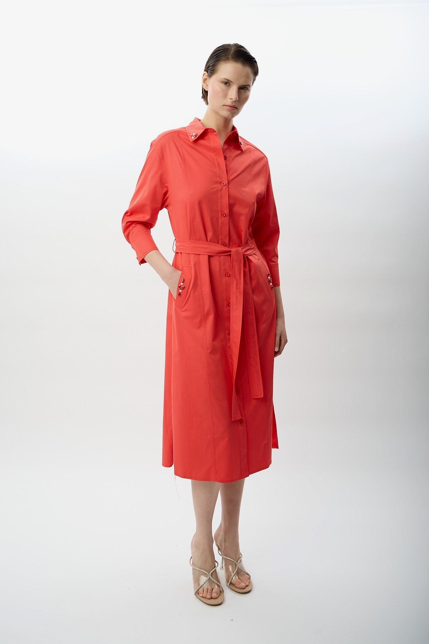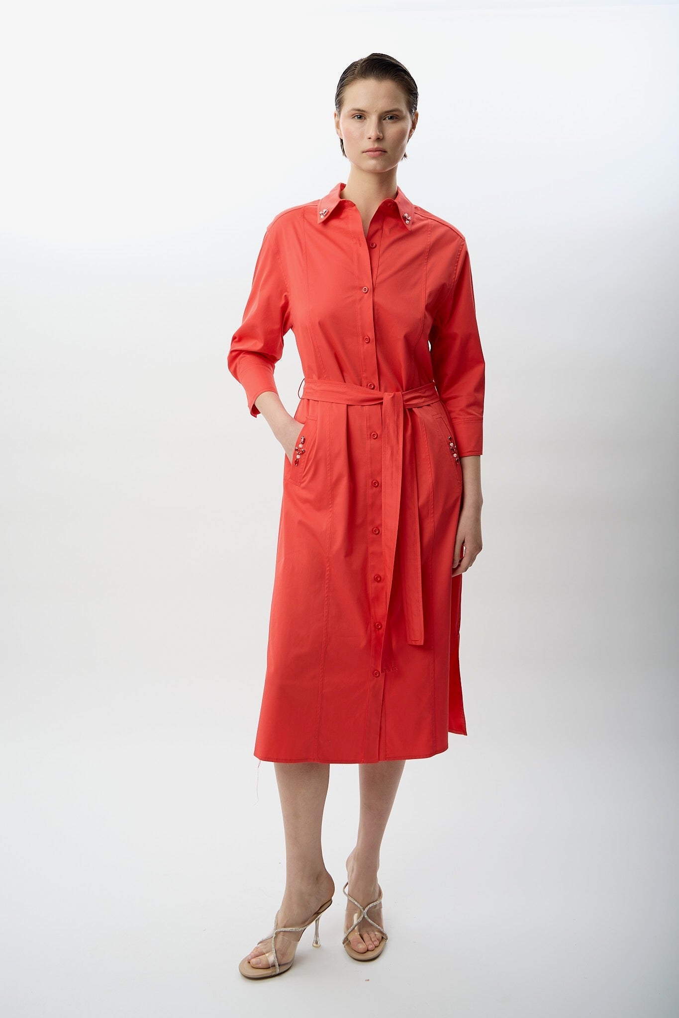 Şıklığı ve detaylarıyla öne çıkan bu kadın elbise, cep ve yakada yer alan taş süslemeleriyle zarif bir görünüm sunar. Boydan düğmeli tasarımı ve truvakar kolları ile feminen bir stil yaratır. Kuşak kemer detayı bele hoş bir vurgu yaparken, regular kalıp rahat ve kullanışlı bir kullanım sağlar.