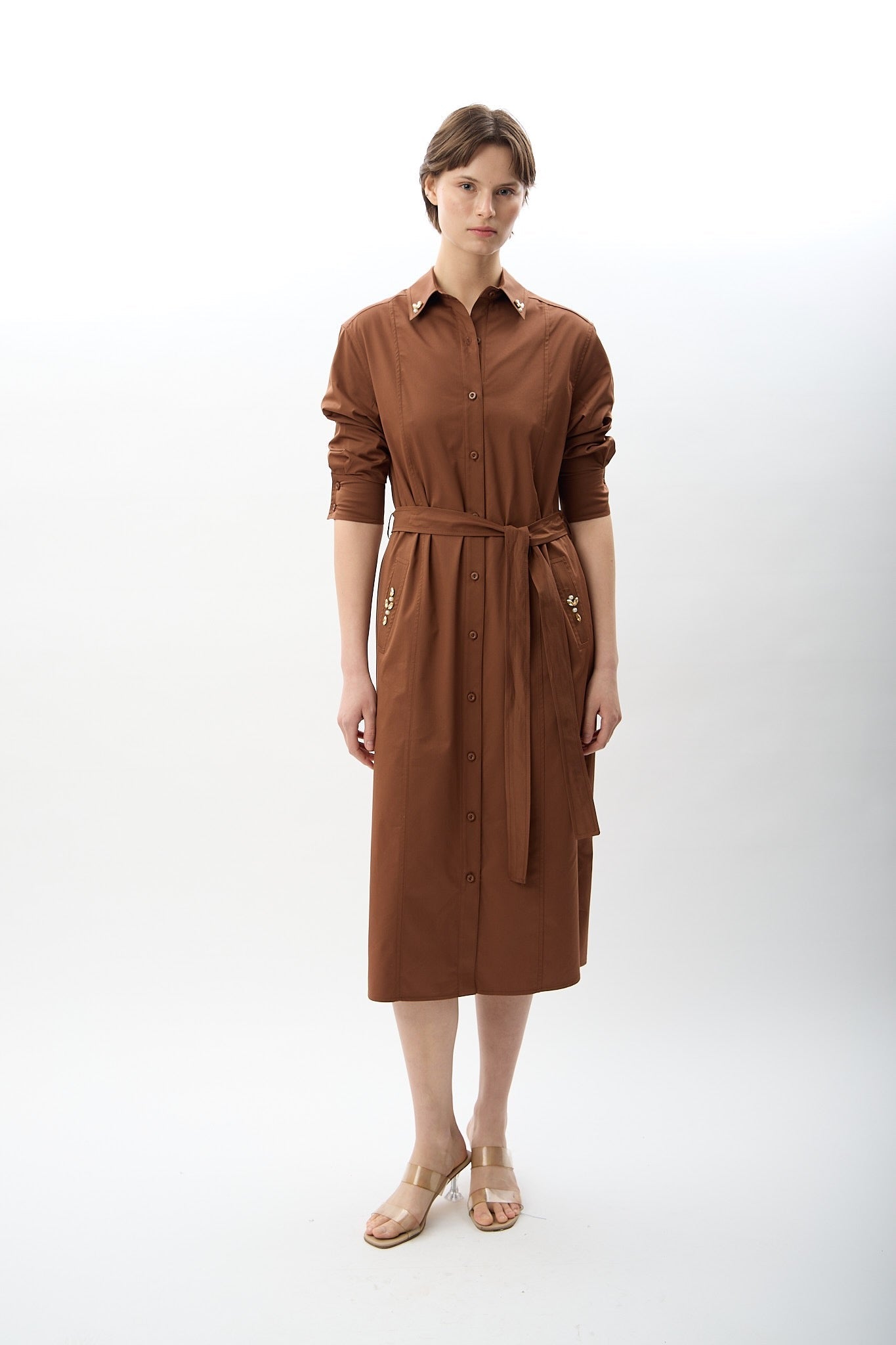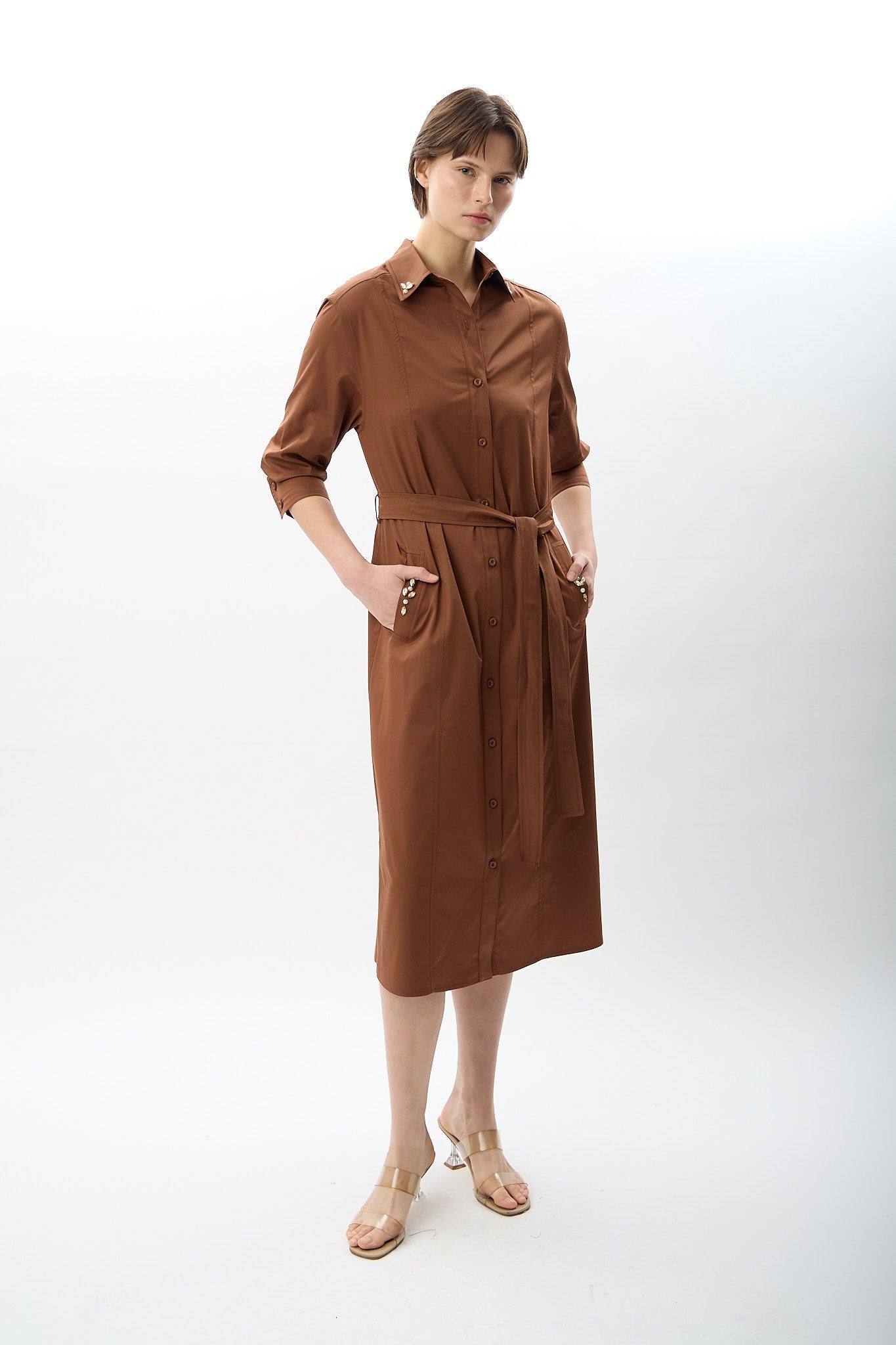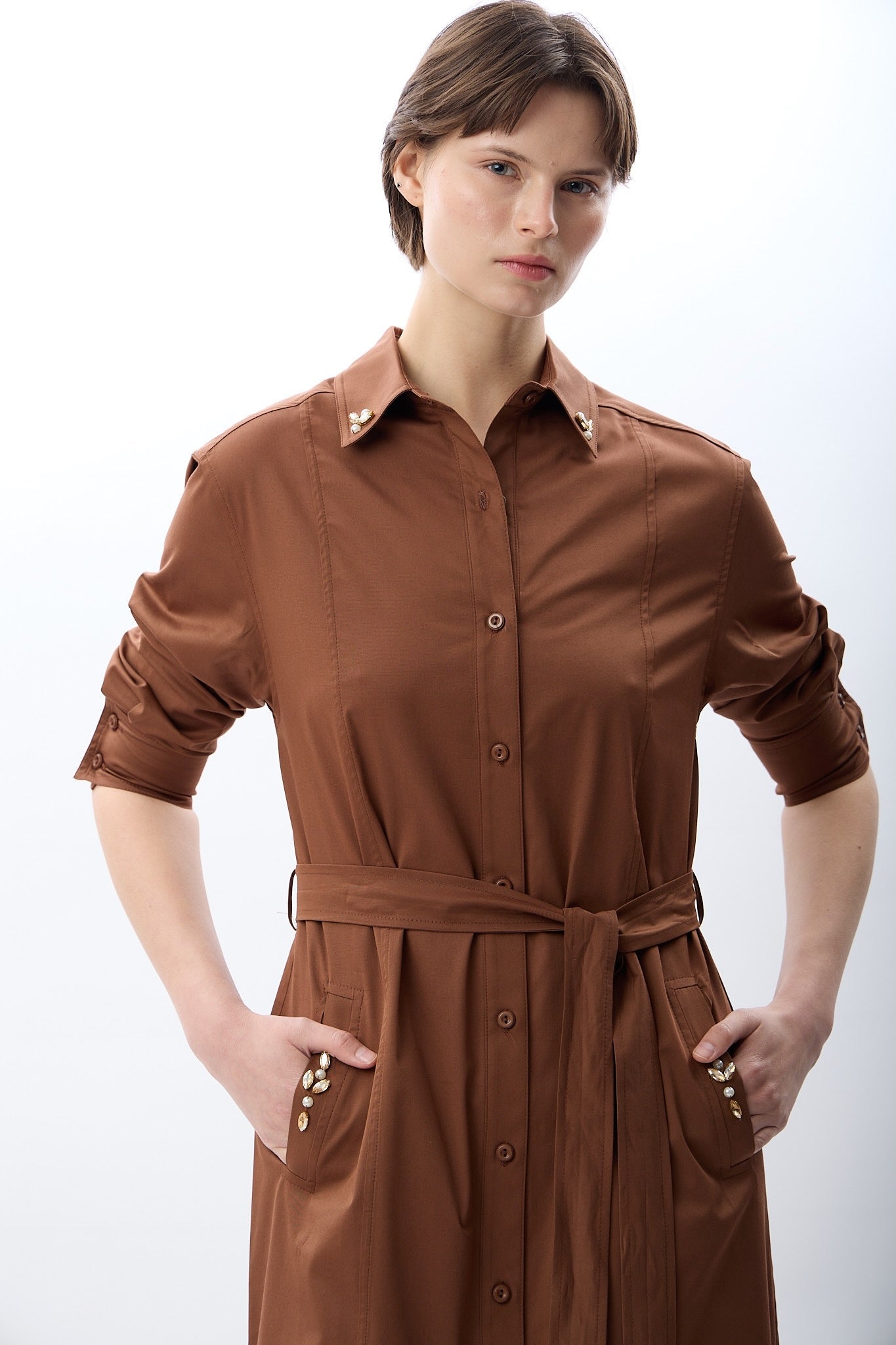 Şıklığı ve detaylarıyla öne çıkan bu kadın elbise, cep ve yakada yer alan taş süslemeleriyle zarif bir görünüm sunar. Boydan düğmeli tasarımı ve truvakar kolları ile feminen bir stil yaratır. Kuşak kemer detayı bele hoş bir vurgu yaparken, regular kalıp rahat ve kullanışlı bir kullanım sağlar.
