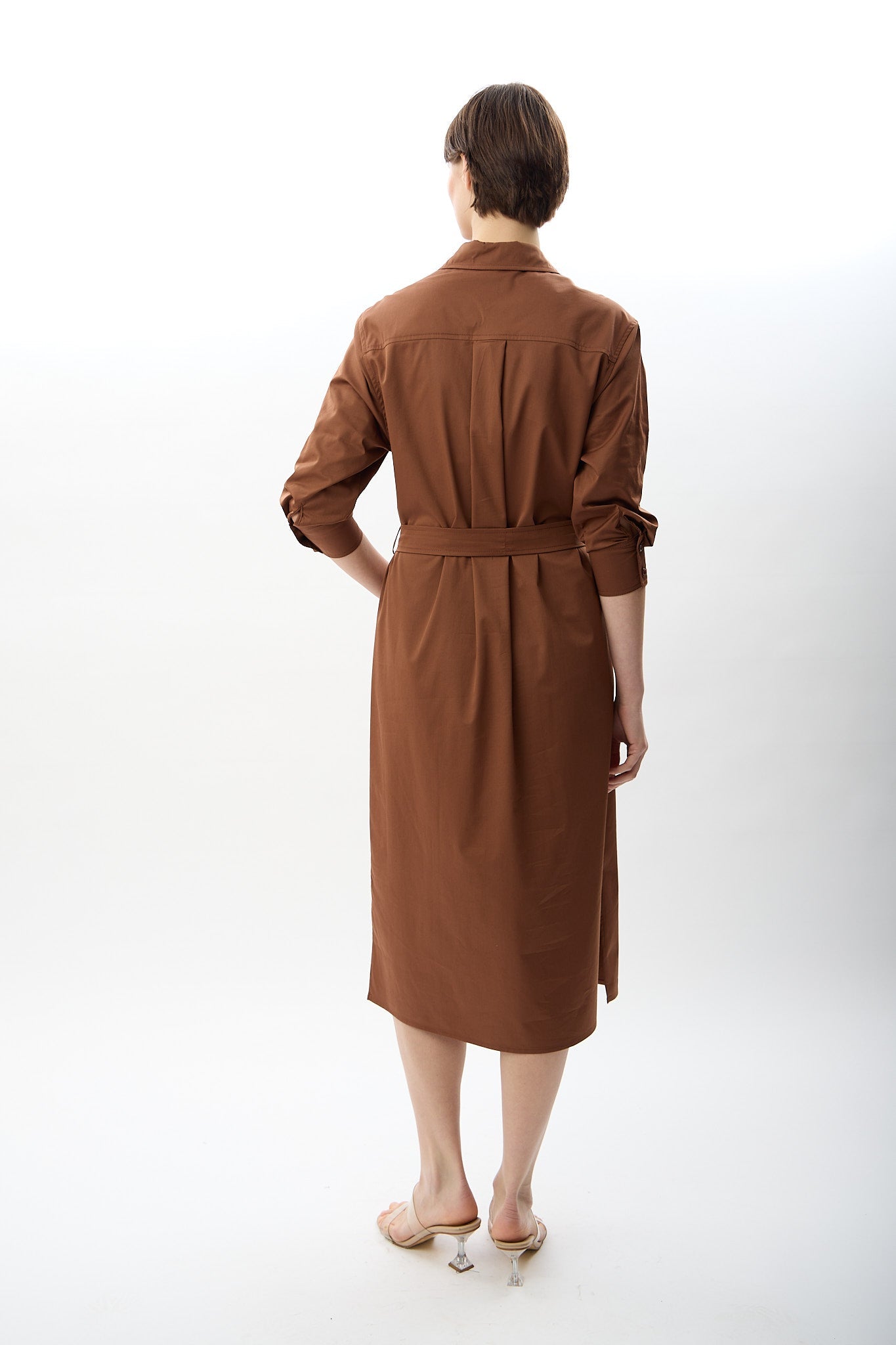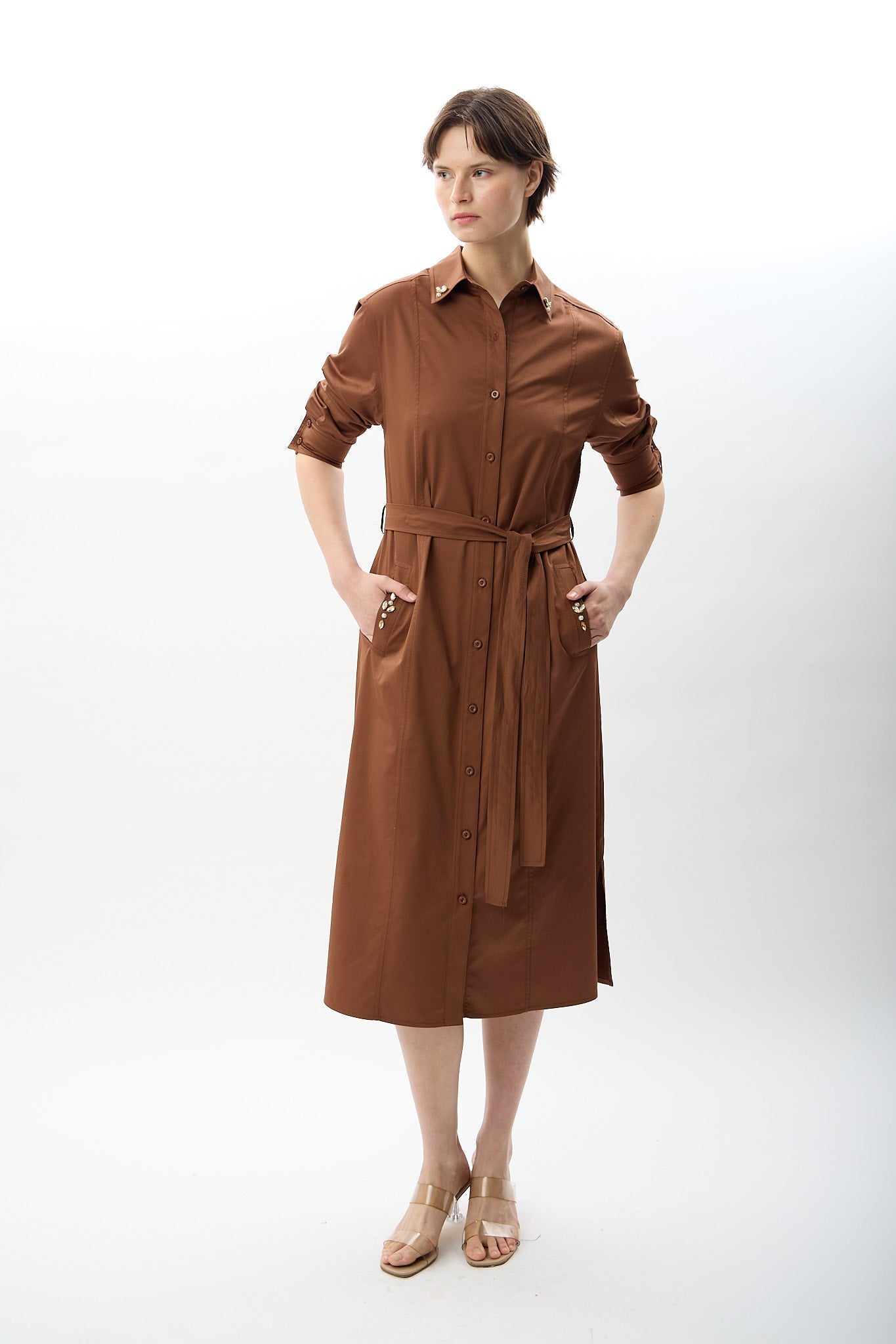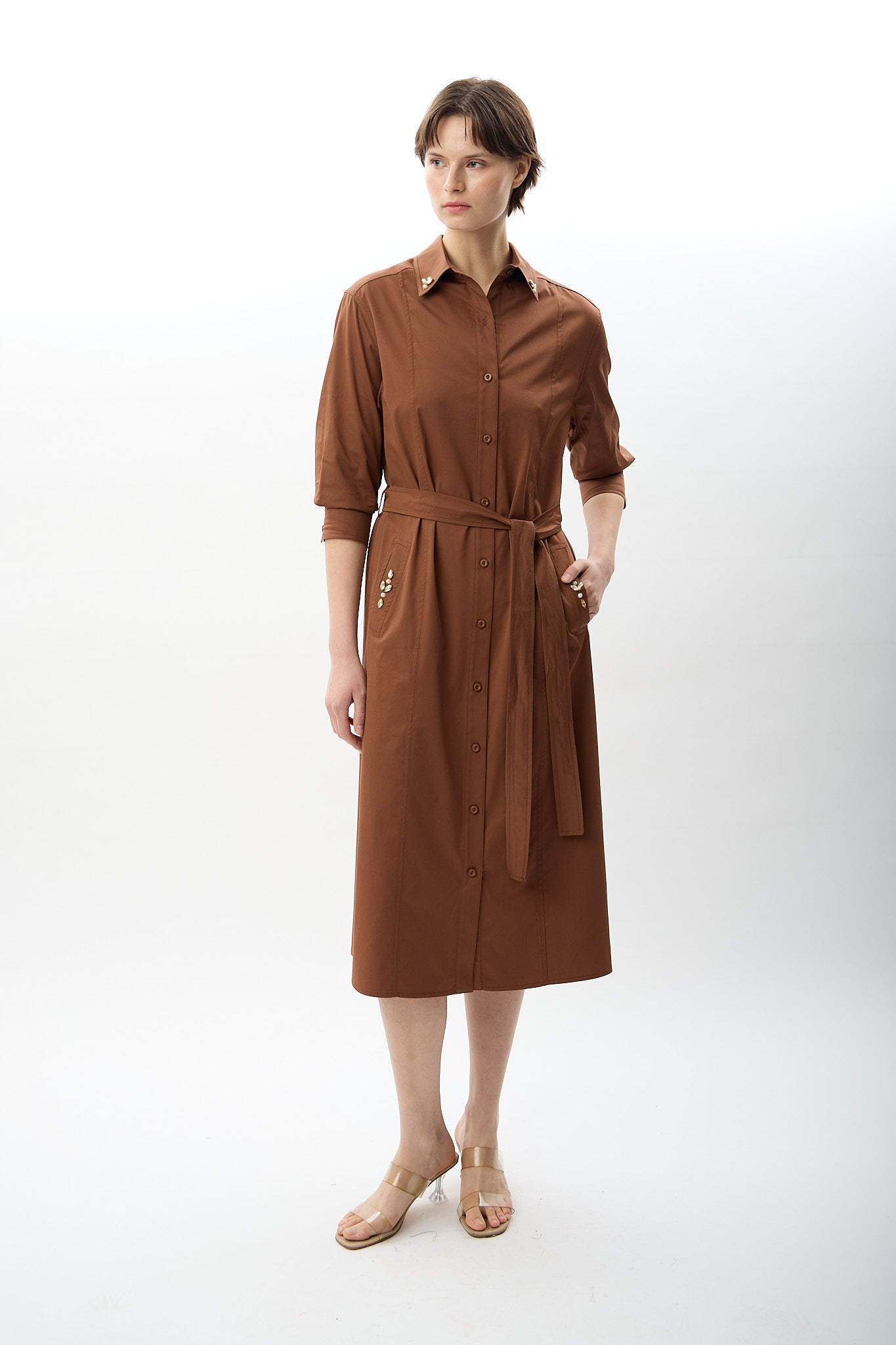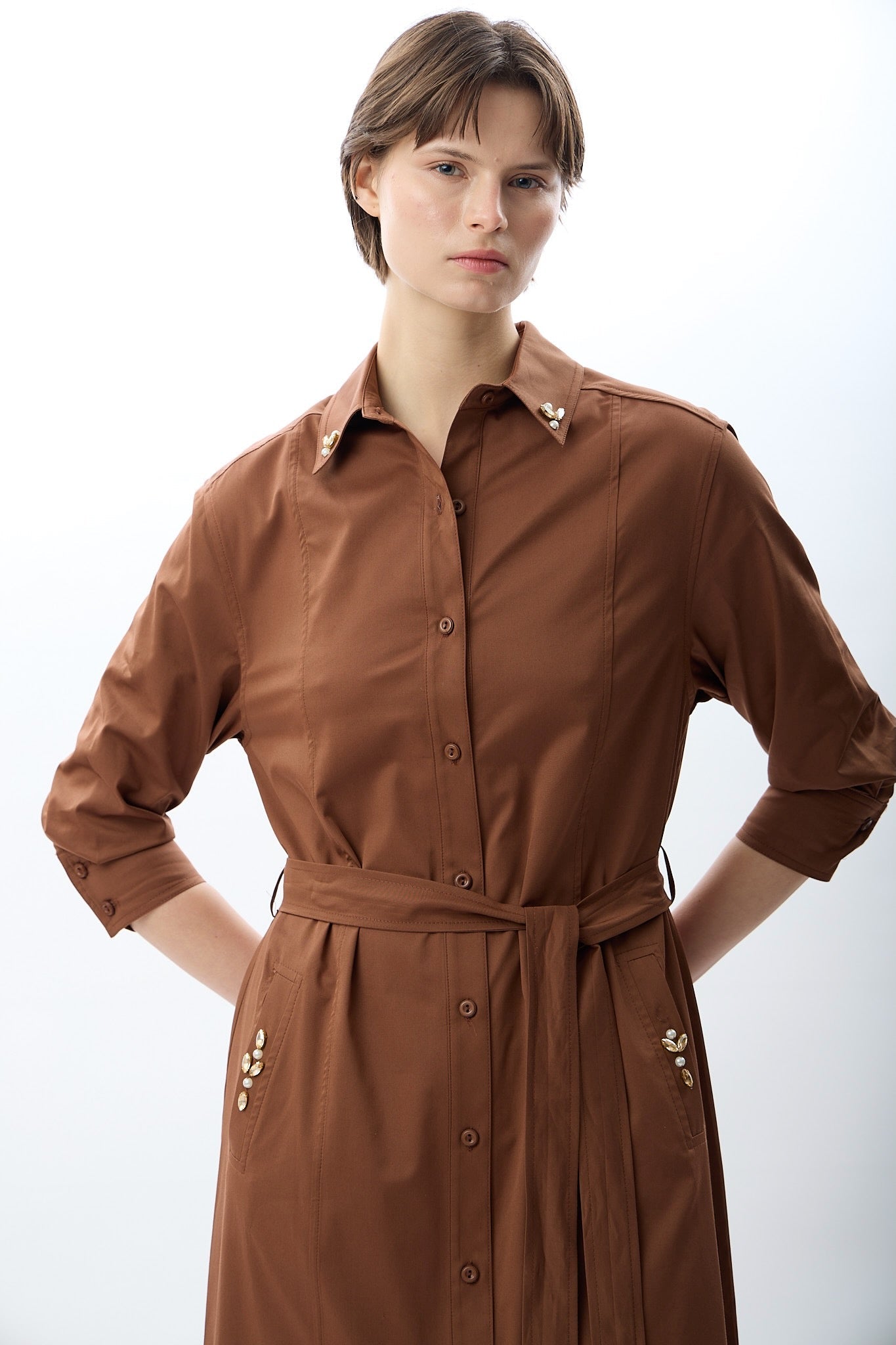 Şıklığı ve detaylarıyla öne çıkan bu kadın elbise, cep ve yakada yer alan taş süslemeleriyle zarif bir görünüm sunar. Boydan düğmeli tasarımı ve truvakar kolları ile feminen bir stil yaratır. Kuşak kemer detayı bele hoş bir vurgu yaparken, regular kalıp rahat ve kullanışlı bir kullanım sağlar.