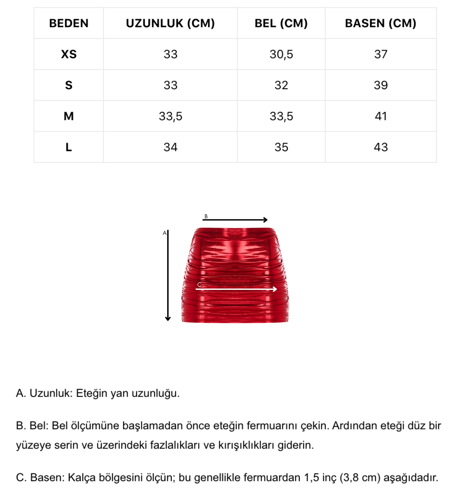 XS: Göğüs 78–82 / Bel 60–64 / Basen 86–90