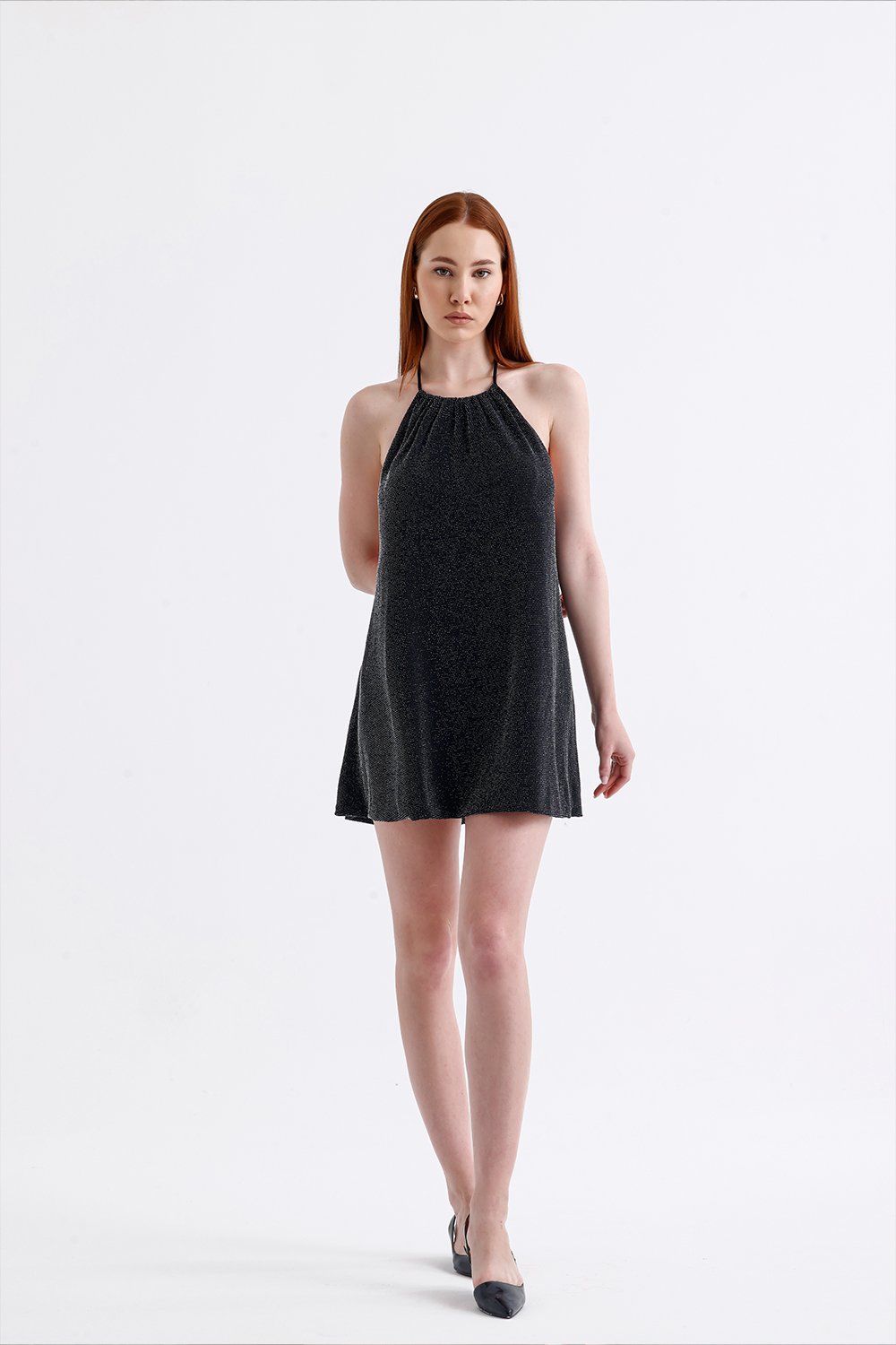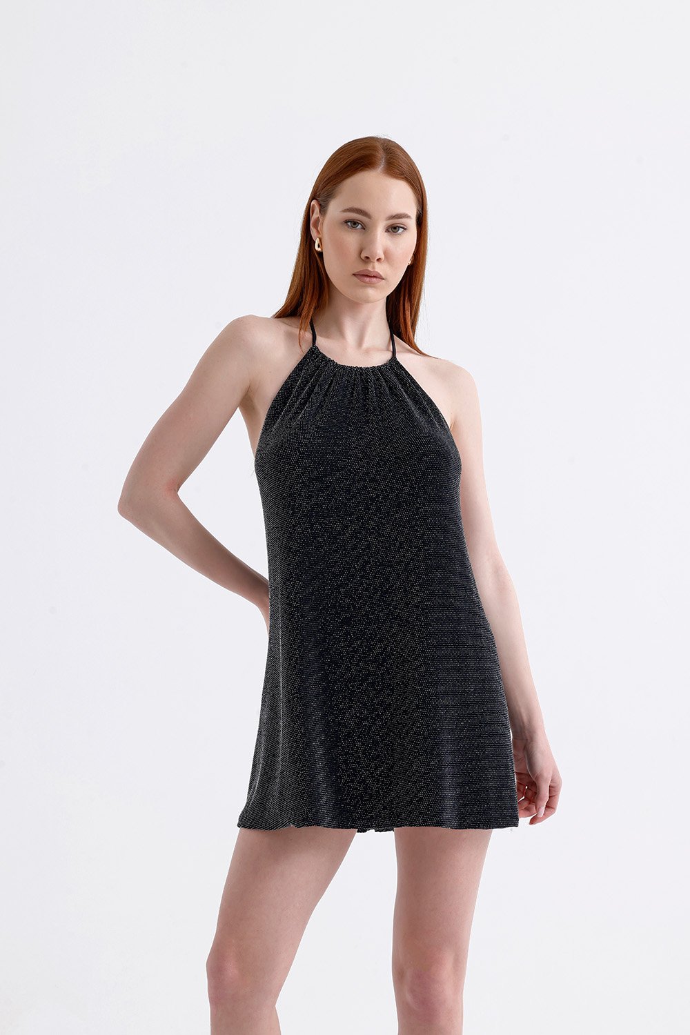 Luna Halka Detaylı Mini Elbise, zarif sırt dekoltesi ve dikkat çekici aksesuar detayıyla gündüzden geceye taşıyabileceğiniz özel bir stil sunar.