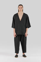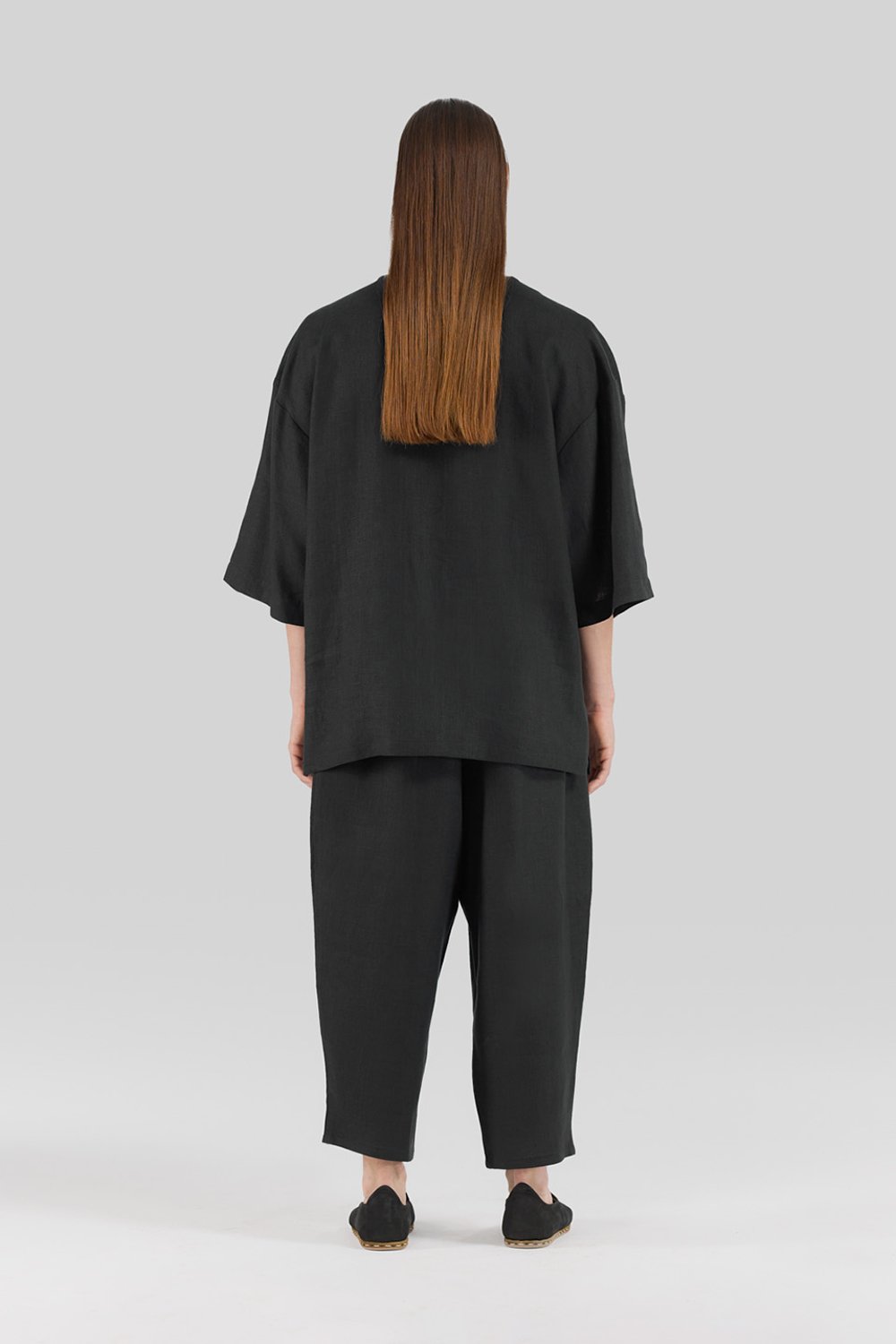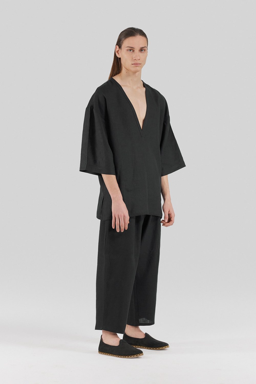 Siyah, oversize tişört. Ön tarafındaki derin “V” kesimi ve ince keten kumaşıyla minimalizmi ve cesareti bir arada sunar.