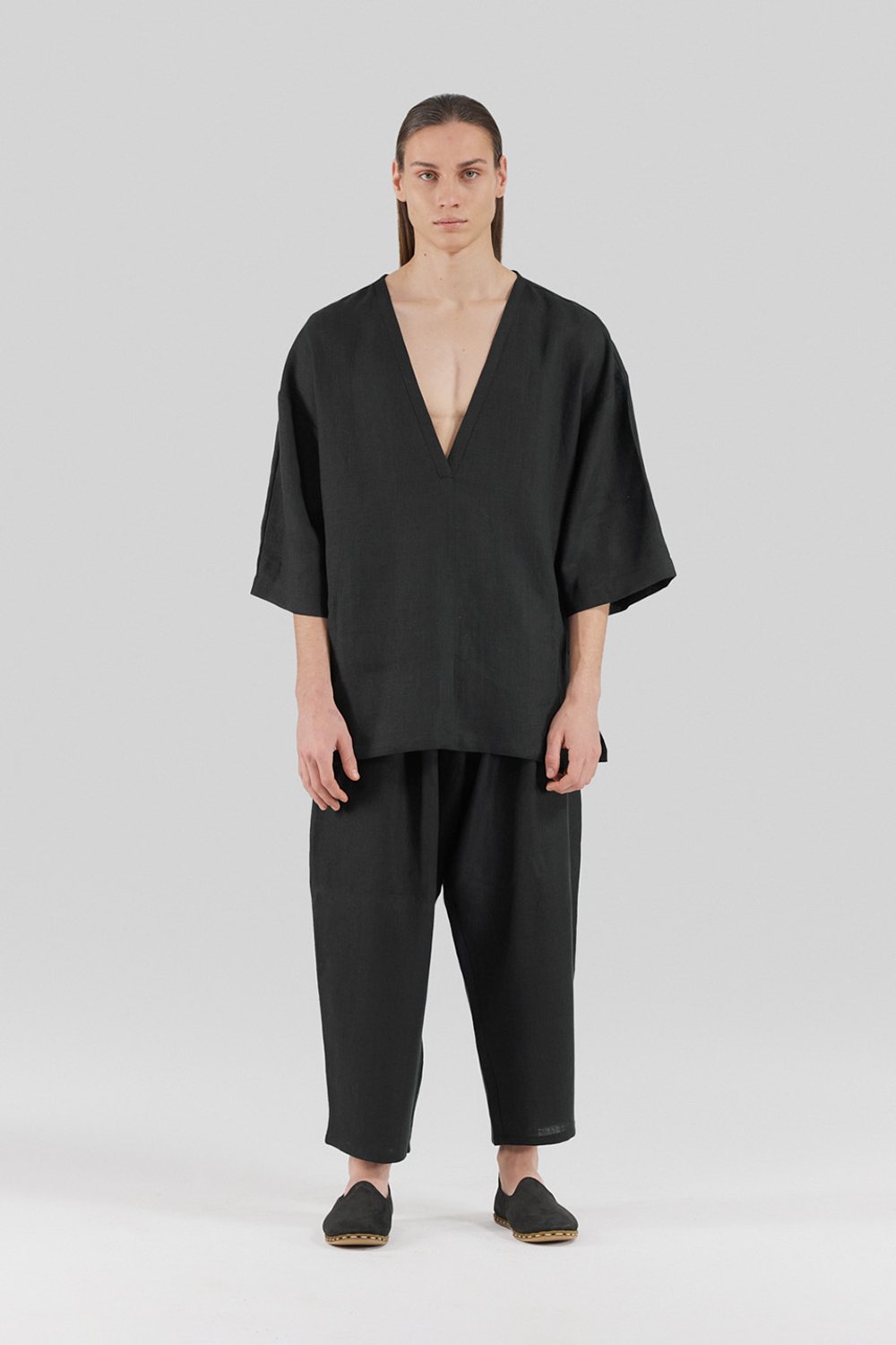 Siyah %100 Keten Derin V Yaka Oversized Erkek T-Shirt Model T 09