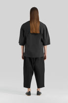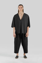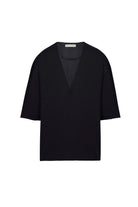 Siyah, oversize tişört. Ön tarafındaki derin “V” kesimi tasarımıyla minimalizmi ve cesareti bir arada sunar.