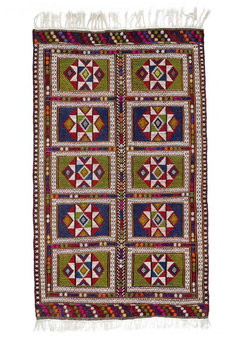 Zamanda yolculuğaçıkaracak, geleneksel kilim modelleri Soho Antiq ile sizlerle! Tamamen doğal yünile işlenen bu kilim modeli el dokuma ile hazırlanmıştır. Göz alıcı tasarımındabulunan renkler bordo, kırmızı, lacivert, yeşil, turuncu, pembe ve birçok renklere sahip özel bir kilimdir. Bu kilim cicim dokuma tekniği ile hazırlanmıştır. Cicim dokuma tekniğinde iğne ile işlenmiş gibi kabartmalar bulunmaktadır. Halı modelinde sizi etkileyen o tasarımın kaynağı, İç Anadolu’dangelen geleneksel dokunuşlardandır. Öte yandan 1980’lerin tüm karakteristiközelliklerini bu halı modelinde bulmak mümkün. Halının boyu 170 x 290 cm’dir vekalınlığı 1-3 cm arasındadır. Soho Antiq, halı modelleri ile yaşam alanınızafarklılık katar.