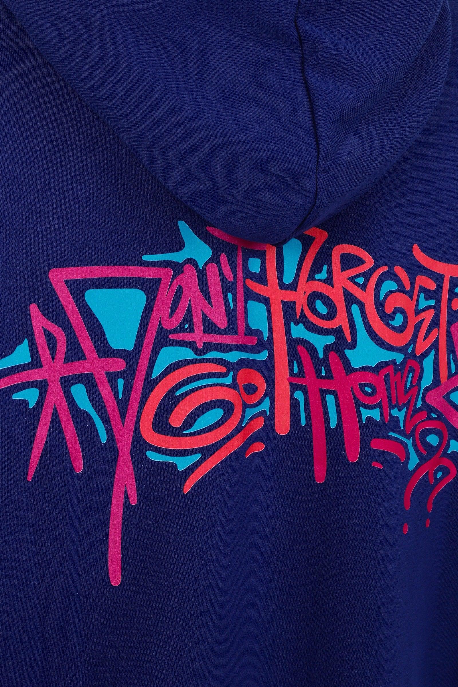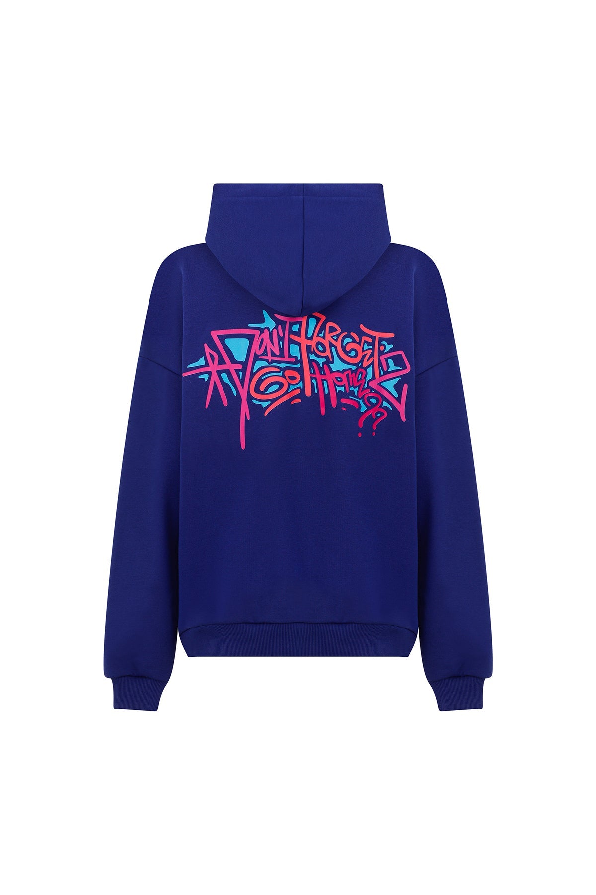 Blue long sleeved Vanessa Printed Hoodie with a the unique print design that reads "DON’T FORGET TO GO HOME?! ”, on the back. This hoodie goes cool with t-shirts, pants, shorts, bottoms, and printed leggings. Wear this item on windy, rainy, and cold days. Perfect for everyday wear, holiday, music festivals, and lots of fun!