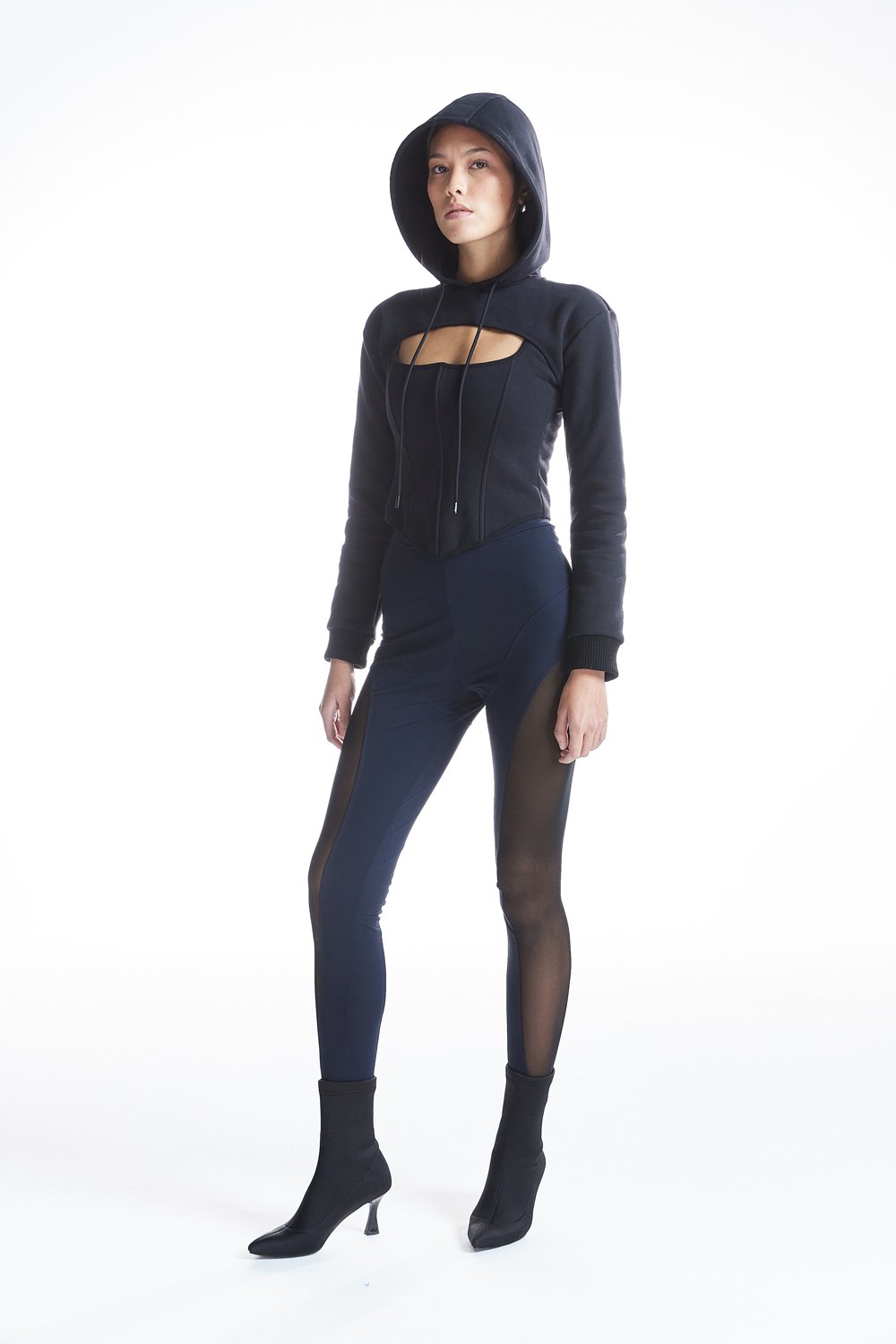 Korseli, Balenli, Göğüs Pencere Dekolteli, Fermuarlı, Kapişonlu, Uzun Kollu, Kordonlu, 3 İplik Hoodie.