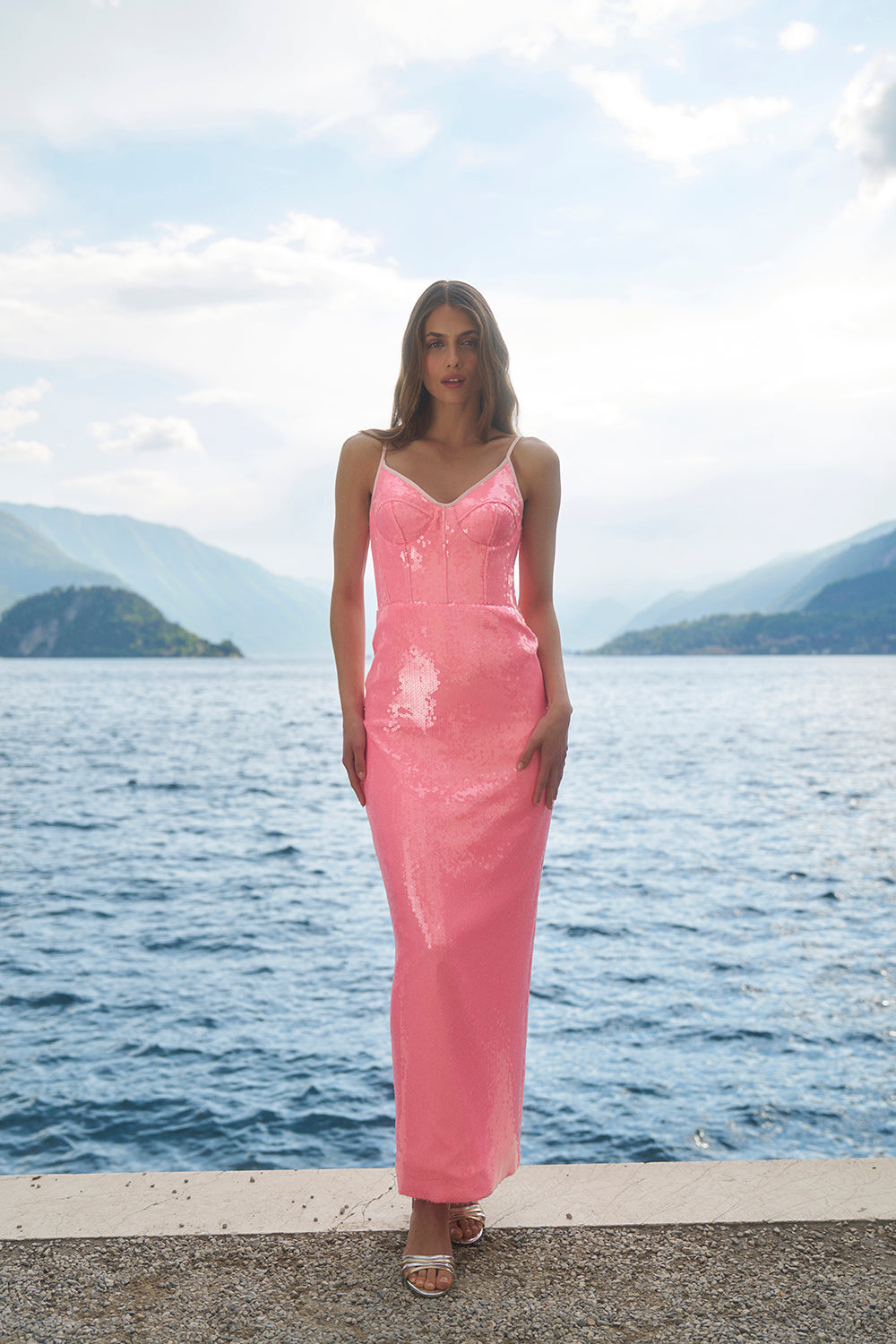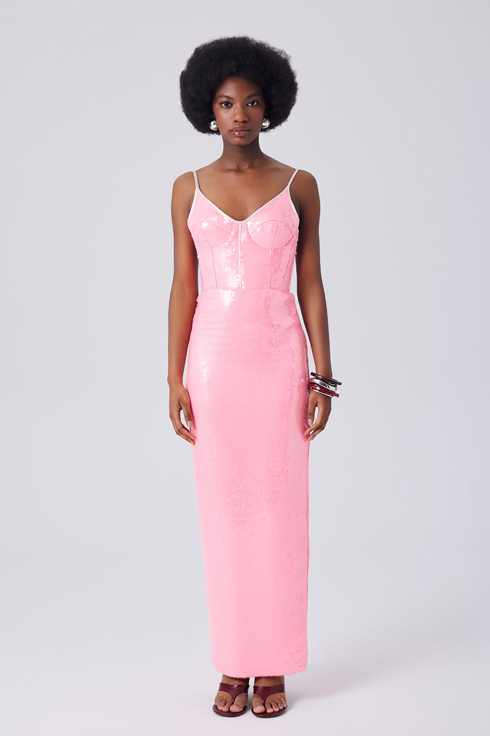 Neon pembe tonuyla öne çıkan bu elbise, payet detaylı bustiyer formundaki tasarımıyla dikkat çeker. İnce askılı yapısı zarif bir yaka hattı sunarken, vücuda oturan silueti feminen hatları belirginleştirir.