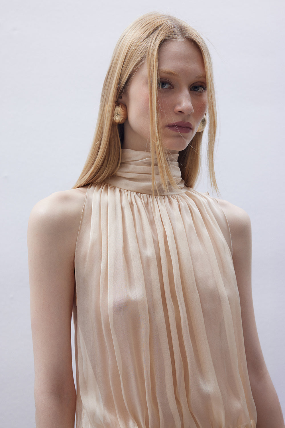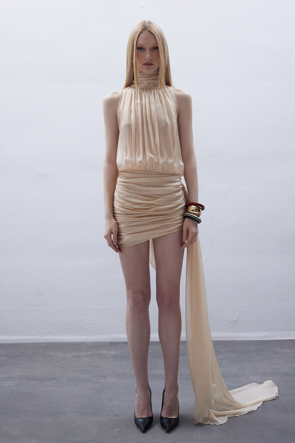İpek şifondan üretilen bu elbise, zarifçe dökümlenen bol üst kısmıyla akıcı bir siluet sunarken, kalça bölgesinde vücudu nazikçe sararak her adımda feminen ve zarif bir duruş yaratır. Eteğin yan tarafından süzülen özgün parça, tasarıma hareket ve incelik katar.