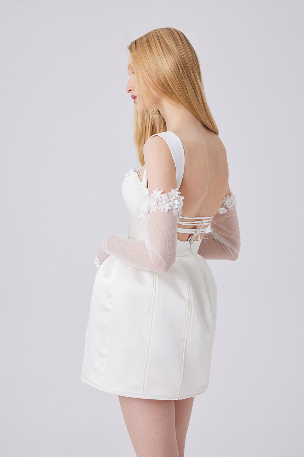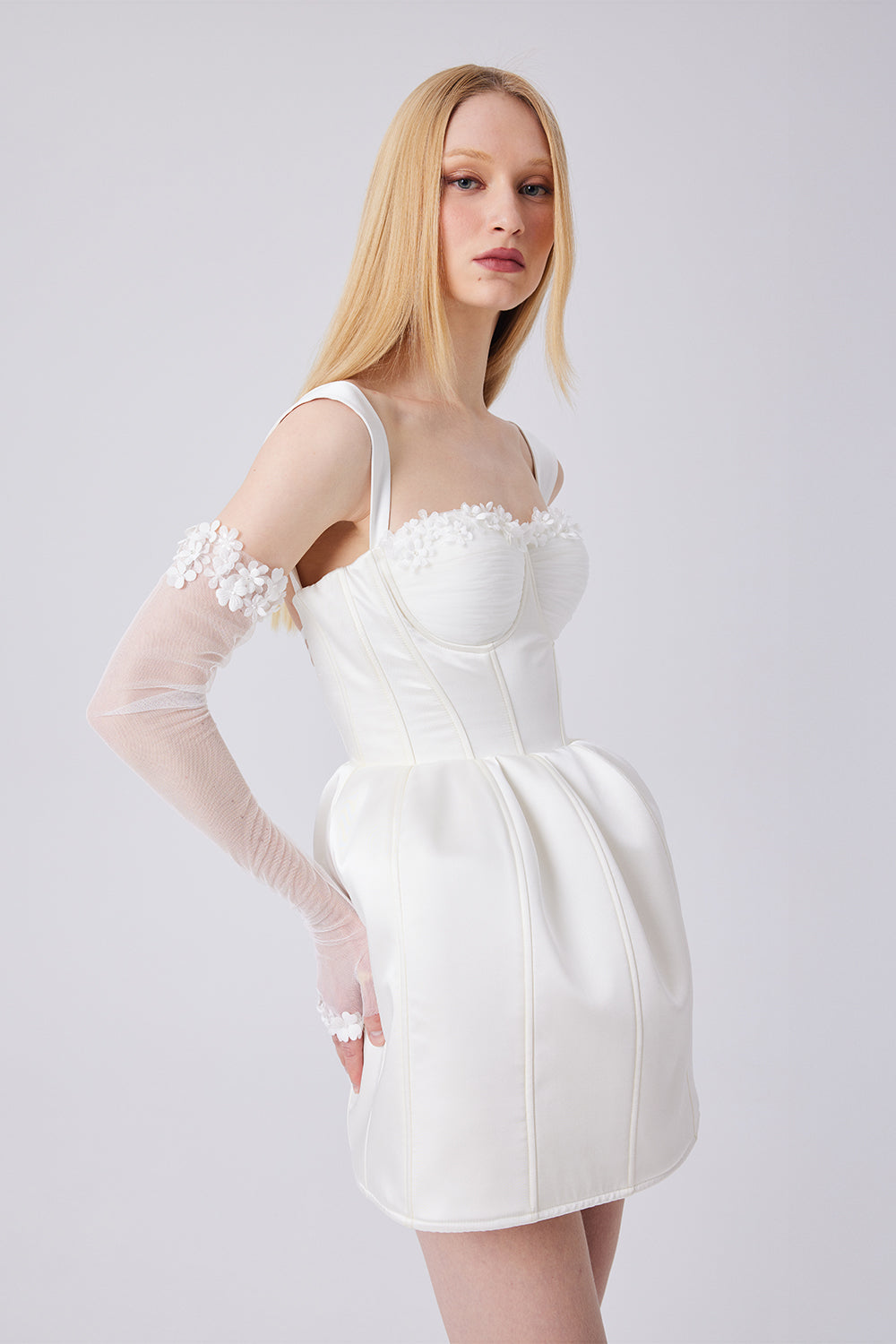 Giulia Elbise, bel vurgulu tasarımıyla form verilmiş mini eteğe kusursuz bir geçiş yaparak dengeli ve feminen bir siluet sunar. Etek formu, üst bedenin zarif çizgileriyle uyum sağlarken; üç boyutlu çiçek detayları tasarıma romantik bir dokunuş katar. Transparan tül eldivenler ise görünüme sofistike ve incelikli bir tamamlayıcılık sunar.