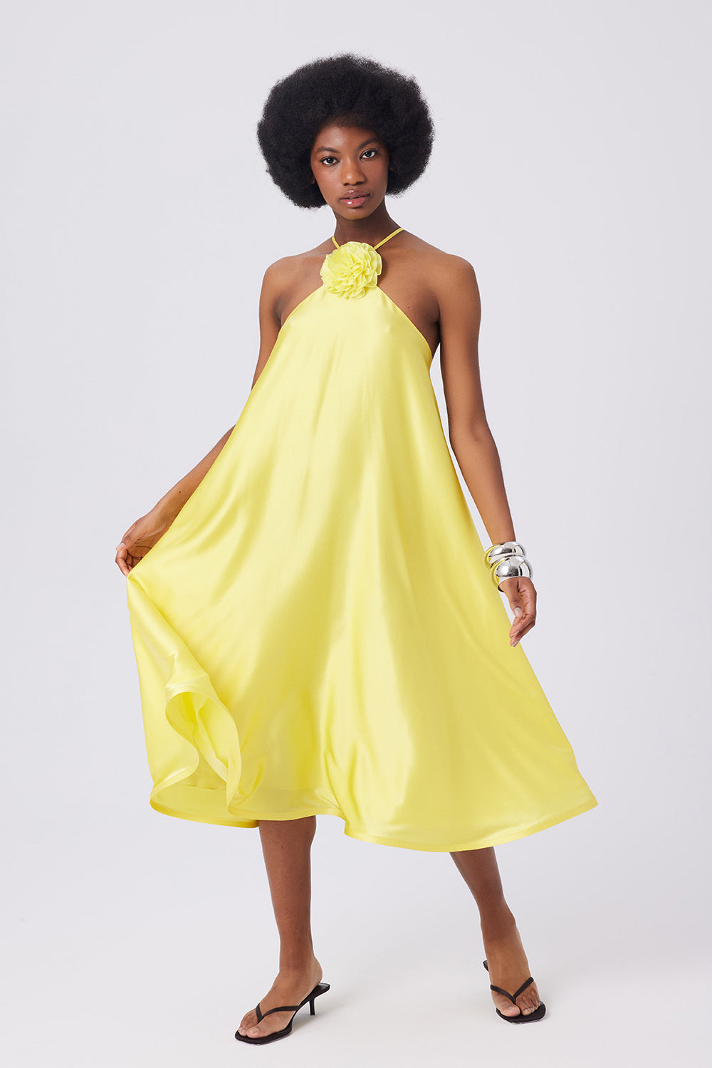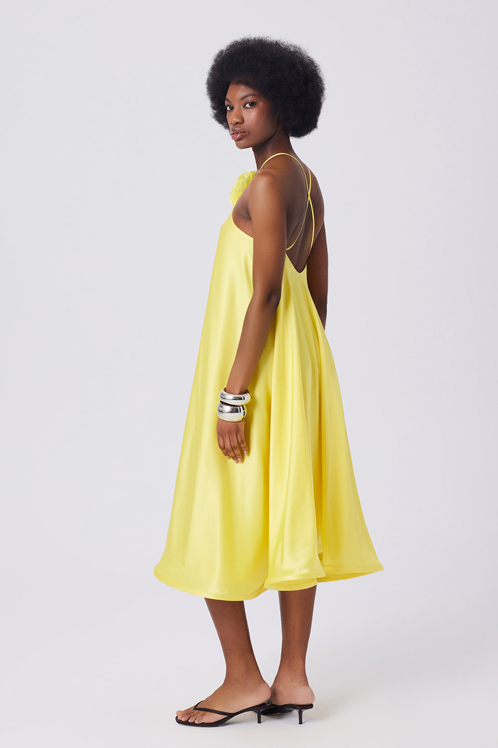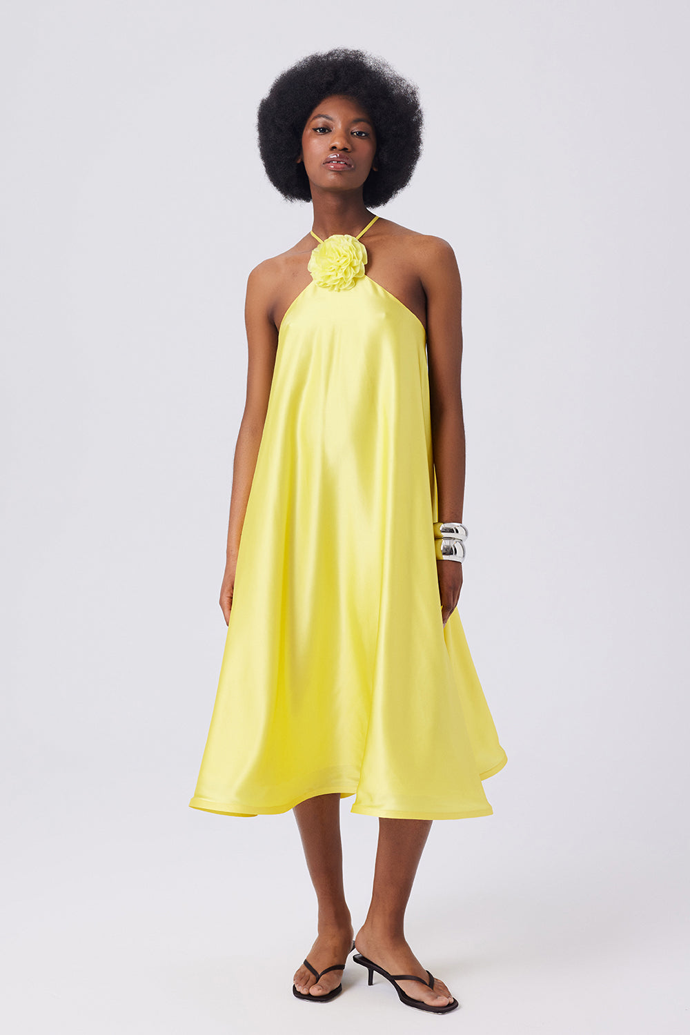 Liora Midi Elbise, zarif A-kesim eteğiyle tasarlanmıştır; her hareketinizde akıcı bir şekilde dalgalanarak feminen ve zarif bir siluet oluşturur. Midi boyu tasarıma sofistike bir dokunuş katarken, yüksek kaliteli ipek kumaşıyla incelikli bir şıklık sunar.