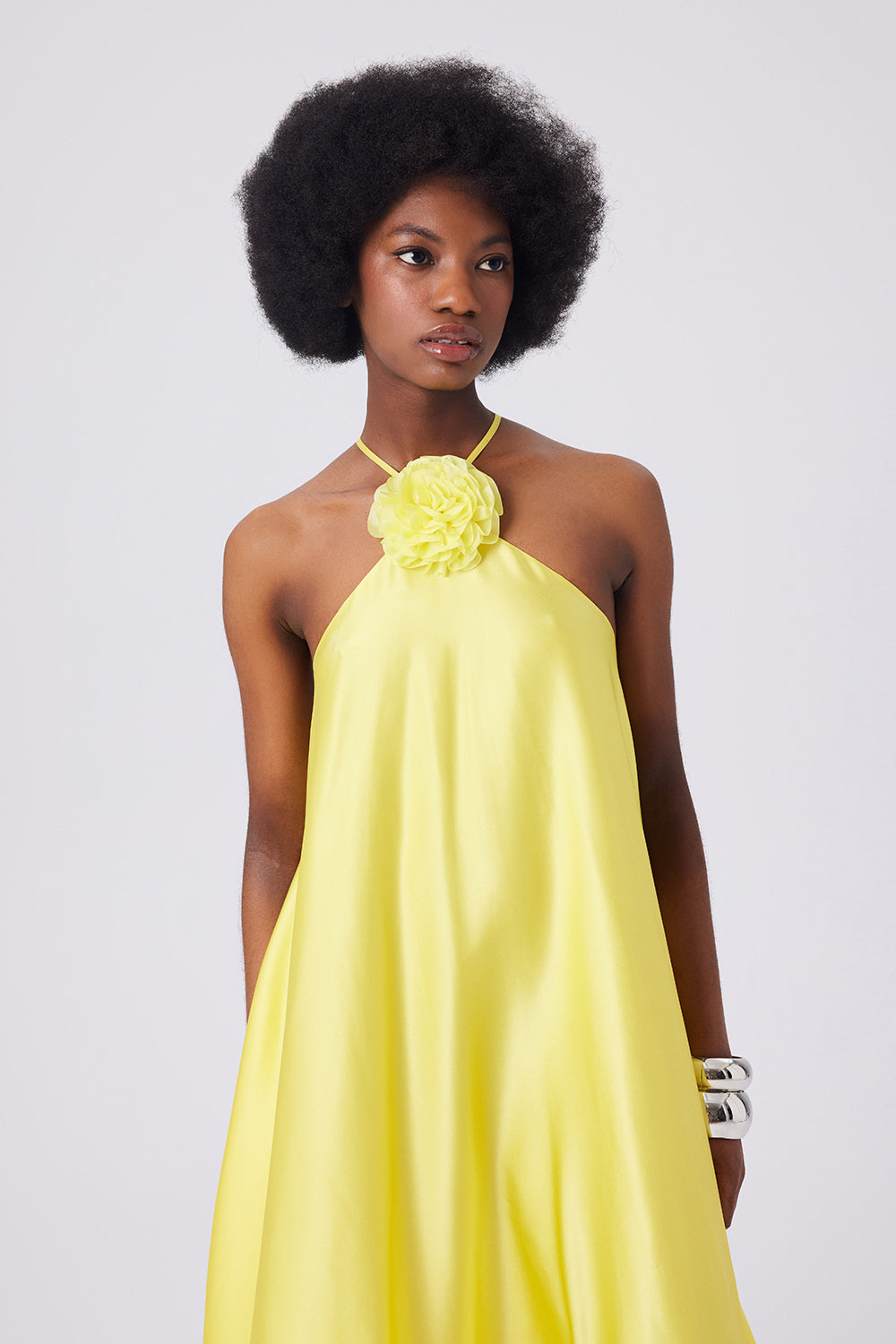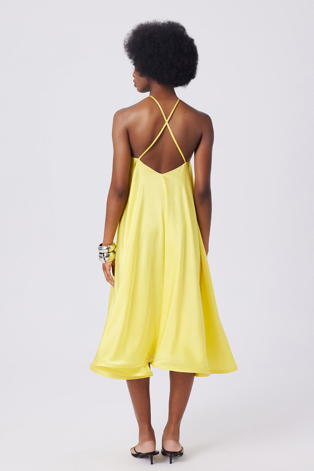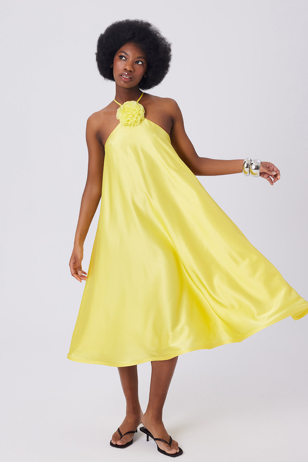 Liora Midi Elbise, zarif A-kesim eteğiyle tasarlanmıştır; her hareketinizde akıcı bir şekilde dalgalanarak feminen ve zarif bir siluet oluşturur. Midi boyu tasarıma sofistike bir dokunuş katarken, yüksek kaliteli ipek kumaşıyla incelikli bir şıklık sunar.