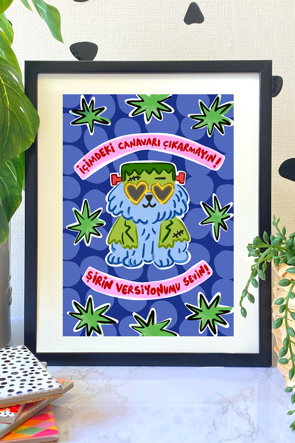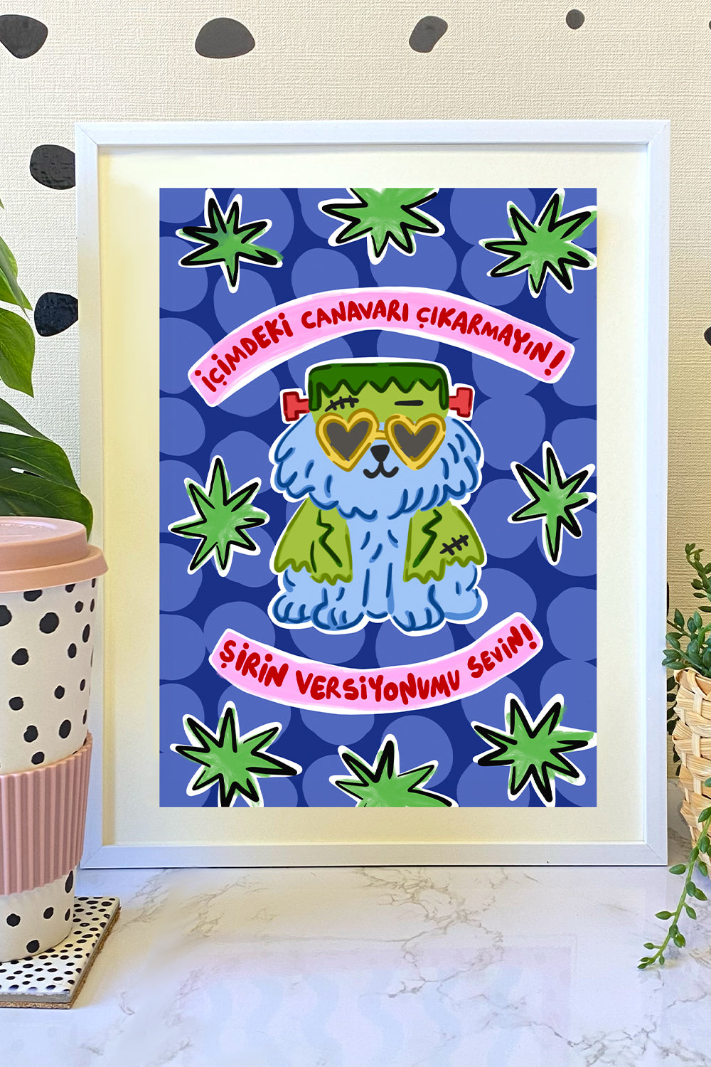 “İçimdeki canavarı çıkarmayın, şirin versiyonumu sevin!” - Retro çizim tarzı ve esprili mesajıyla bu baskı, hem eğlenceli hem de dekoratif bir parça. Canavar karakterin kalp gözlükleriyle verdiği komik mesaj, duvarlarınıza neşe katacak. Ev dekorasyonunda dikkat çeken, pozitif enerji saçan bir detay arıyorsanız tam size göre!Özellikler: