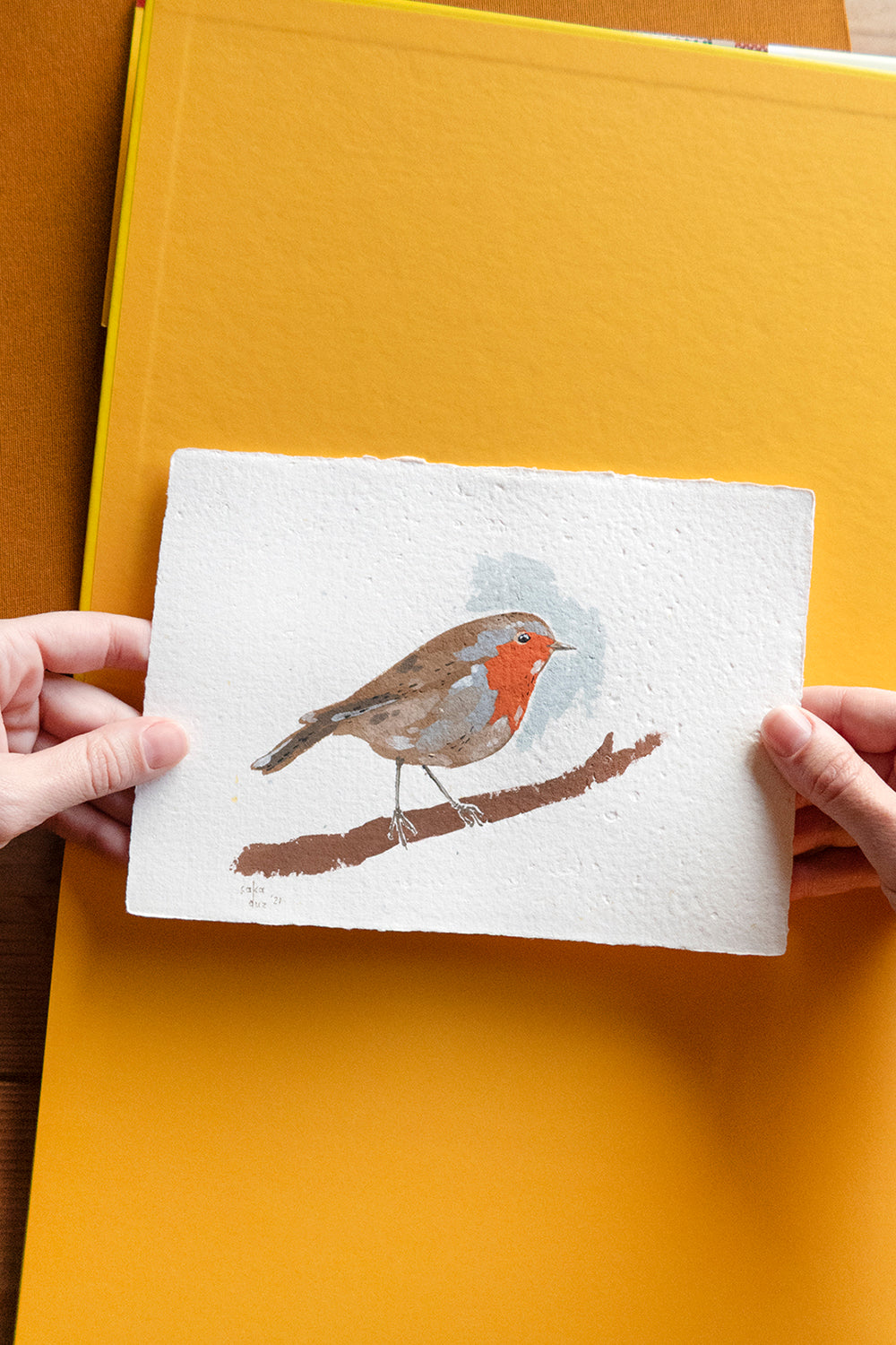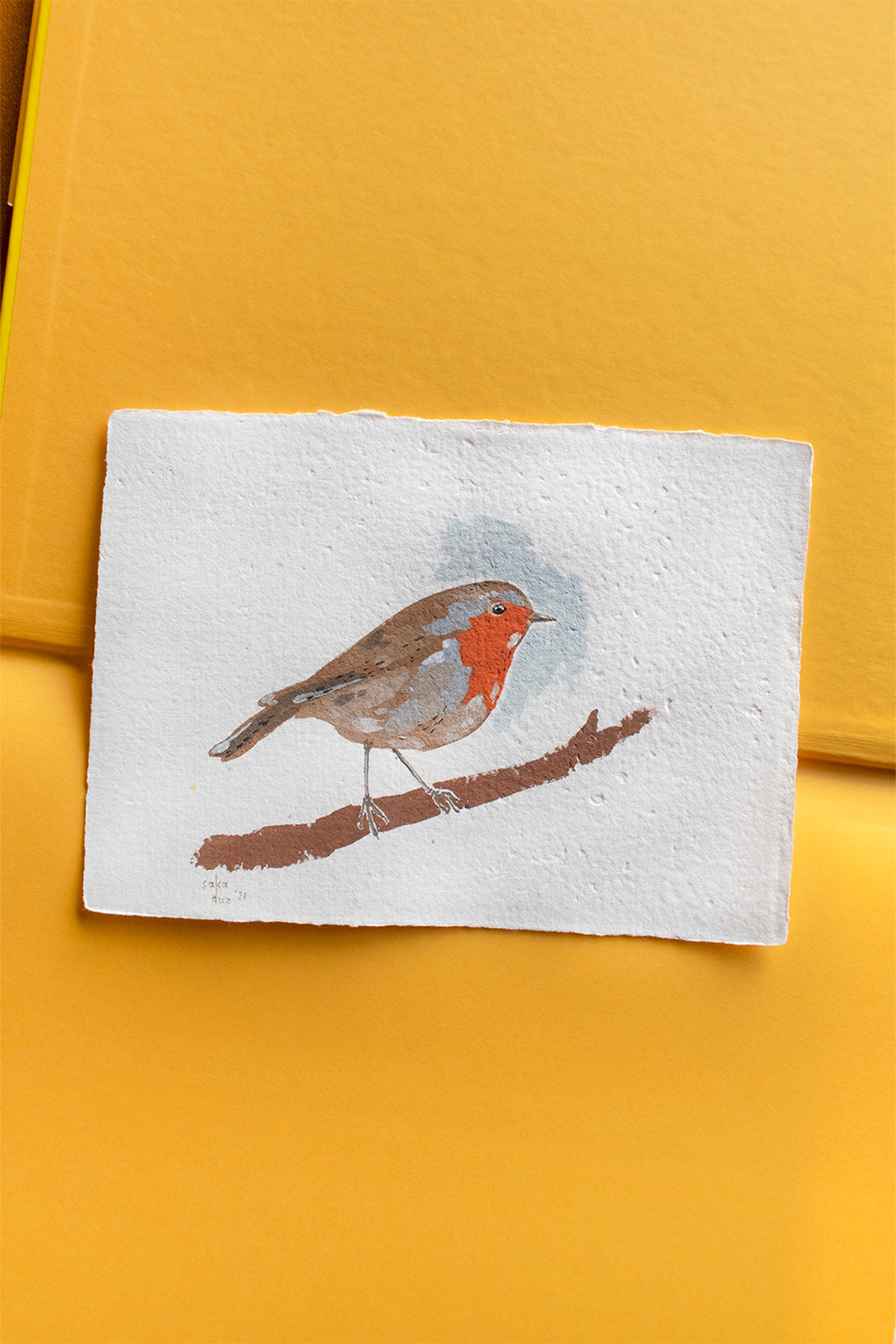 * Geri dönüştürülmüş el yapımı kağıt üzerine guaj resim.