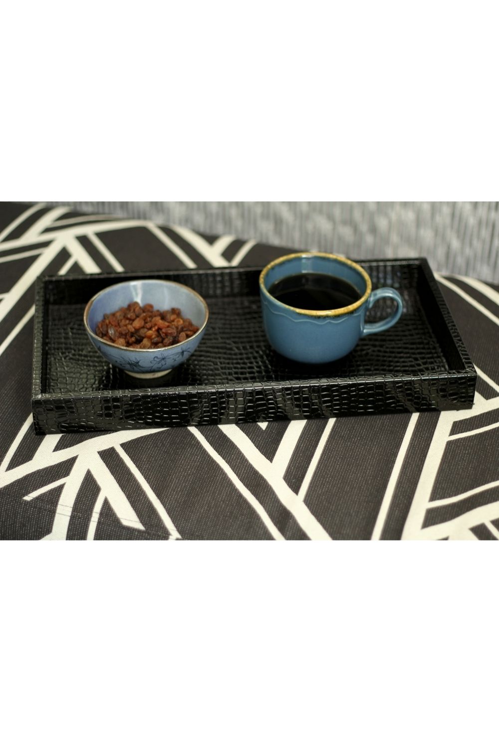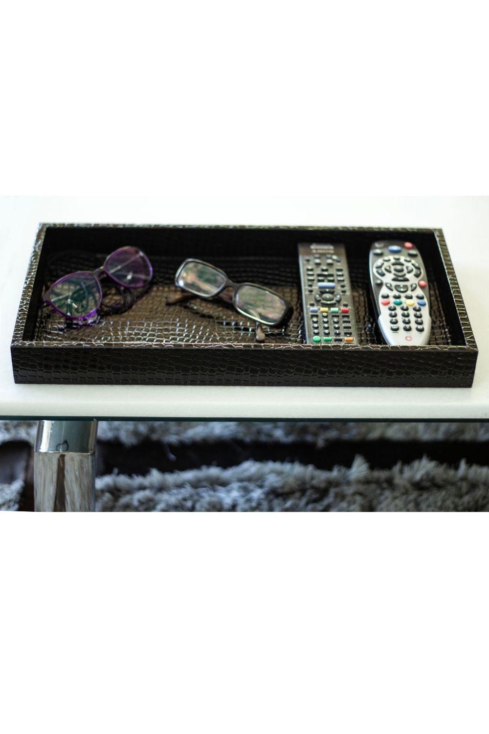 dokusu ve lüks krokodil deseniyle öne çıkan bu büyük boy suni deri tepsi, hem