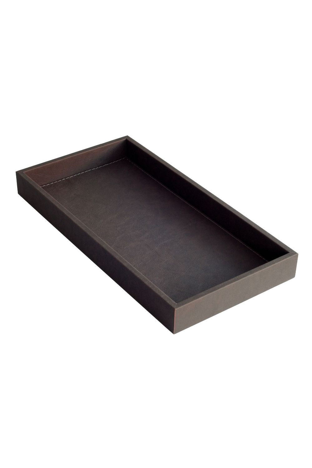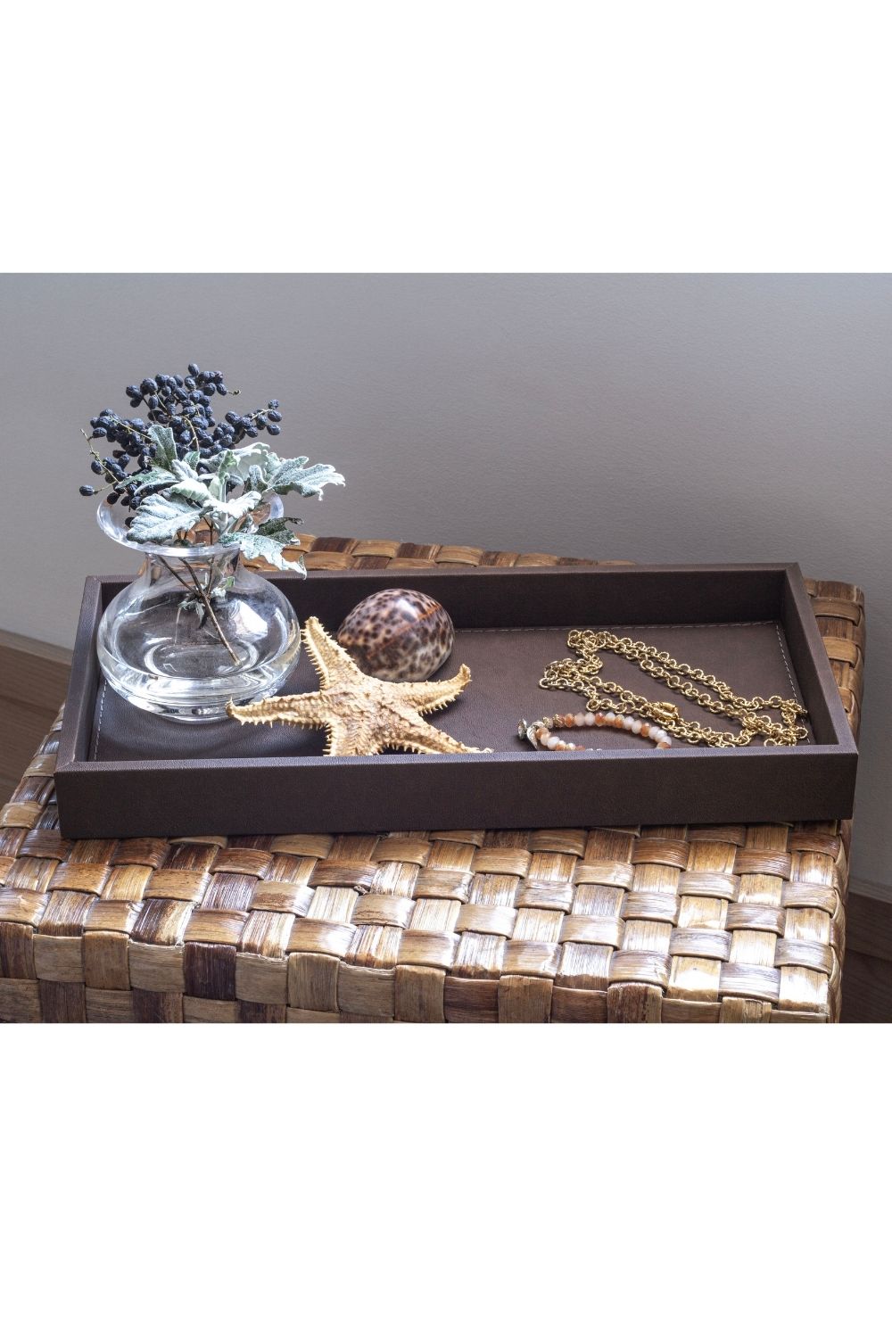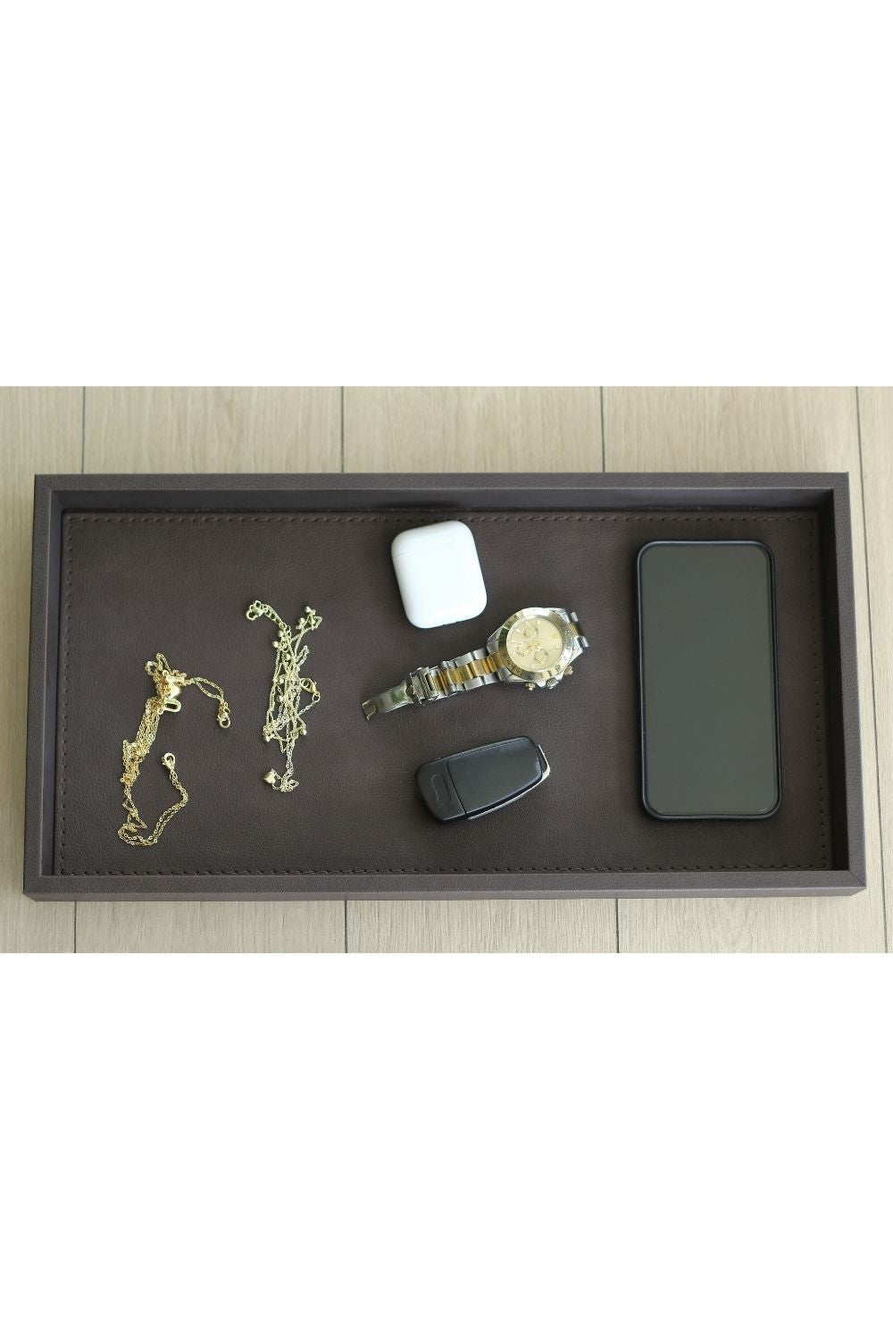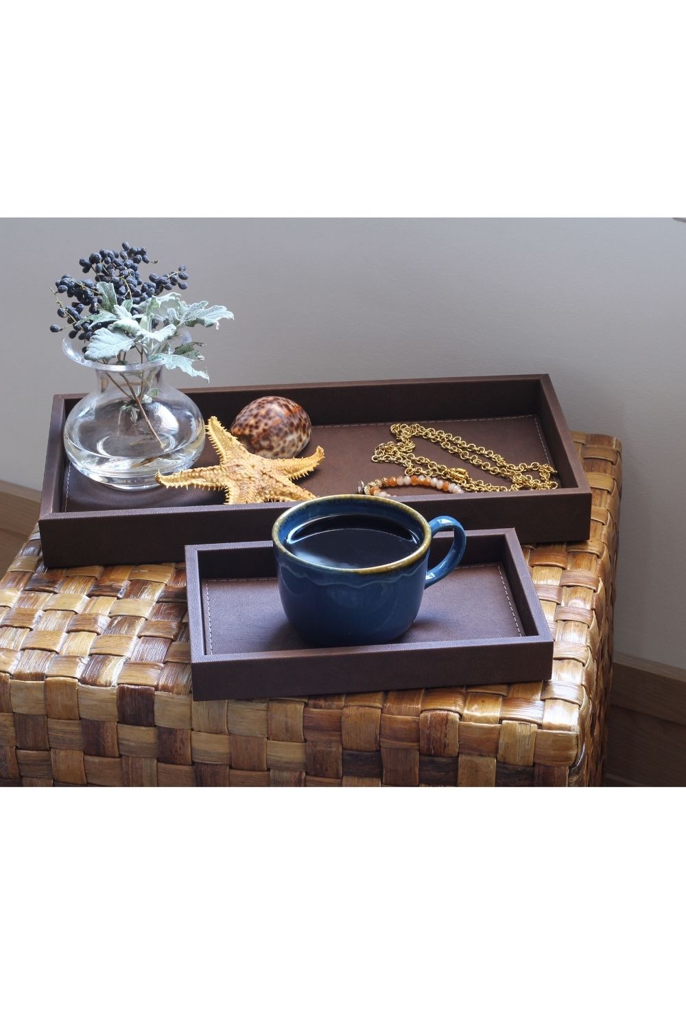kahve tonuyla dikkat çeken bu büyük boy suni deri tepsi, zarif tasarımıyla hem