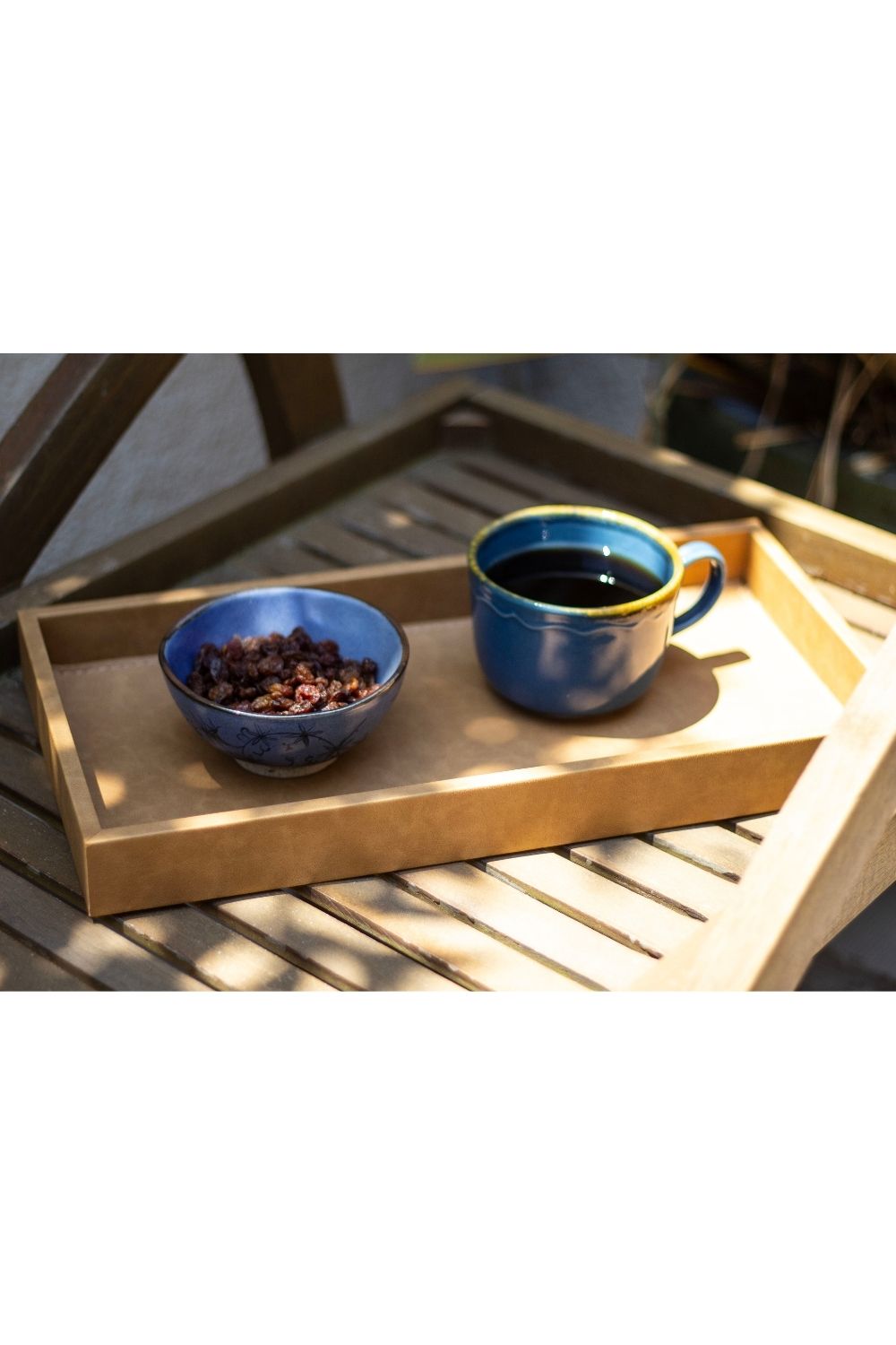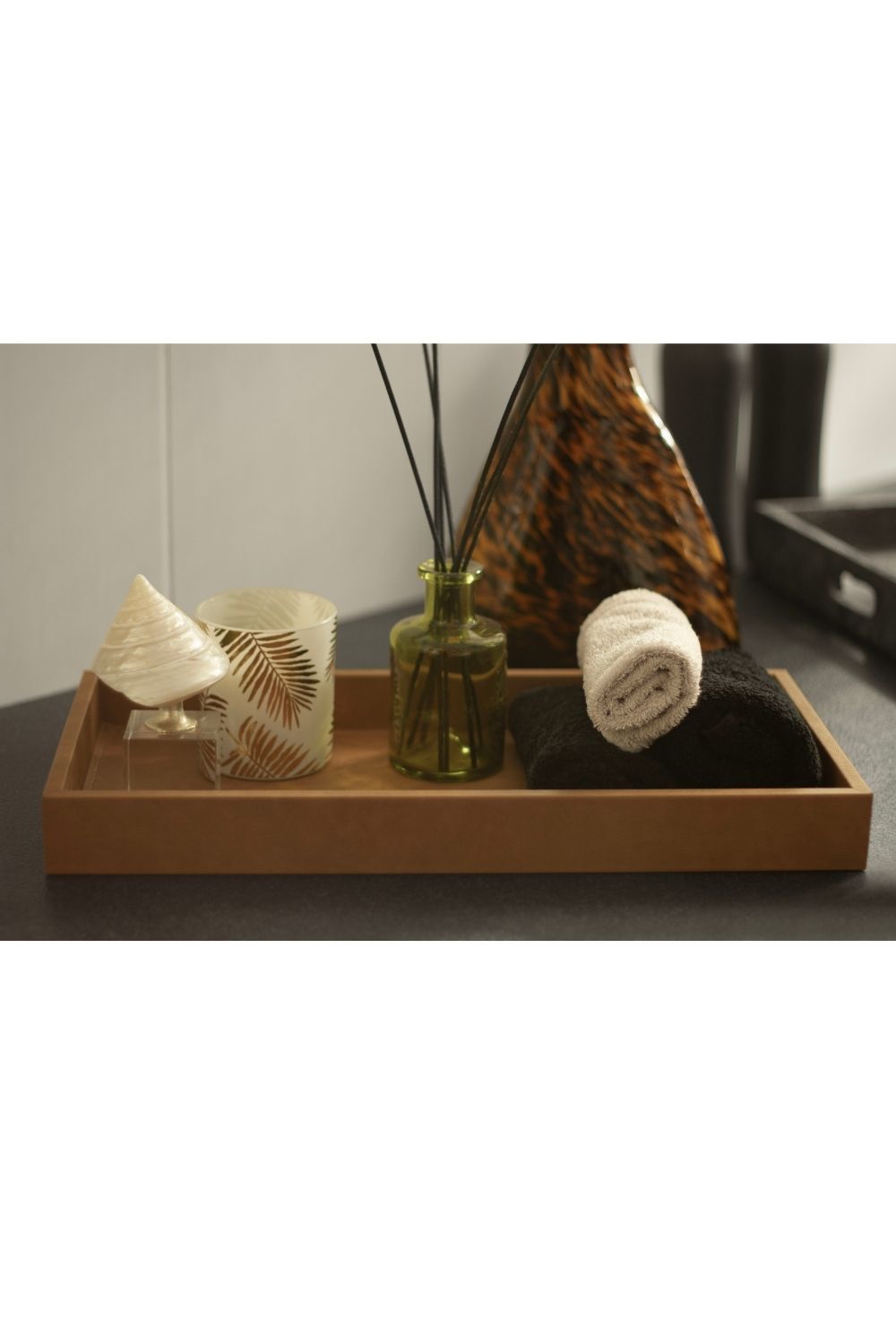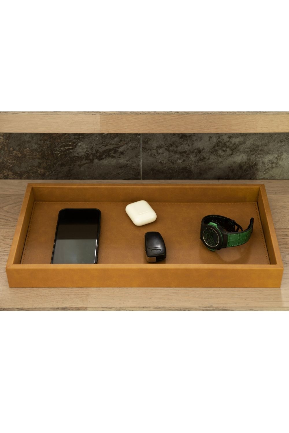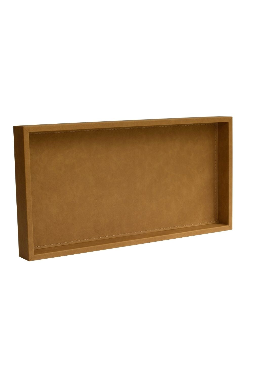 tonuyla öne çıkan bu büyük boy suni deri tepsi, zarif tasarımıyla hem dekoratif